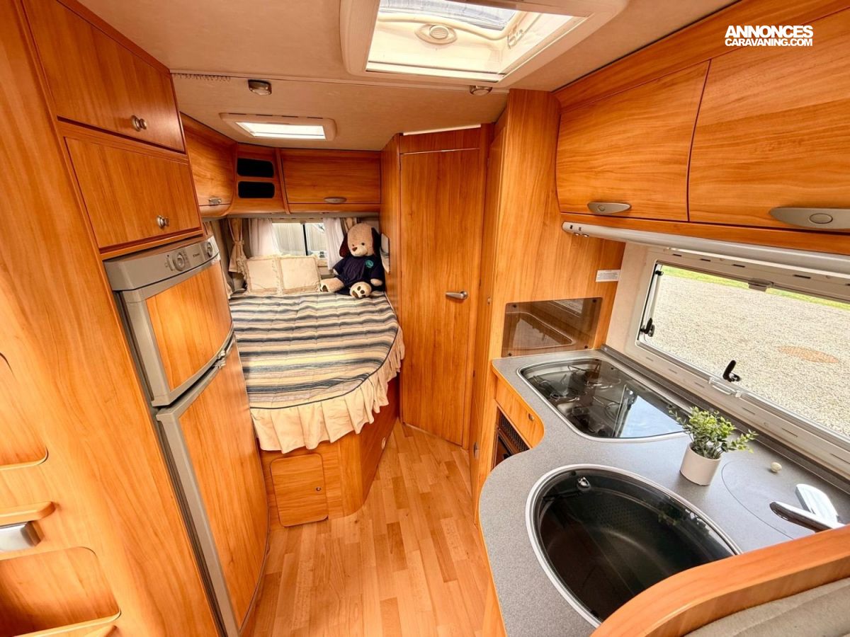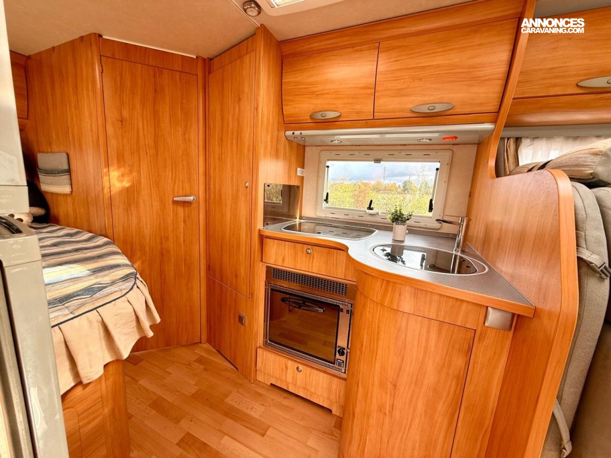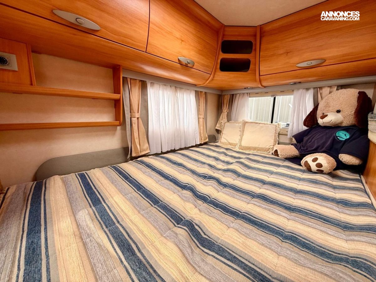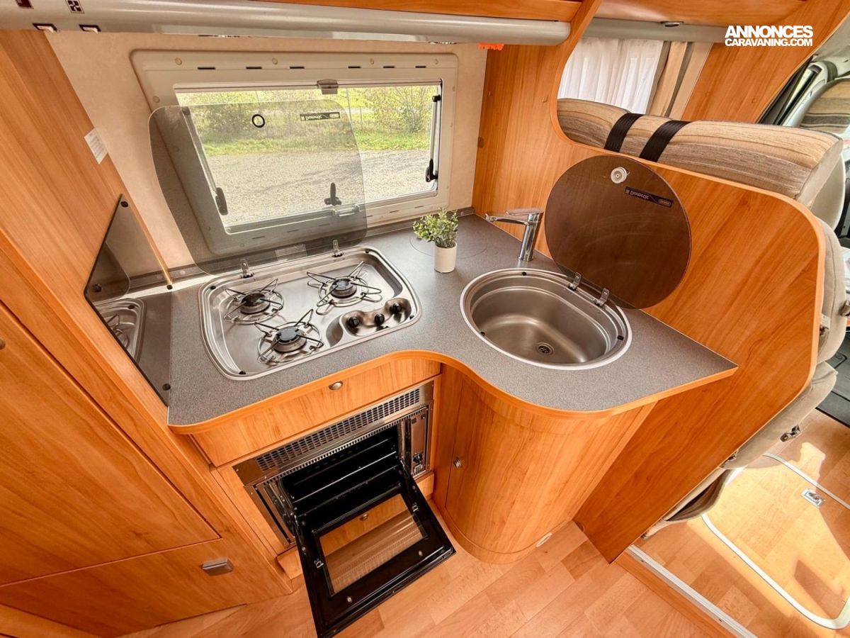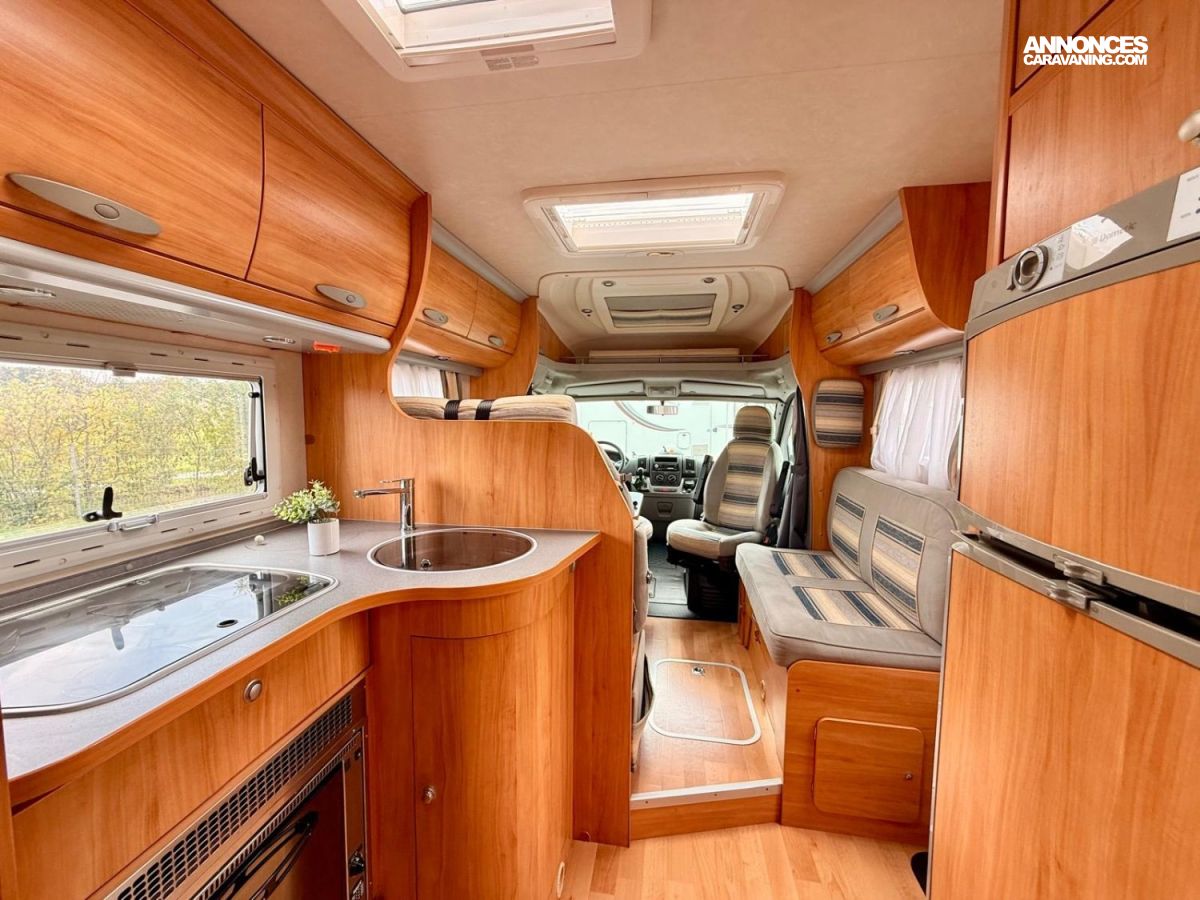 Sièges avant pivotant, Banquette Face à la route + Banquette latérale double, Dinette murale, Cuisine spacieuse en L comprenant gaz 3 feux, réfrigérateur en vis à vis 141 litres trimixte, salle de bain avec douche et wc séparés en enfilade, Lit à la française sur soute et Lit dinette.