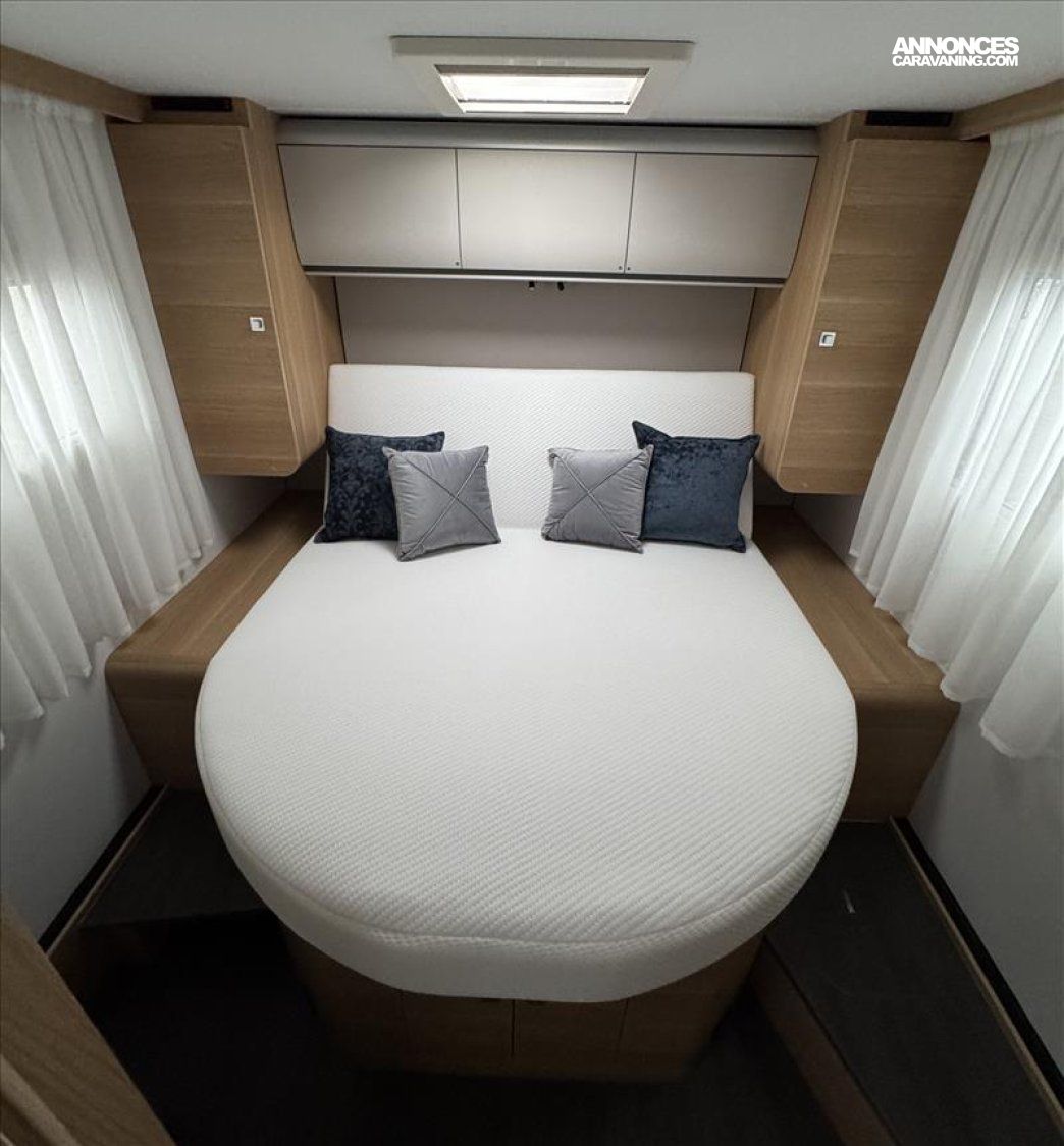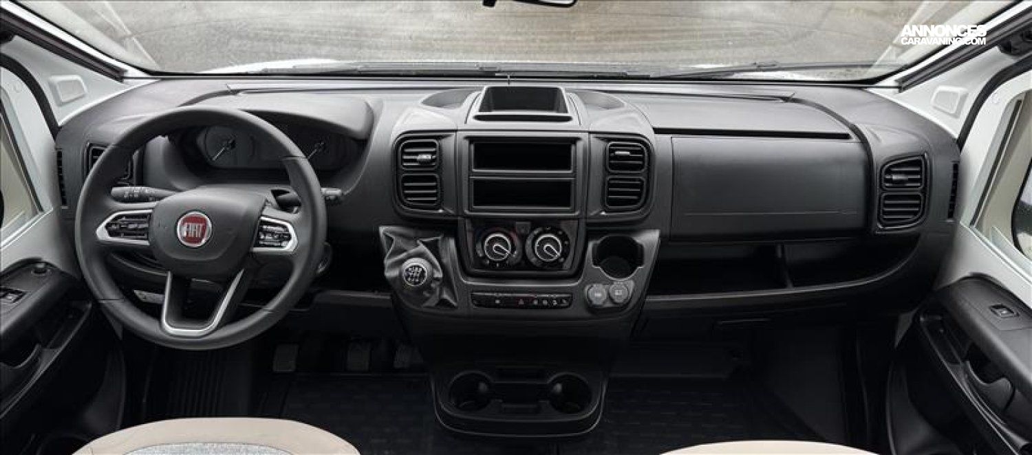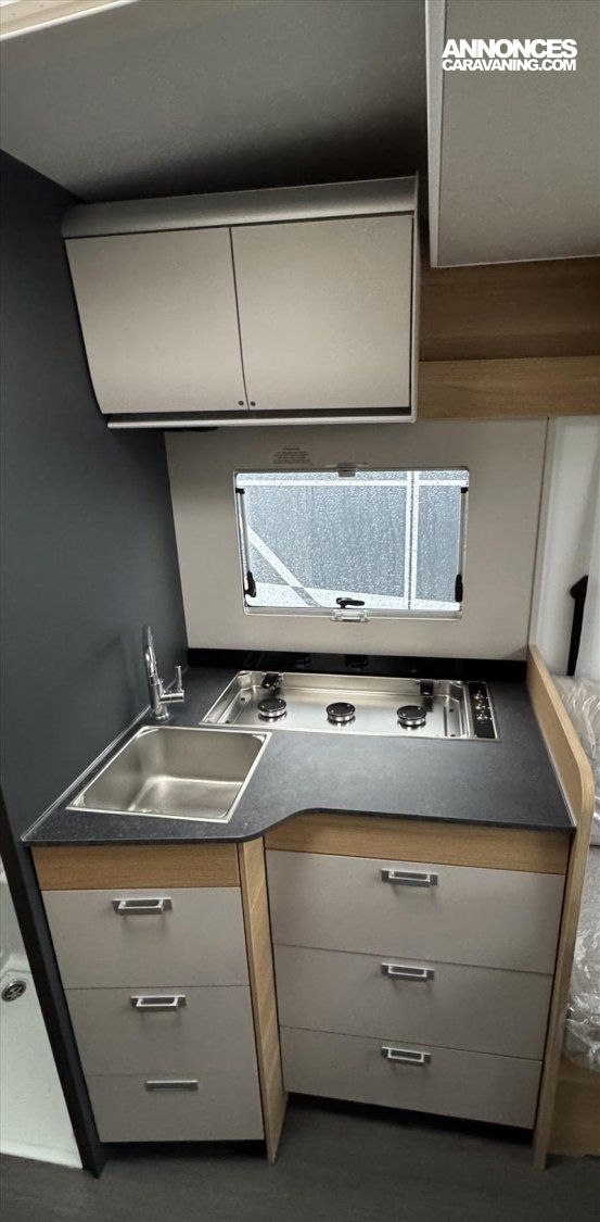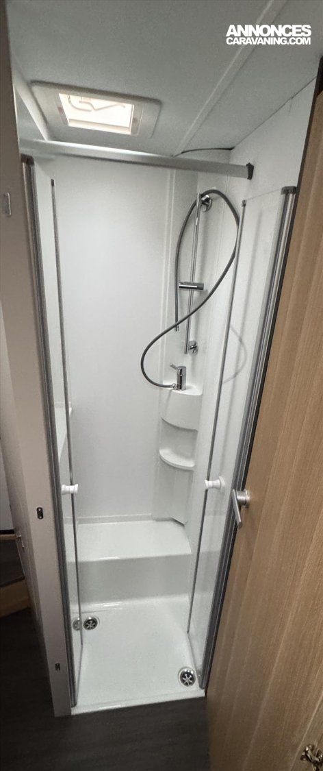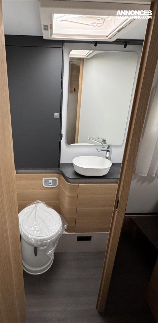 Réfrigérateur 142 L, Porte cellule avec moustiquaire, Porte cellule centralisée et vitrée, Radar de recul, Tête de lit arrière coulissante, Reservoir carburant 90L, Stores occultants en cabine, Suspension pneumatique, Parois cellule en polyester, Bas de caisse aluminium, Lit de pavillon électrique, Hotte en cuisine, Chauffage/chauffe eau Truma combi 6, Plancher plat, Vanne des eaux usées électrique