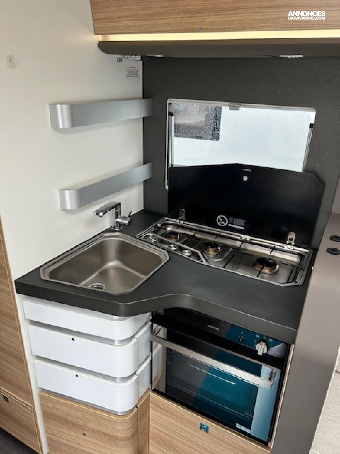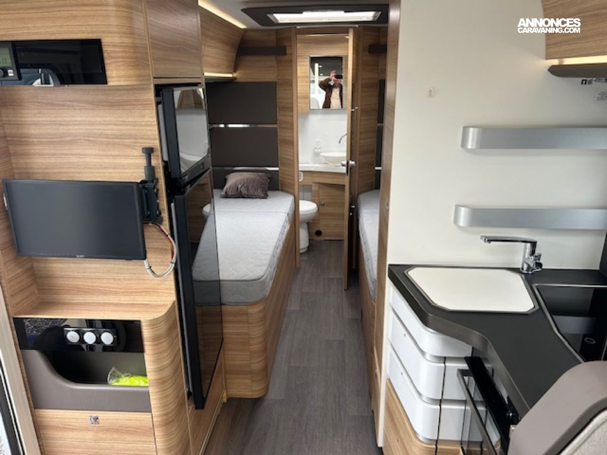 Eclairage 100% LED - Jantes alu 16 pouces - Suspensions AR pneumatiques – Attelage – Four - Hotte aspirante – réfrigérateur tri-mixte 167L - Mono control gaz – Sièges cabine « Captair chair » Stores en cabine de conduite –