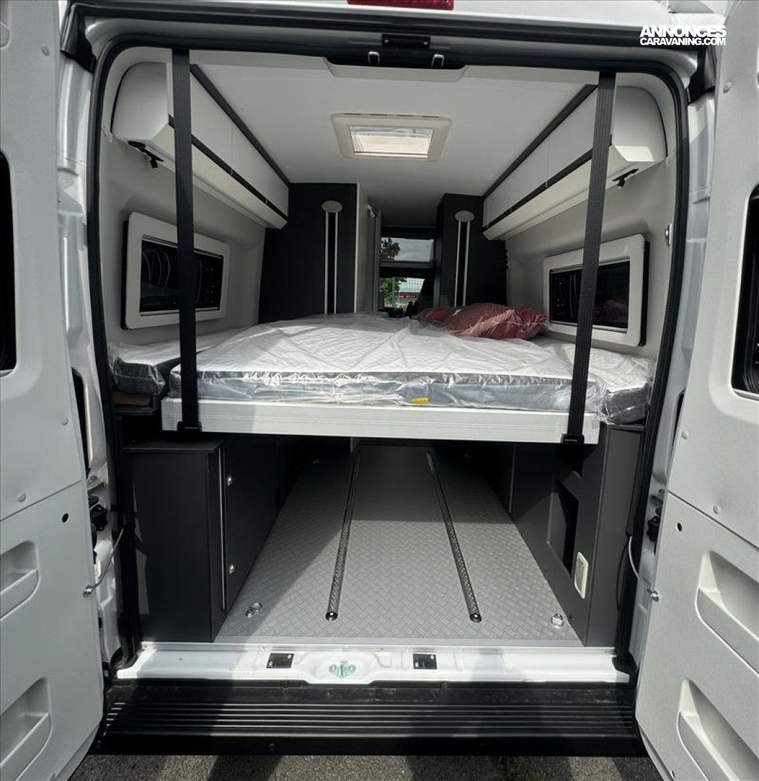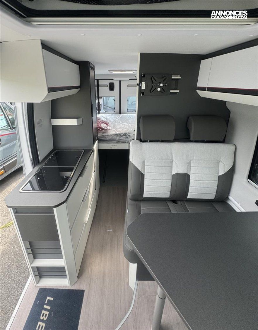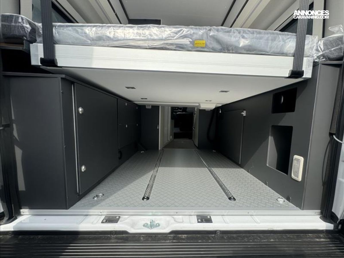 Grâce à son lit arrière électrique escamotable, vous bénéficiez d’un vaste volume de soute en journée, parfait pour ranger vélos, matériel de camping ou équipements sportifs. Le grand coin salon avec sièges pivotants offre un espace convivial pour se détendre, travailler ou partager un repas à l’étape.