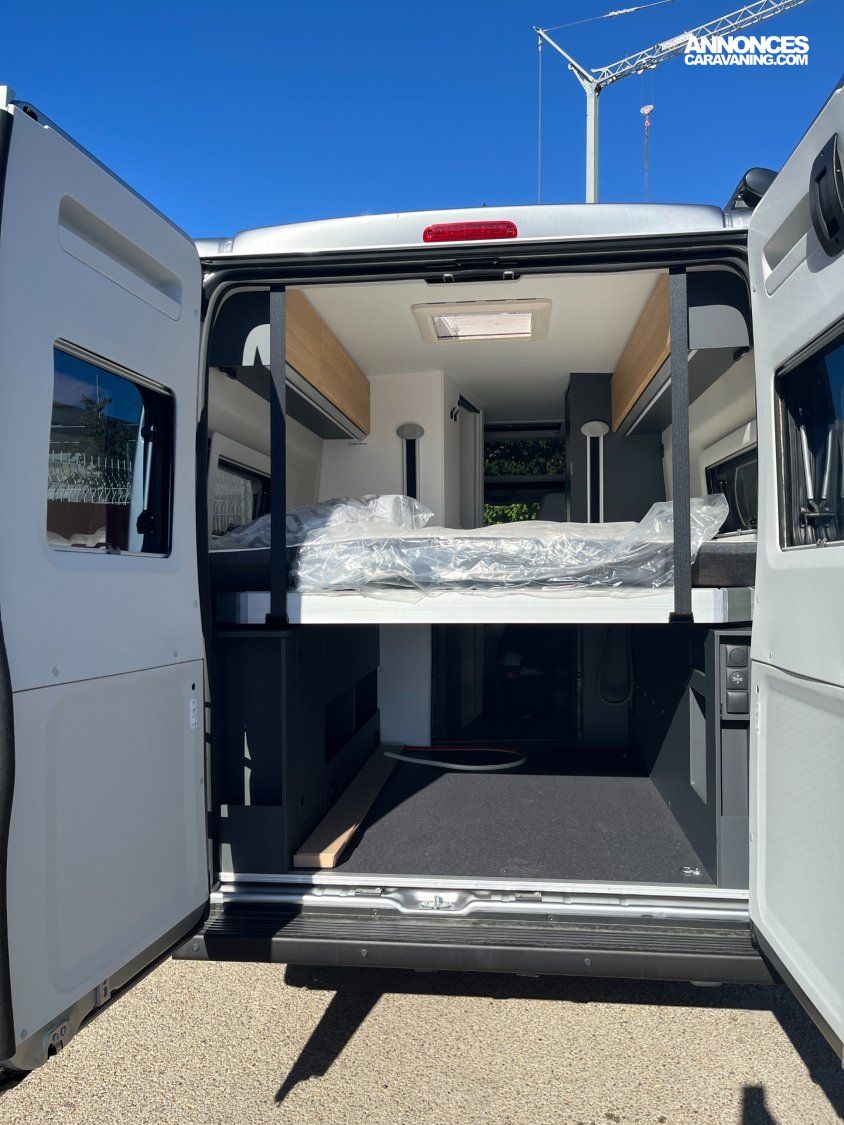 Équipements de série : réfrigérateur, moustiquaire de porte, réservoir eaux usées isolé et chauffé.