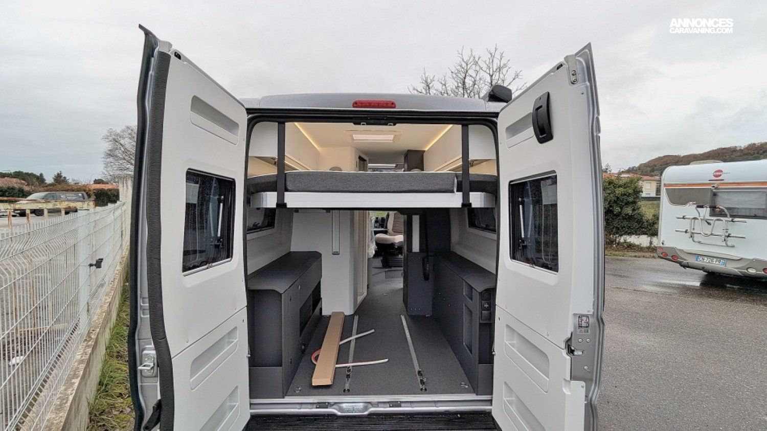 Adria Twin Supreme 640 SGX tarif 2025, un fourgon aménagé sur Fiat 2.2 140 cv en boîte auto avec lit arrière transversal sur soute réglable électriquement, salle d'eau duplex avec douche séparée, cuisine équipée avec grand frigo/congel de 138 litres et maxi salon face/face avec sièges pivotants.