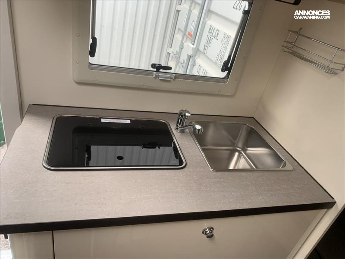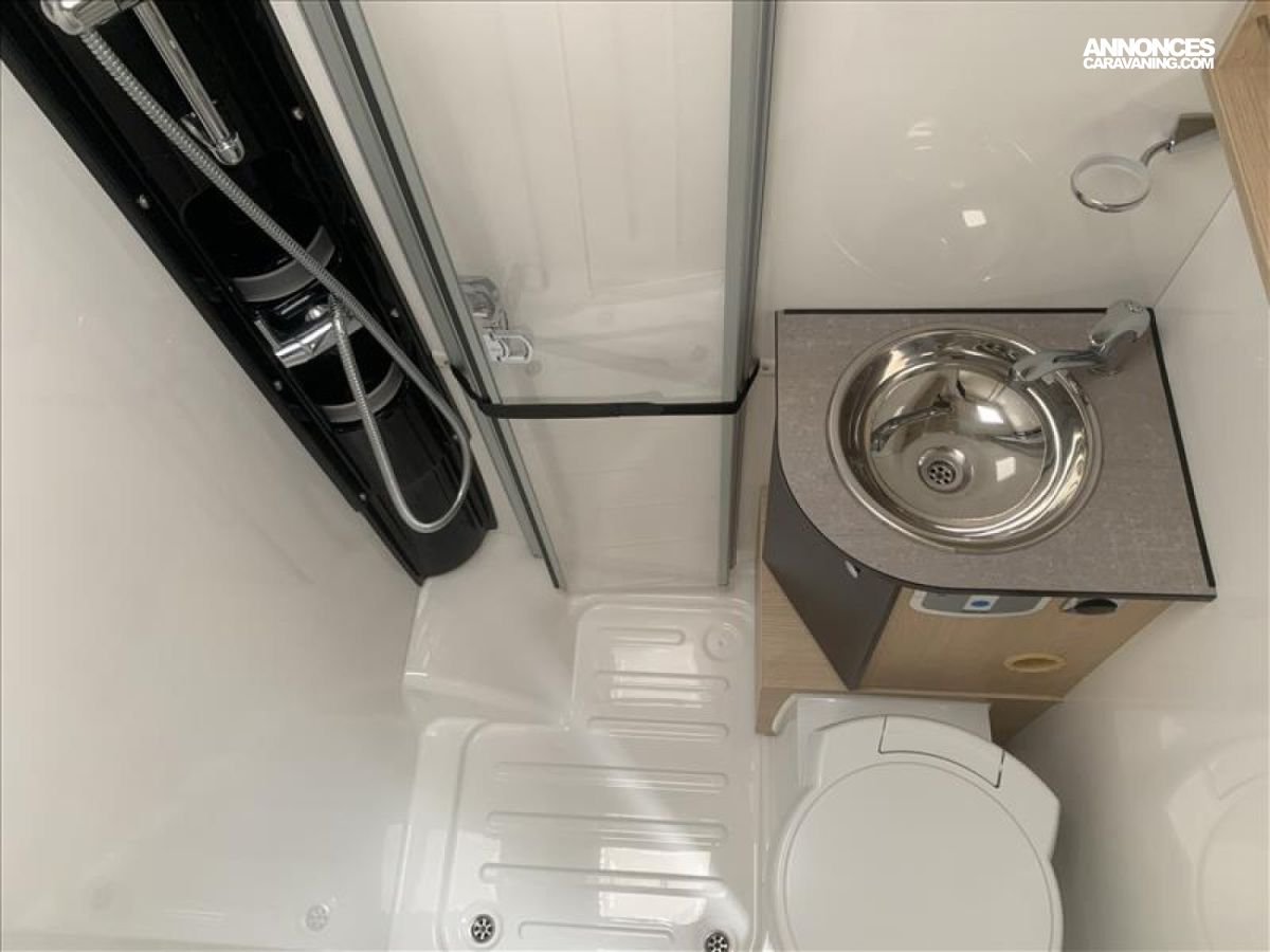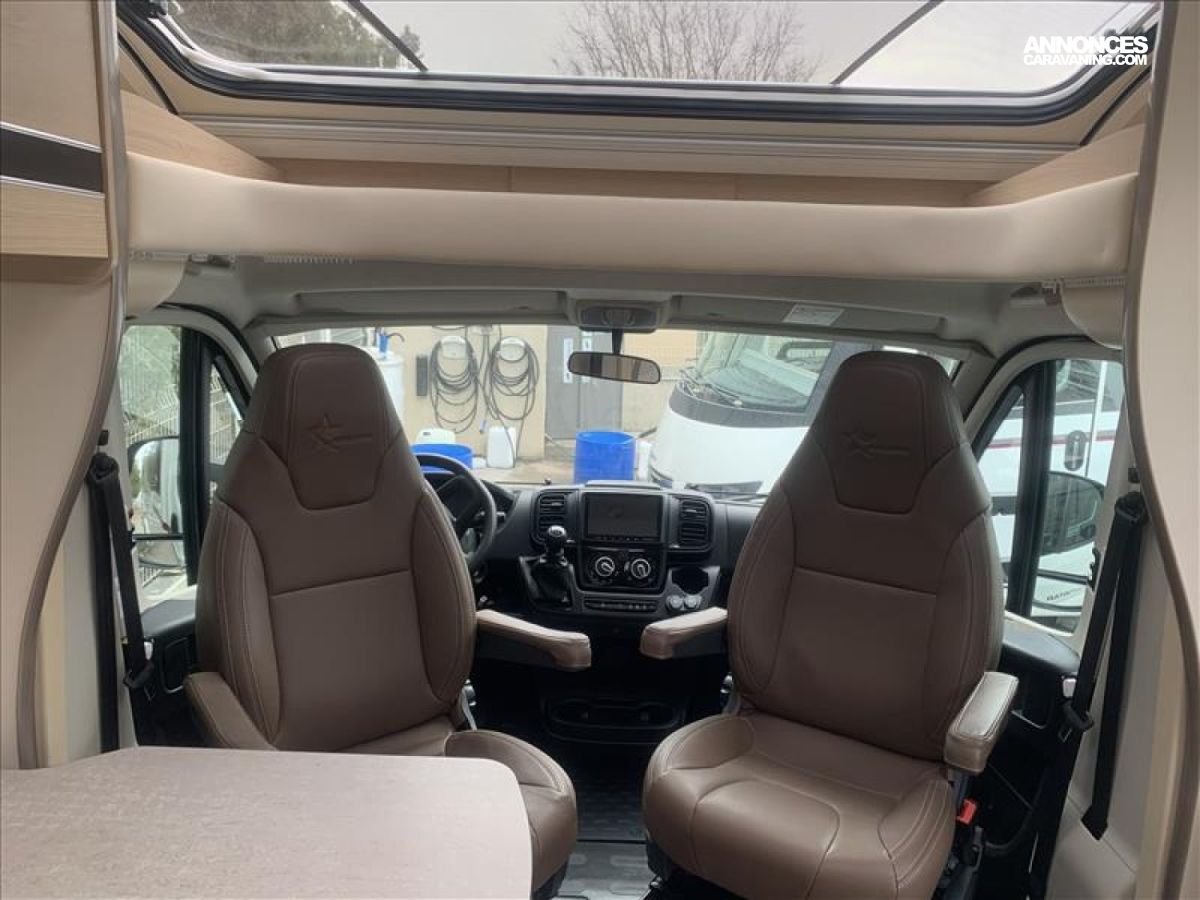 La 1ère impression qui se dégage en entrant dans le camping-car, c’est l’ambiance lumineuse et contemporaine grâce aux teintes claires et contrastées du mobilier et aussi grâce aux nombreuses ouvertures : baies, lanterneaux et même un skyview de série.