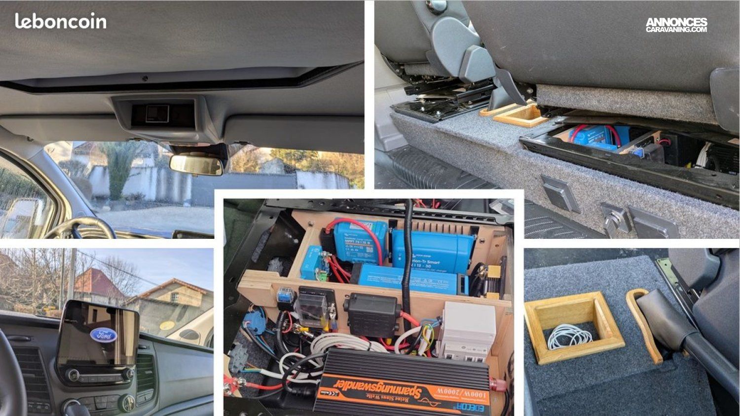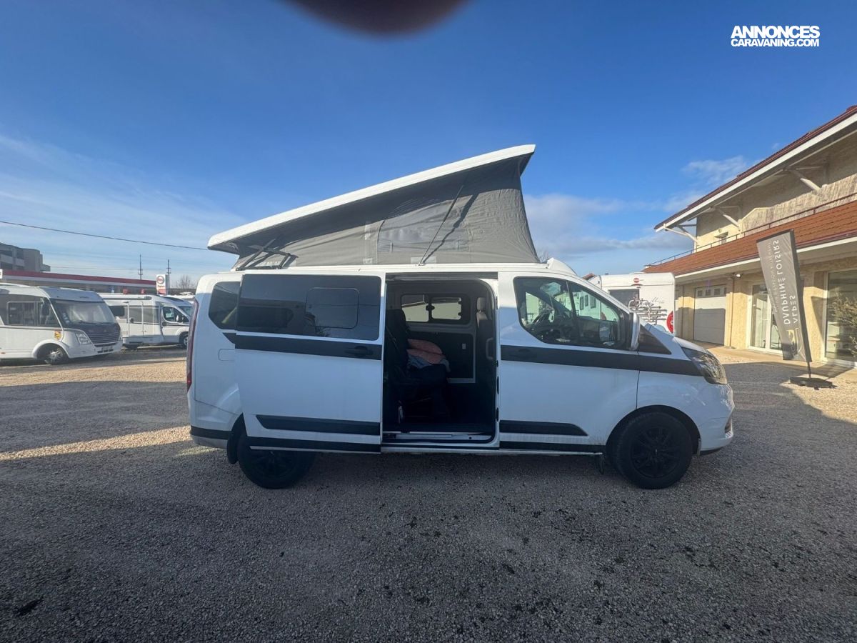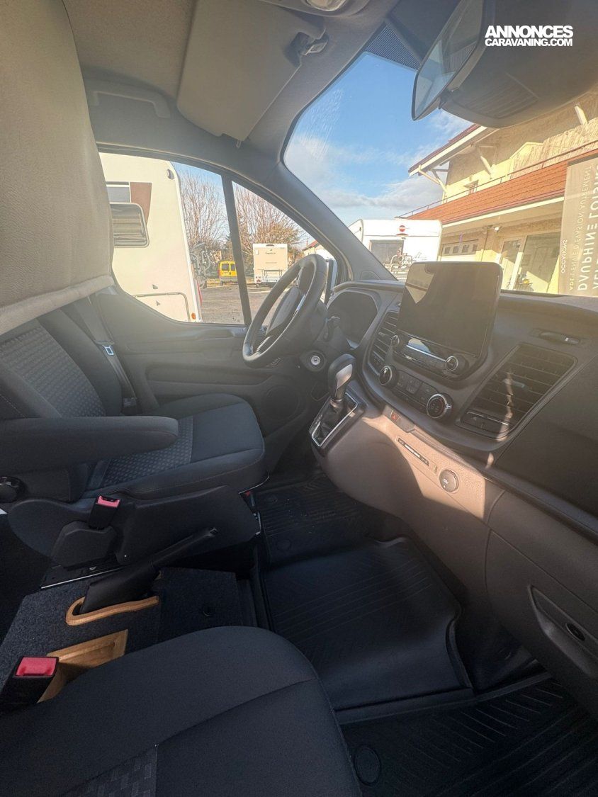 - pack ford zen connect (grand écran tactile, radars AV/AR, caméra de recul, feux et essuie-glaces auto, rétros électriques, pare-brise dégivrant) - toit relevable SCA (lit très long car en L2) - chauffage stationnaire sur gasoil avec kit altitude - attelage démontable sans outil - installation électrique full options et quasi 100% victron (sans perte de place car tout est sous les sièges avant) : batterie lithium 150Ah bluetooth, chargeur 12v/12v + chargeur 220v/12v, battery protect, smartshunt, transfo 12v/220v, branchement sur le 220v extérieur, 4 coupe-circuits, mppt déjà installé (donc juste à brancher un panneau solaire si nécessaire), nombreuses prises 12v / usb / 220v, ... Une table intérieure / extérieure est fournie.