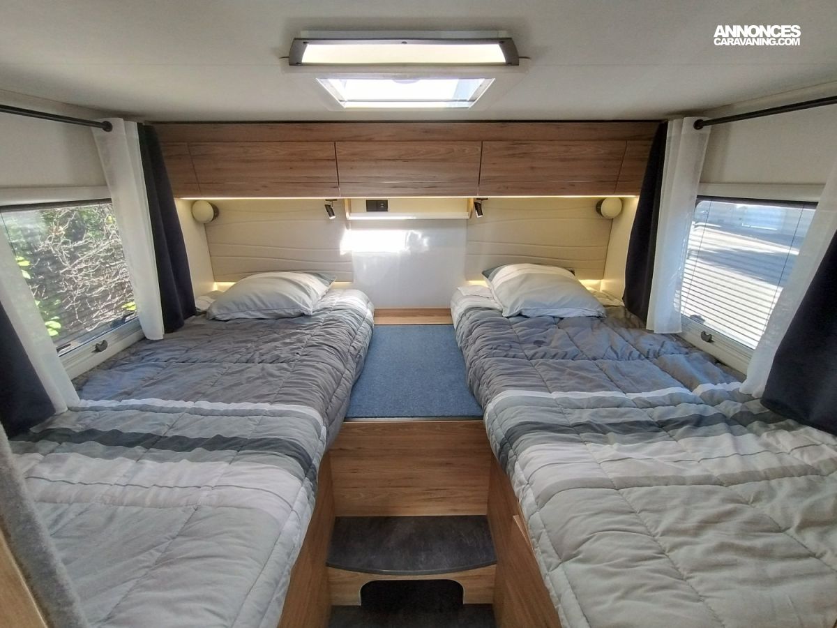 Une implantation idéale pour un couple ou une famille grâce à ses 4 grand couchages : lits jumeaux en partie arrière avec cabinet de toilettes et douche séparés. En partie avant un grand lit pavillon complète les couchages.