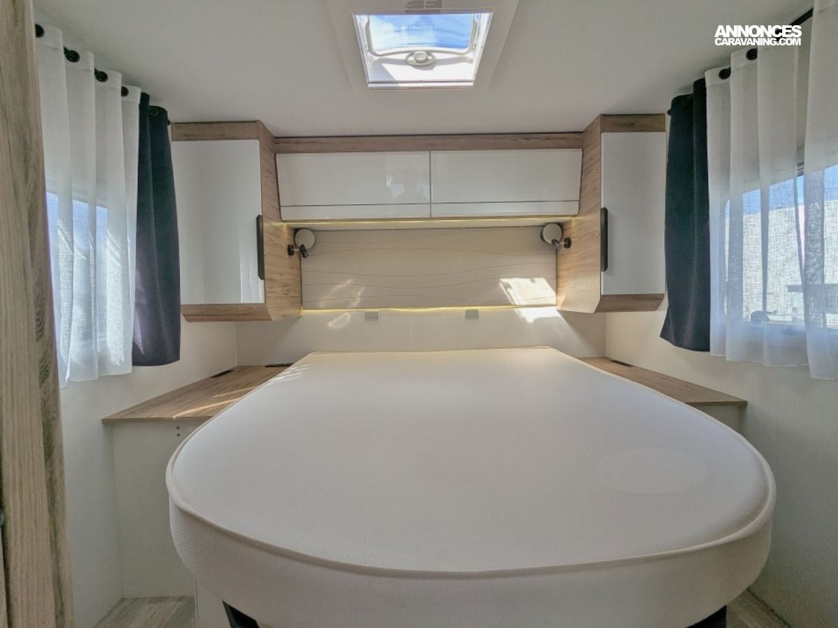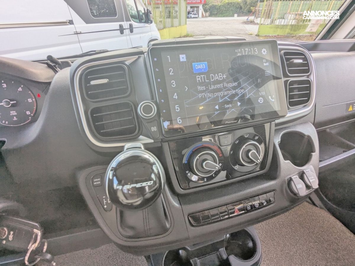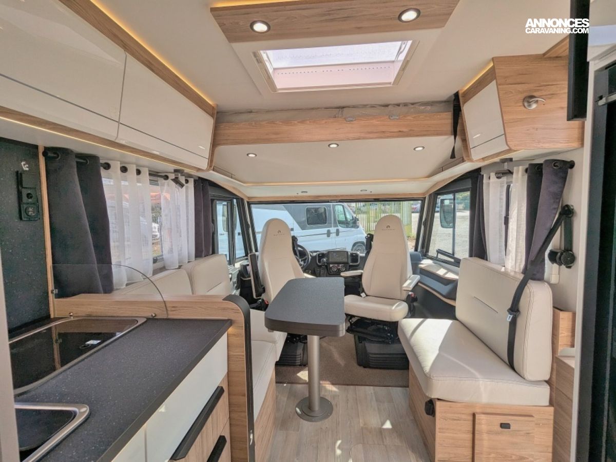Camping-car intégral en très bon état sur Fiat 2,2 JTD 160 cv boîte automatique avec lit central, salle d'eau/WC, douche indépendante, cuisine équipée de frigo conservateur de 150 L, plaque gaz et de nombreux tiroirs fonctionnels, et salon avant avec sièges pivotants. Lit de pavillon de deux persoinnes au-dessus des sièges conducteur et passager.