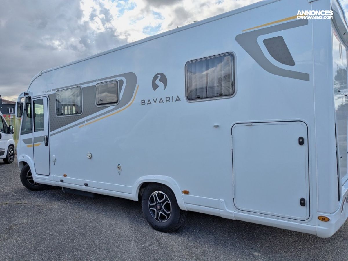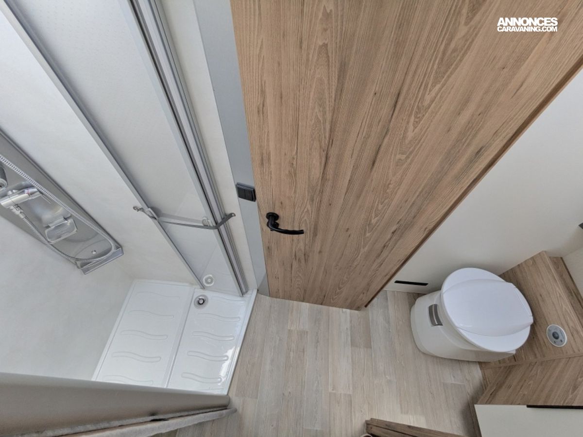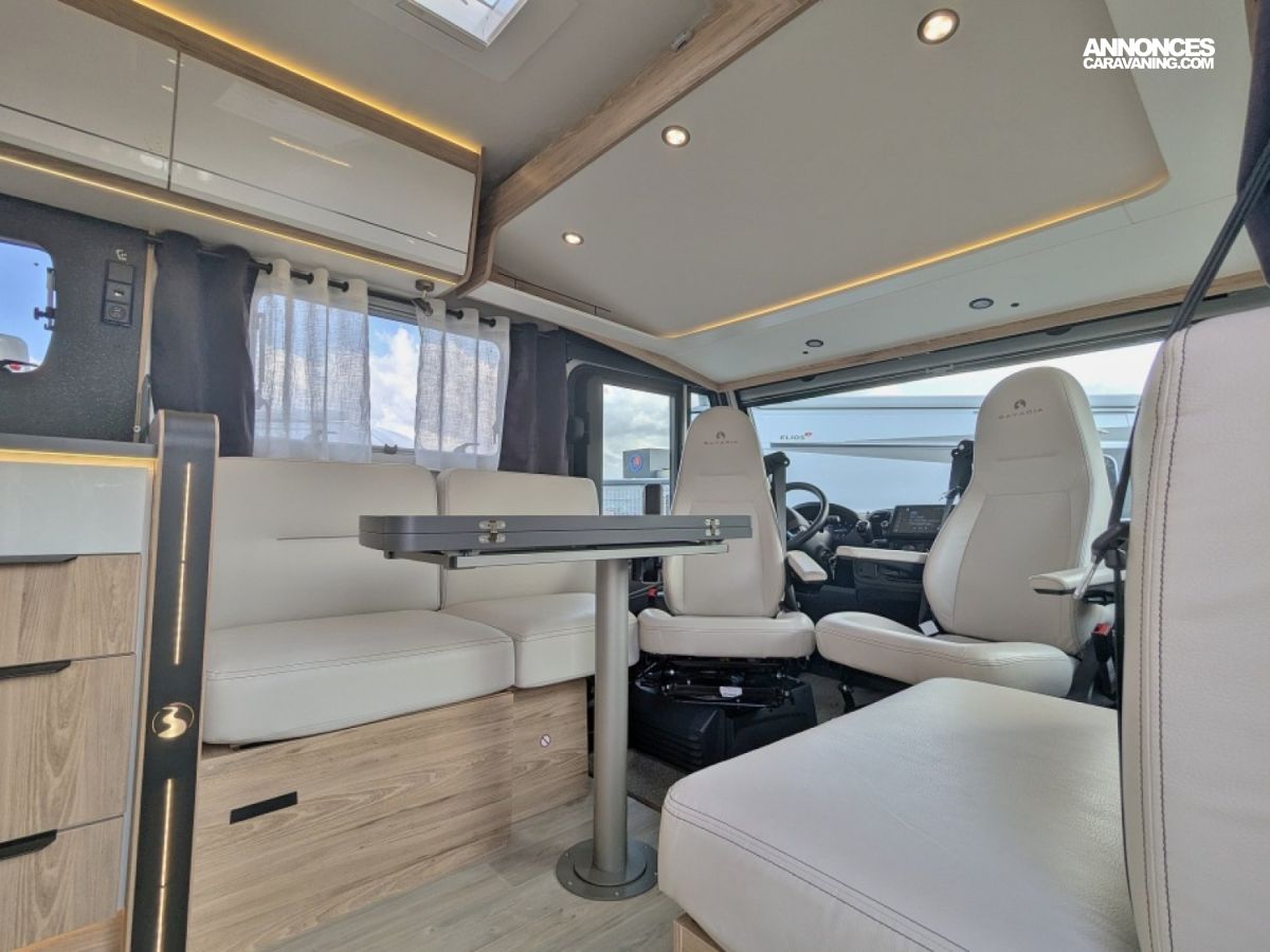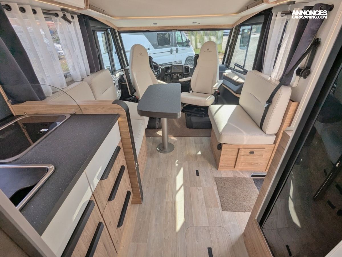 Camping-car intégral en très bon état sur Fiat 2,2 JTD 160 cv boîte automatique avec lit central, salle d'eau/WC, douche indépendante, cuisine équipée de frigo conservateur de 150 L, plaque gaz et de nombreux tiroirs fonctionnels, et salon avant avec sièges pivotants. Lit de pavillon de deux persoinnes au-dessus des sièges conducteur et passager.