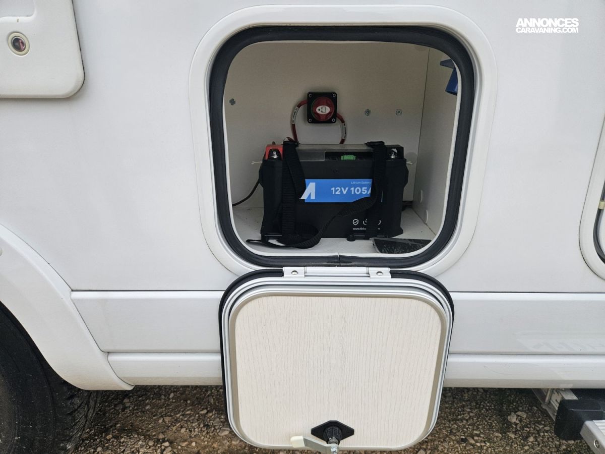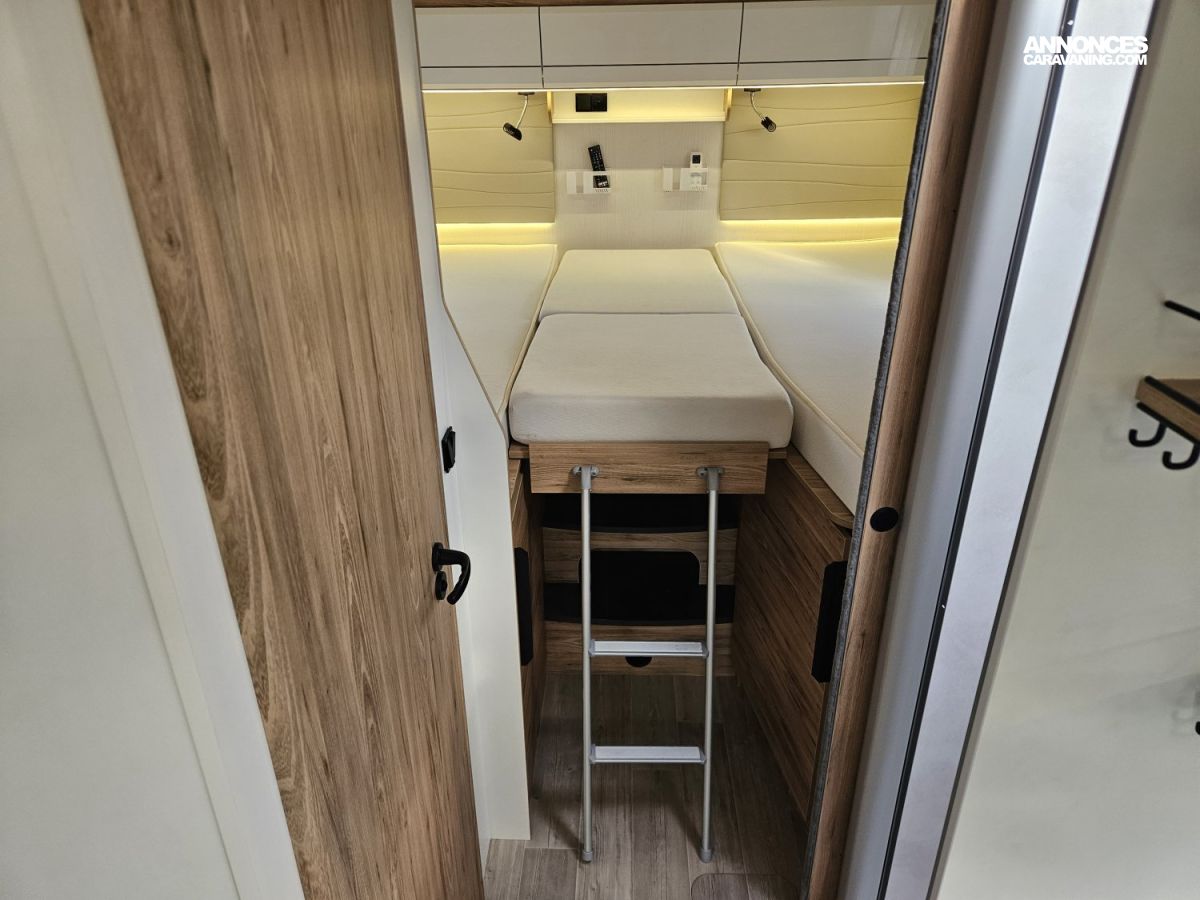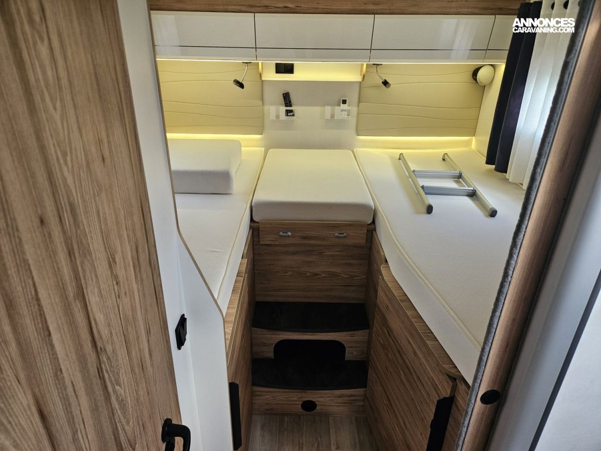 Un marchepied électrique, un store extérieur de 4,5 Mètres, une moustiquaire de porte cellule. Avec des store plissés de cabine et une moquette cabine.