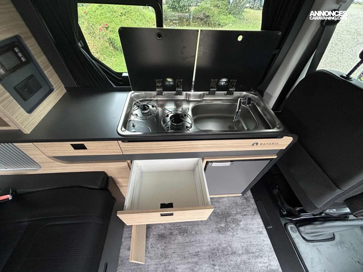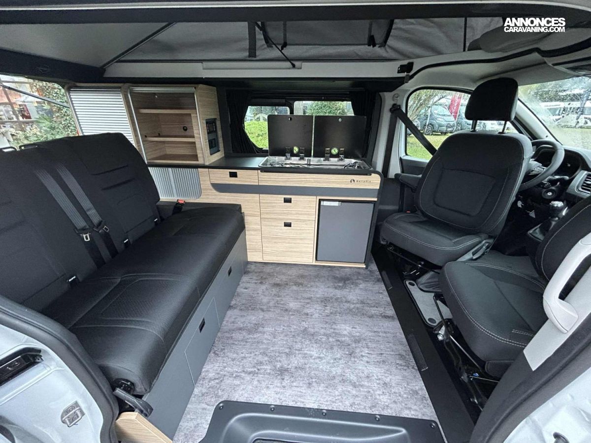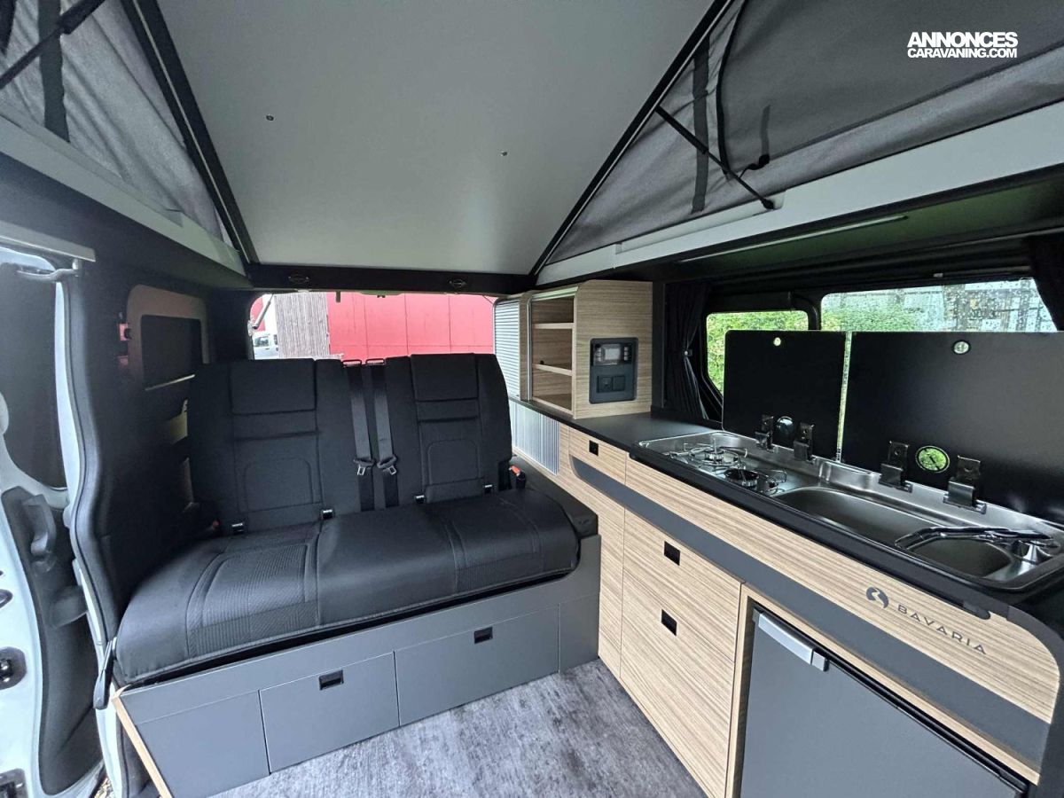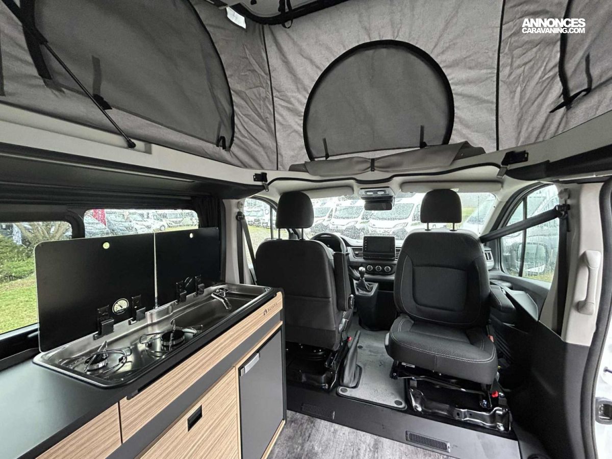 Réfrigérateur compression 51L, Isolation en fibre de polyester, Store manuel, Radar de recul, Easy Link 8 Pouces, Panneau solaire 100W, Caméra de recul, Régulateur de vitesse, Chauffage gazoil 2000W, Batterie AGM, Kit Altitude, Feux AV Full LED, Douchette extérieur