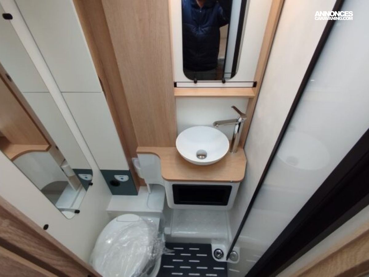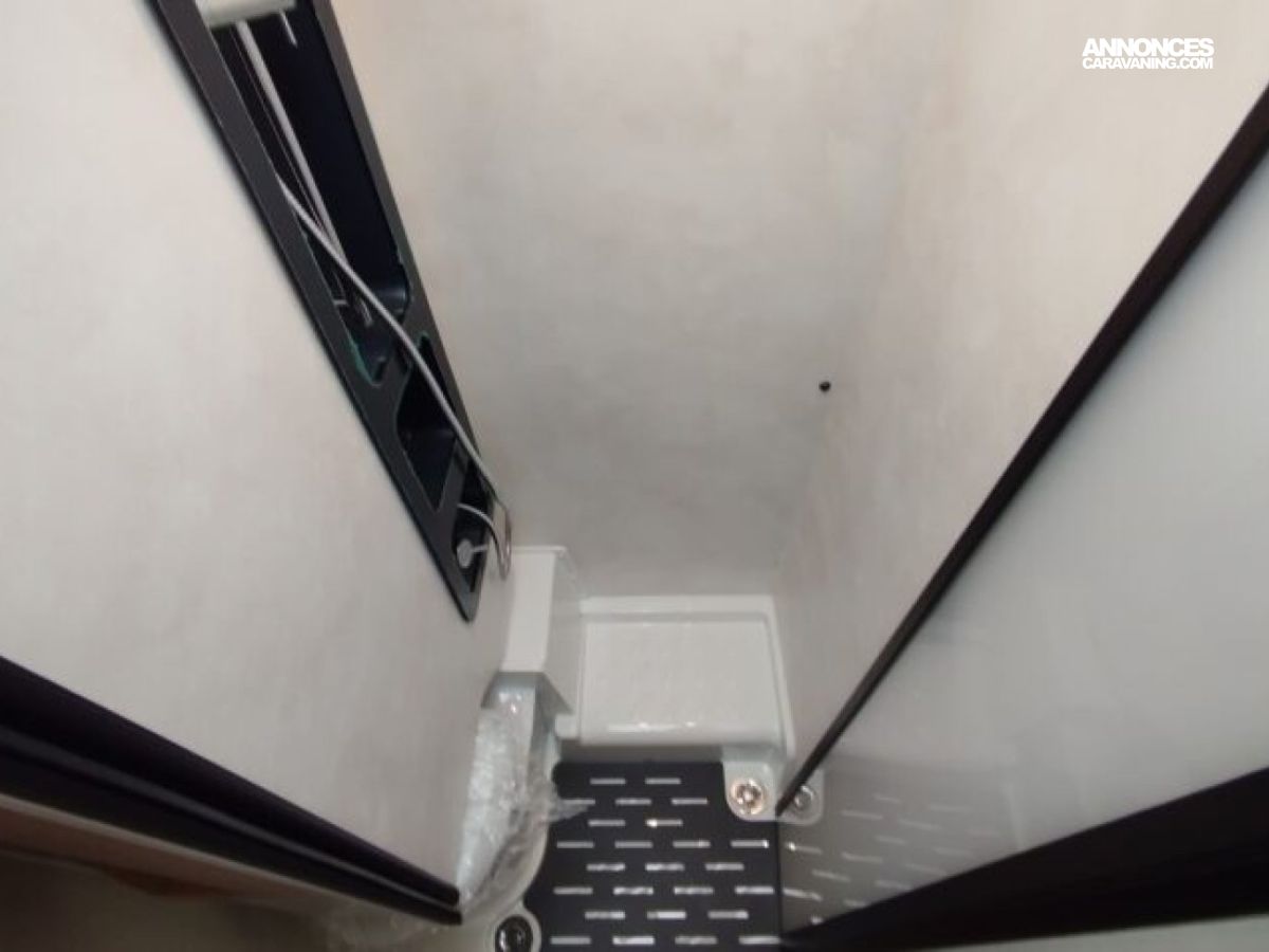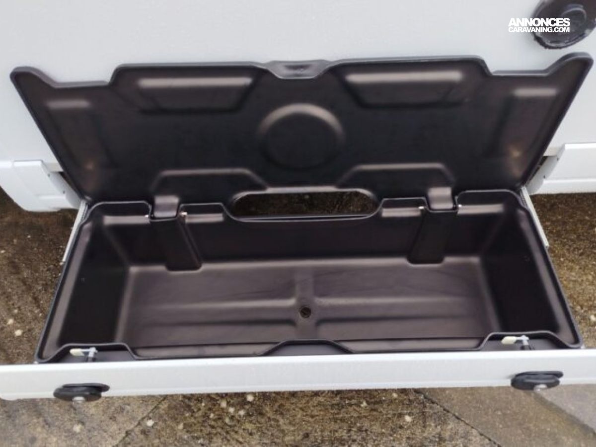 Soit : éclairage, prise 230V et rails en soute, douchette, store banne, caillebotis, inverseur automatique, crash sensor, réservoir eaux usées hors-gel, poubelle intégrée et porte-serviette