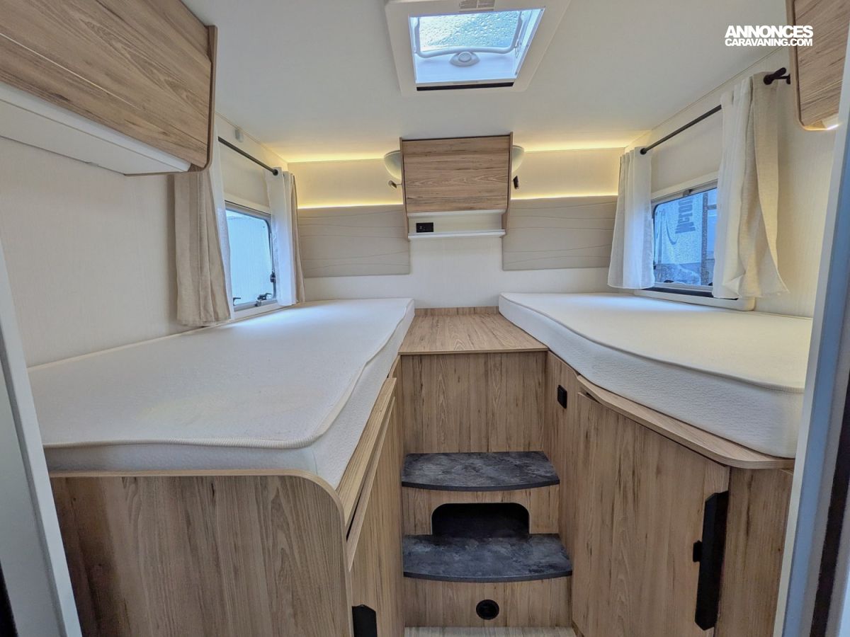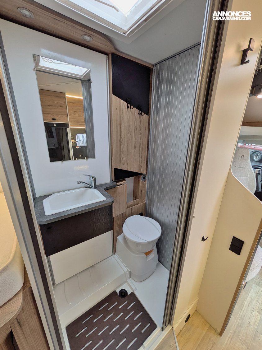 Camping-car profilé compact sur Fiat 2,2 JTD 140 CV en boîte automatique avec lits jumeaux sur soute, cabinet de toilette vario avec douche séparée et WC, cuisine latérale avec frigo/conservateur et plaque de cuisson 2 feux, et salon avant avec sièges pivotants.