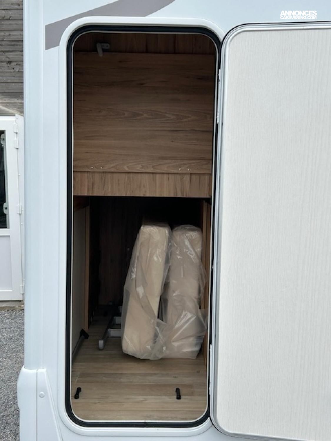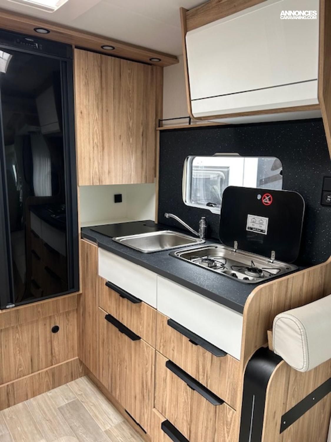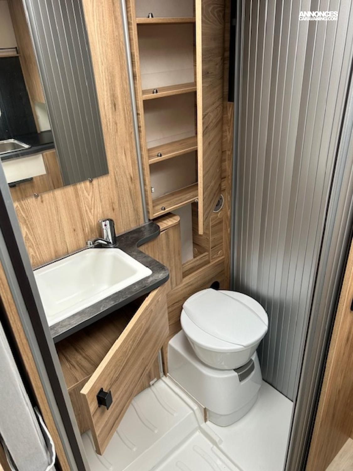 Ce camping-car de petite longueur (6,20M) offre une incroyable habitabilité avec son salon face/face et sa grande table, sa cuisine avec de nombreux placards et un grand réfrigérateur de 133L, sa salle d'eau avec un système de paroi de douche mobile.