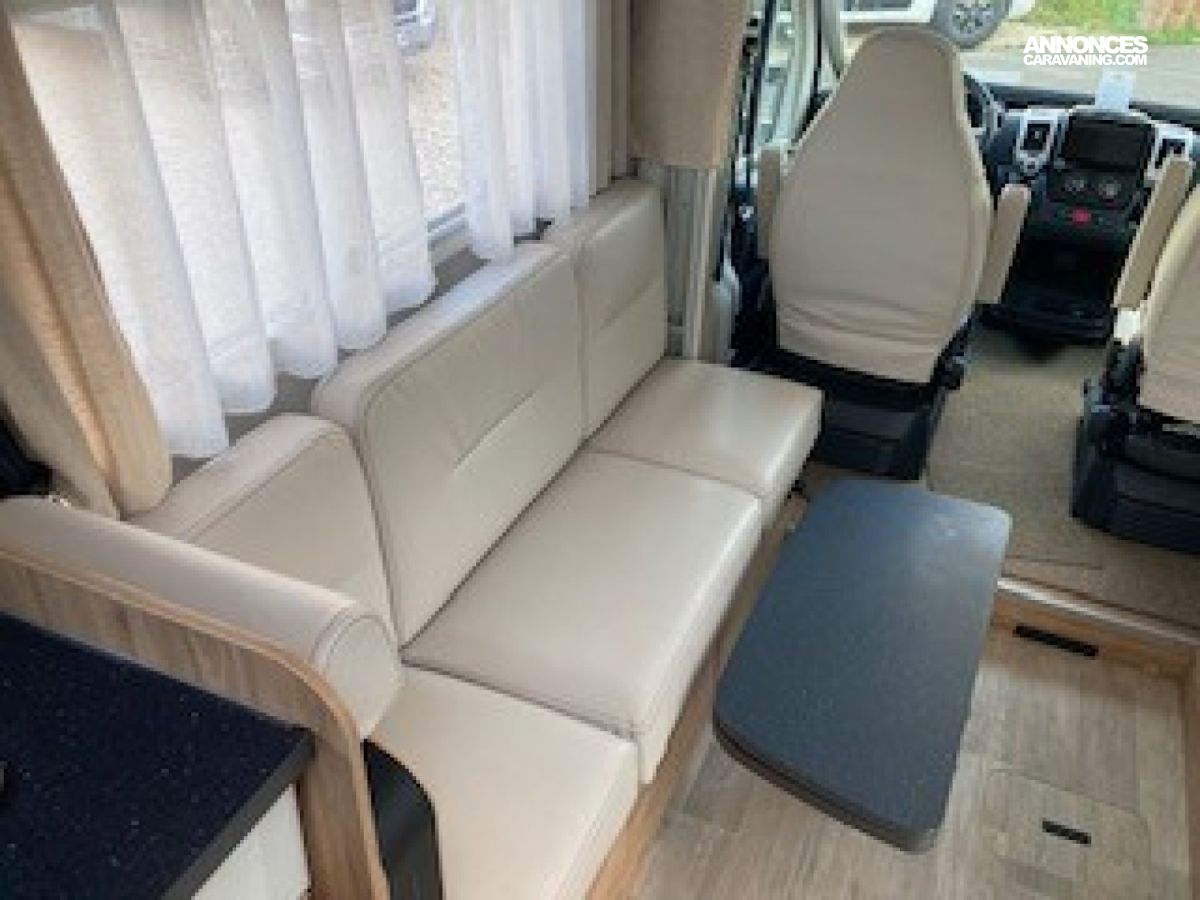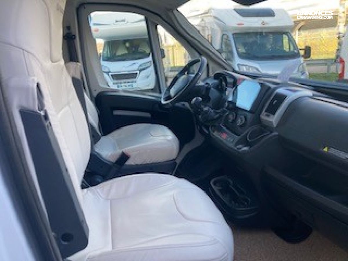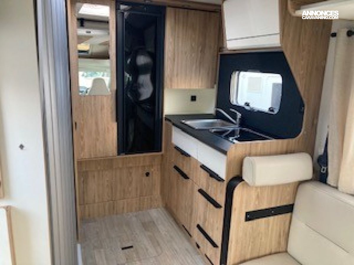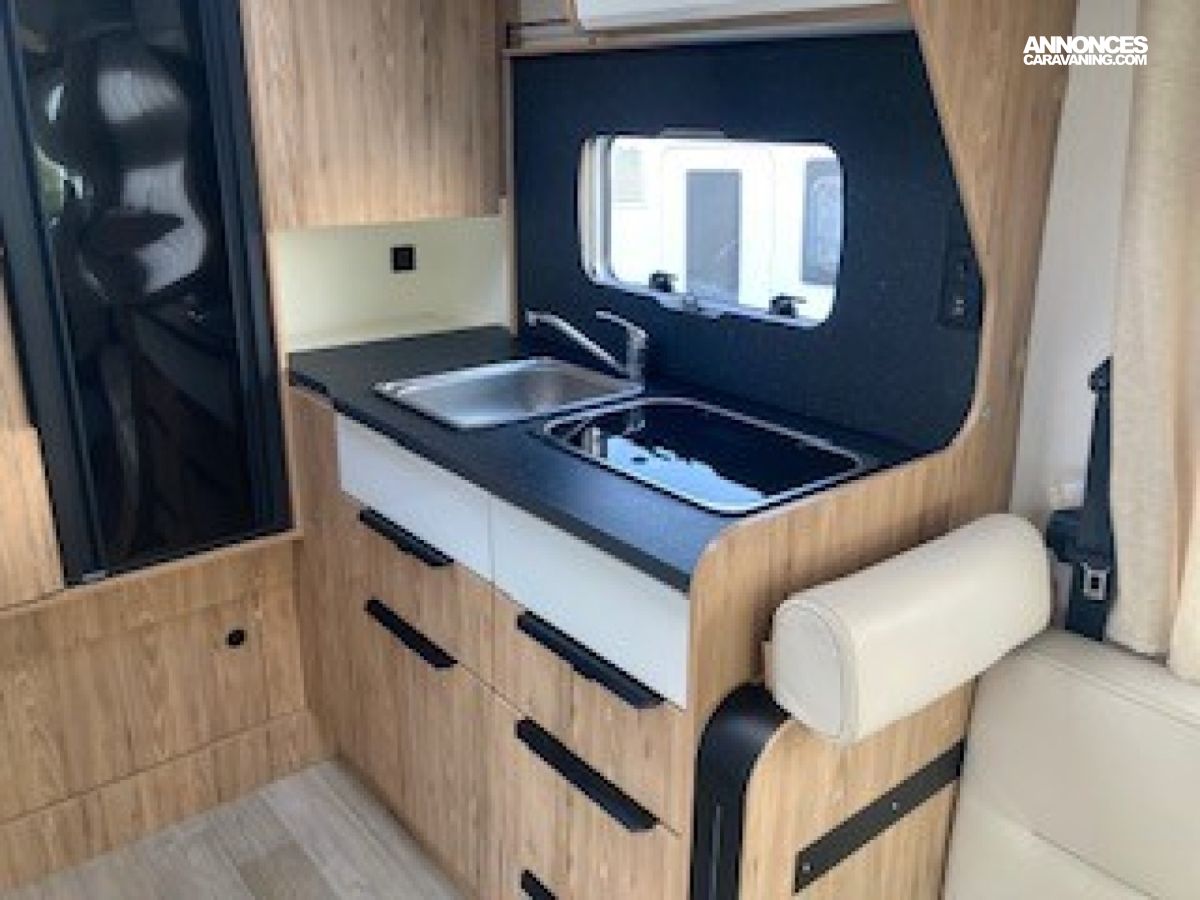 Panneau solaire 100 W, Pare-chocs avant peint couleur carrosserie, Réfrigérateur gestion automatique et caches grilles, Régulateur et limiteur de vitesse, Rétroviseurs électriques et dégivrants, Sellerie simili uni Lin, Sièges cabine houssés, pivotants et réglables en hauteur, ABS, ASR, ESP, Traction+, Kit anti-crevaison, Meuble Country et blanc brillant, Plan de travail et crédence mika noir, Projecteurs anti-brouillard et feux diurnes LED, Jantes aluminium 16’’, Tiroir bas de caisse, Verrouillage centralisé et vitres électriques, Volant et pommeau en cuir., Airbags conducteur et passager, Store banne, Autoradio 2Din 8” /caméra de recul et hp, Cerclages des optiques et calandre noires, Climatisation cabine manuelle, Commandes radio au volant