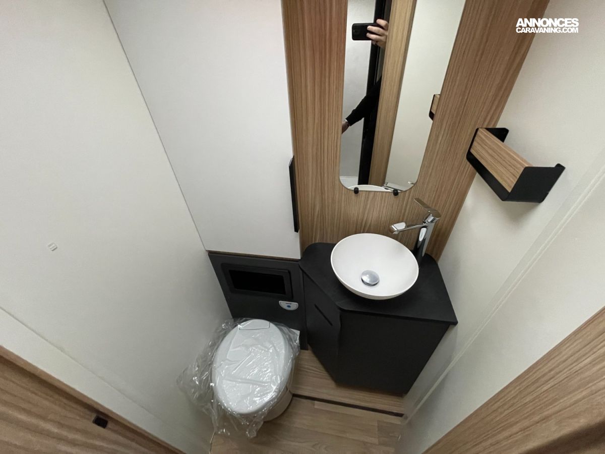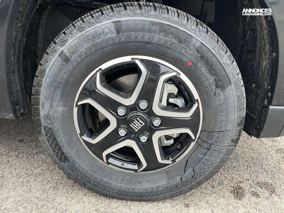Douchette eau droide/chaude dans la soute arrière, Tiroir bas de caisse, Lit pavillon electrique avec sommier à lattes, Cabine noire, Pack jantes, Pack média 7", Batterie lithium 210Ah, 2 panneaux solaires 100W monocristallin TOPCon haute perf, Booster batterie, Chauffage hybride Truma D 6E (Diesel/230V), Store banne