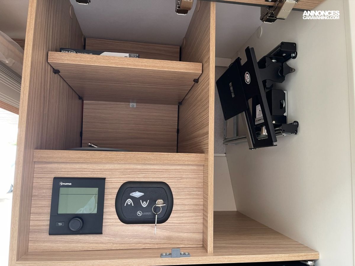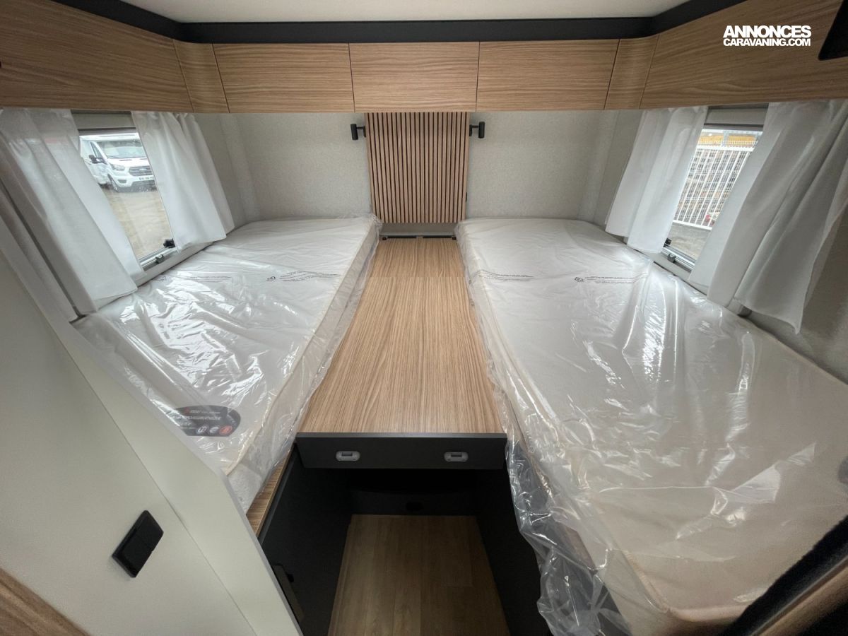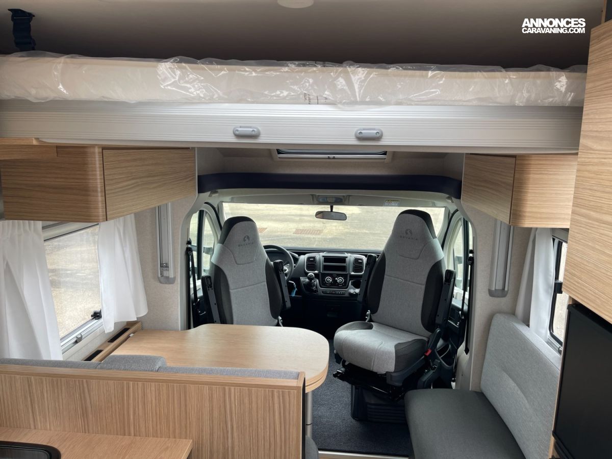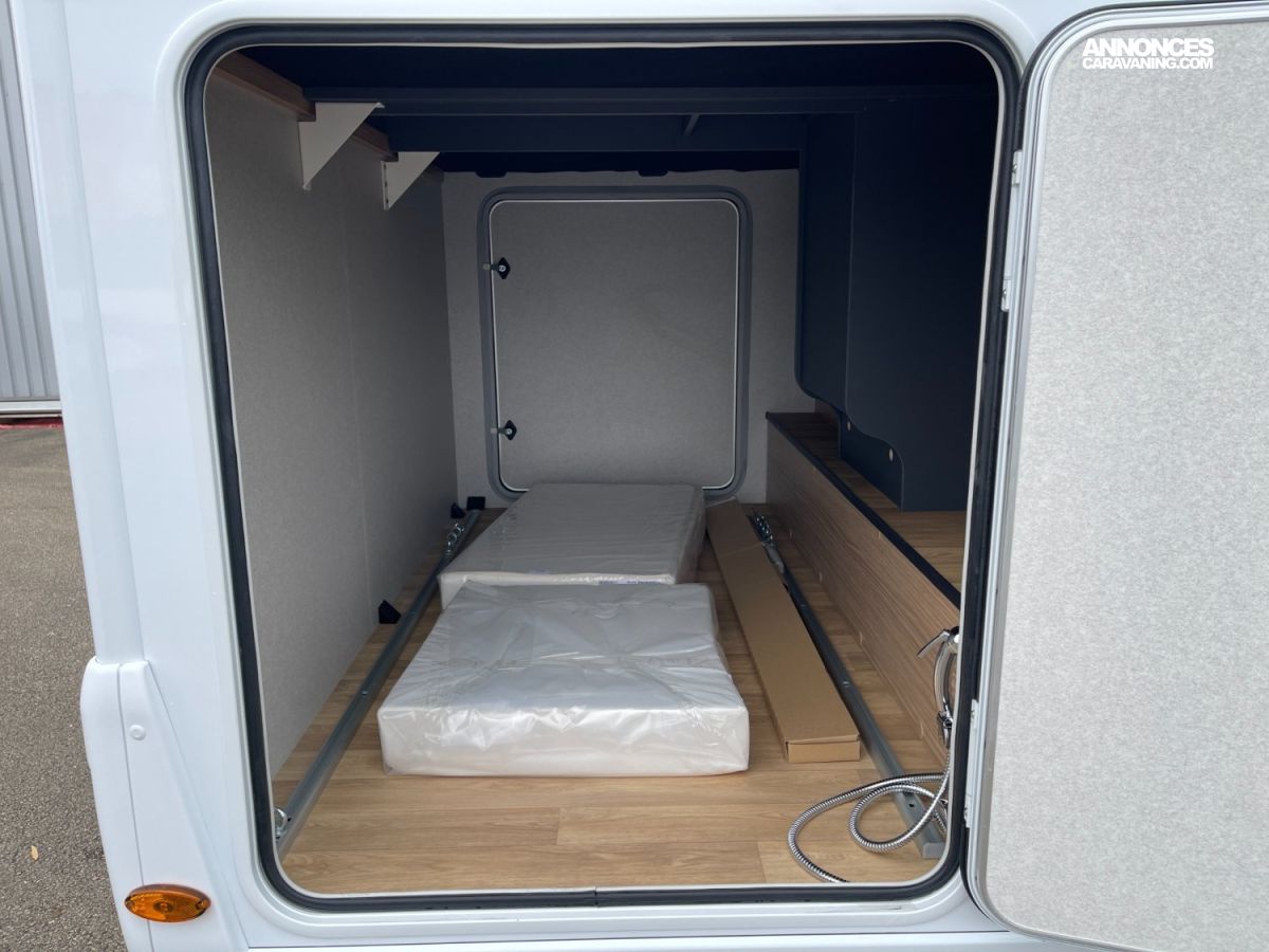 Réservoir gazole 90 L, Grand plan de travail, Structure renforcée permet charge lourde, Double cloisonement, Lanterneau salle de bain, Chauffage Truma Combi 6, Feux haute puissance, Salle d'eau traversante, Grande soute traversante par 2 portillons latéraux, Prises 230V et USB en chambre