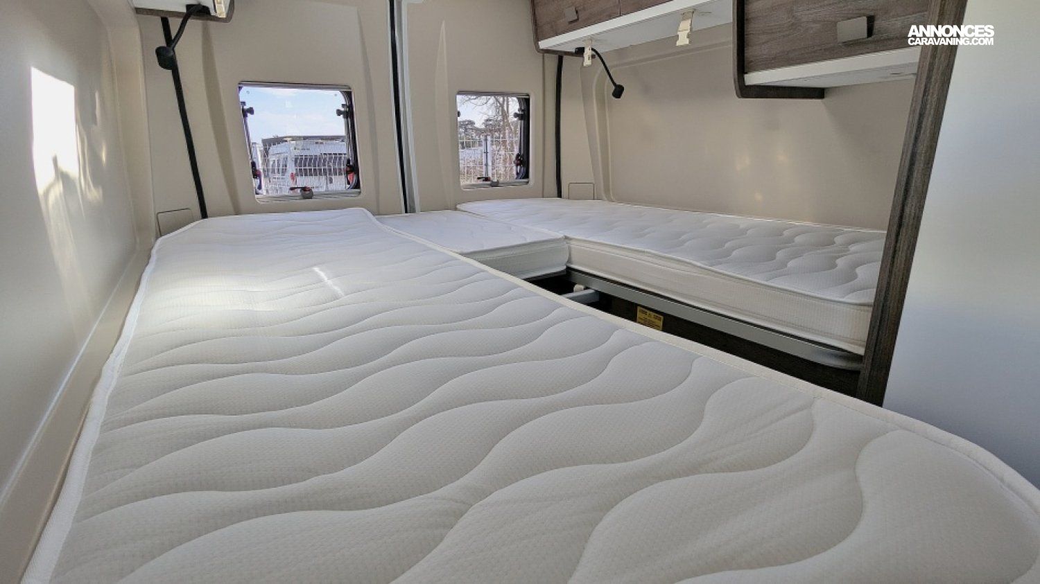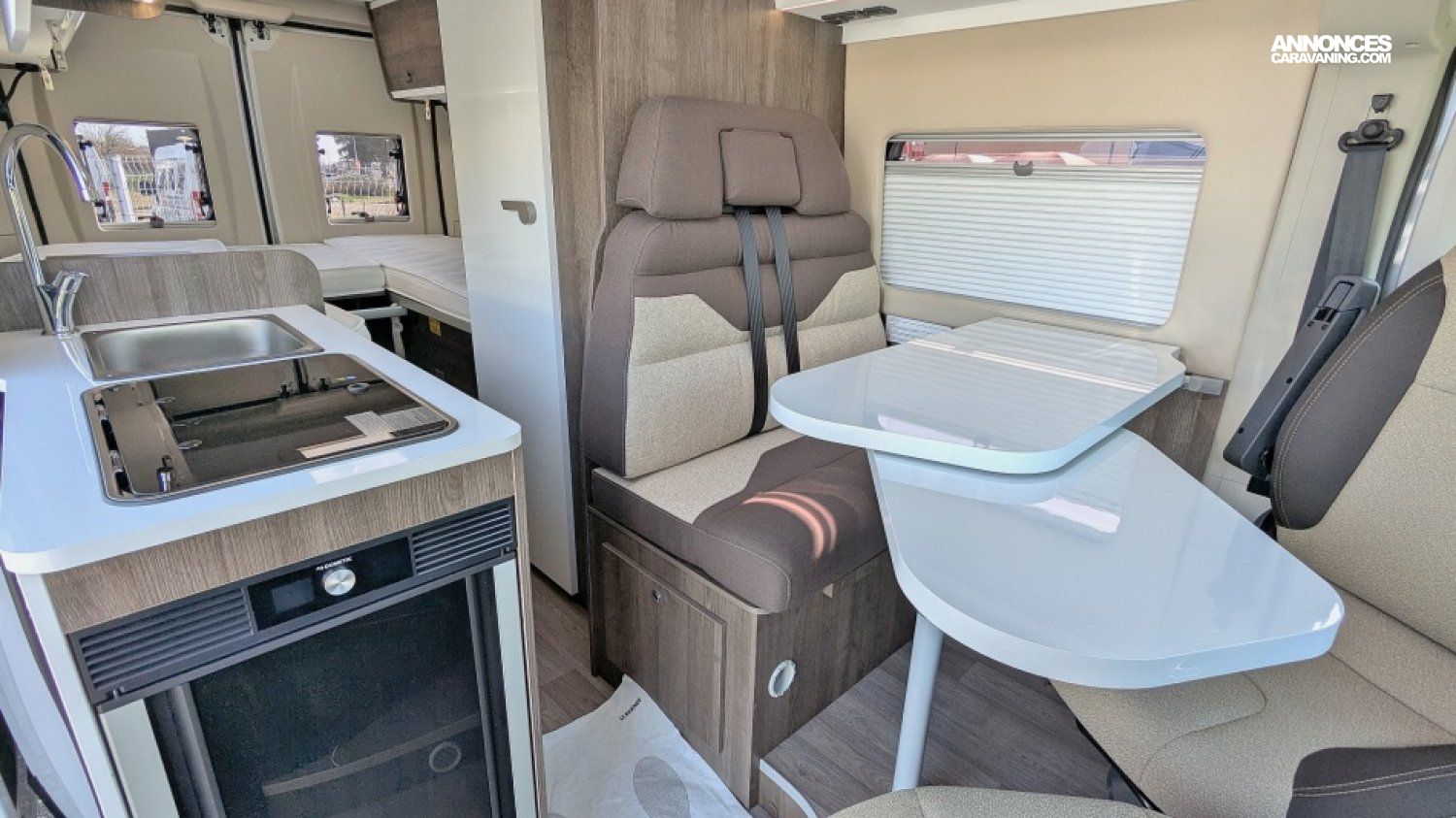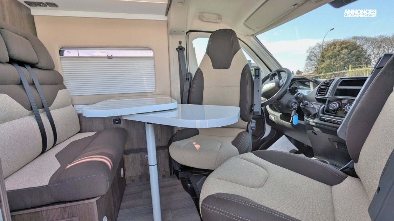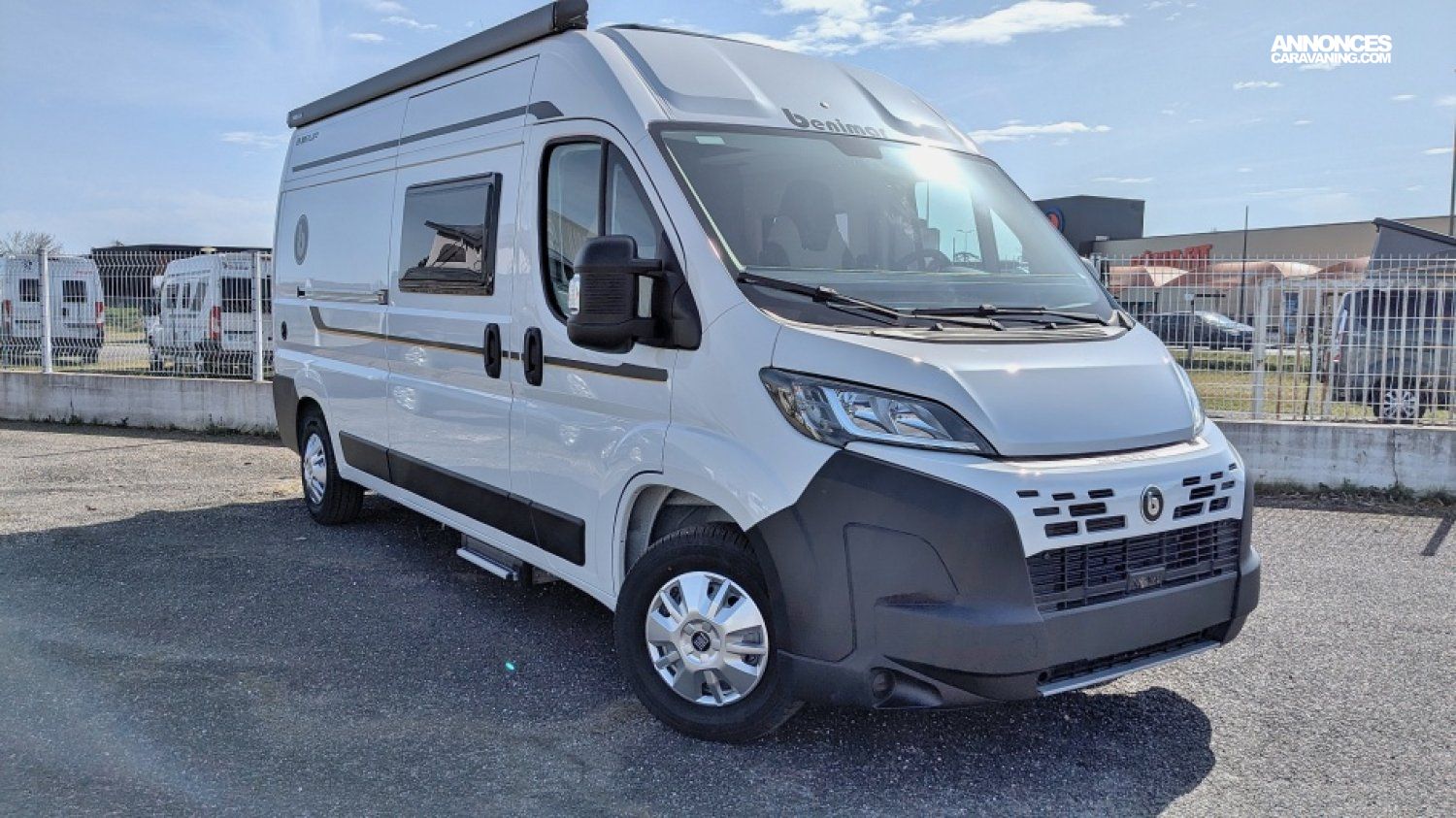 Benivan 161 UP sur Fiat 2,2 140 cv, fourgon aménagé de 5,99 m avec lits jumeaux, salle d'eau/WC avec douche, cuisine avec frigo à compression et maxi salon avec sièges pivotants.