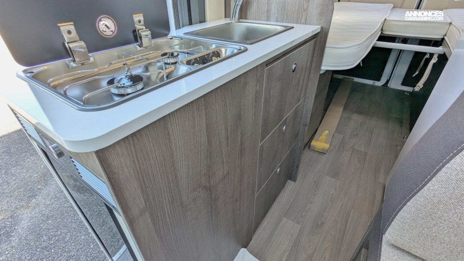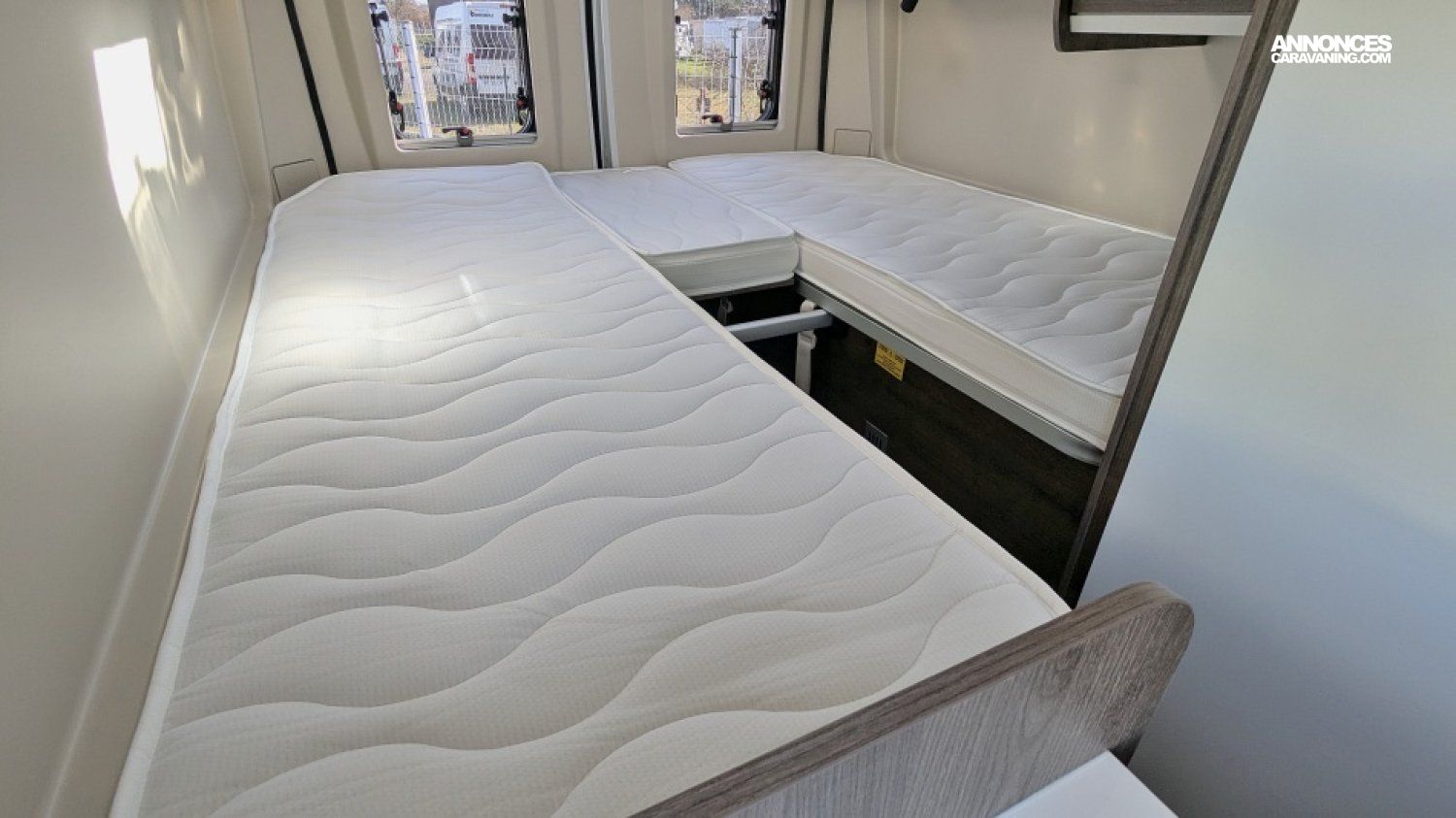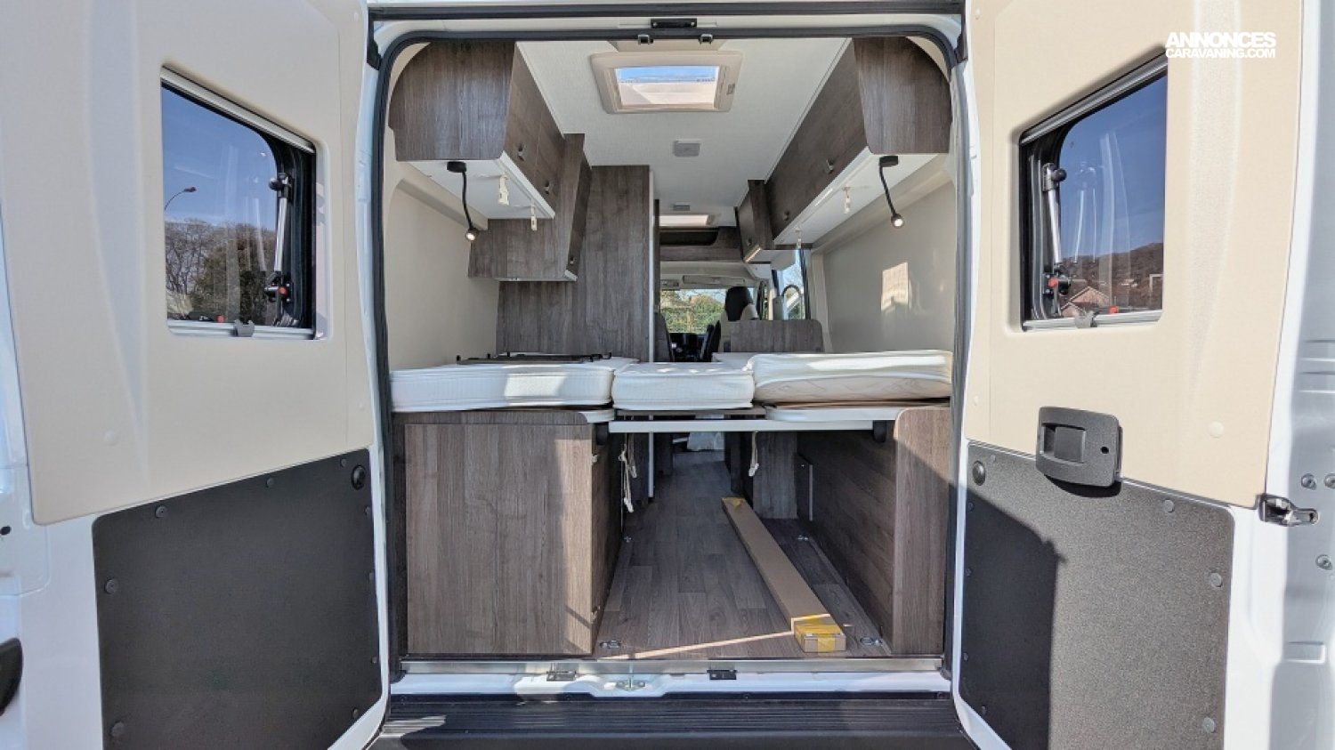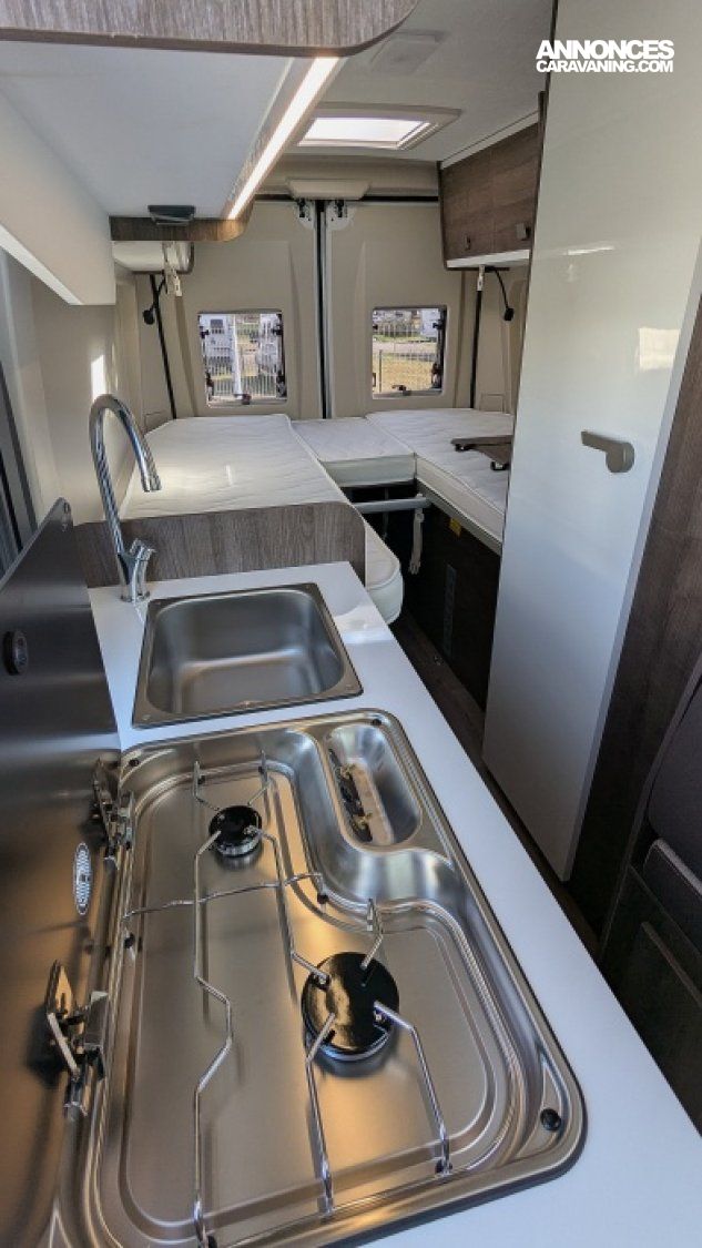 Benivan 161 UP sur Fiat 2,2 140 cv, fourgon aménagé de 5,99 m avec lits jumeaux, salle d'eau/WC avec douche, cuisine avec frigo à compression et maxi salon avec sièges pivotants.