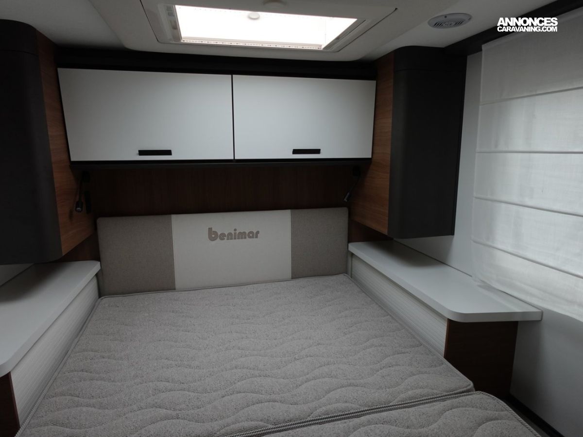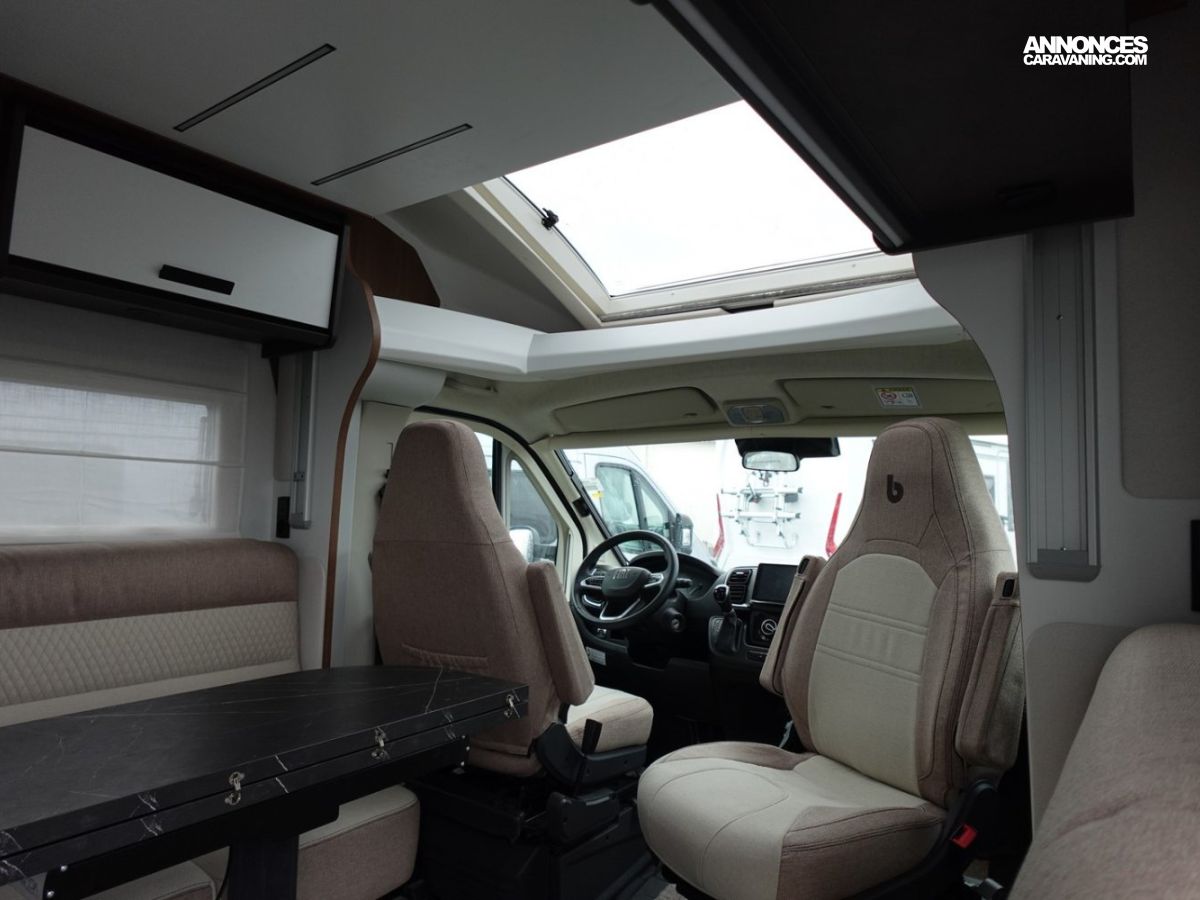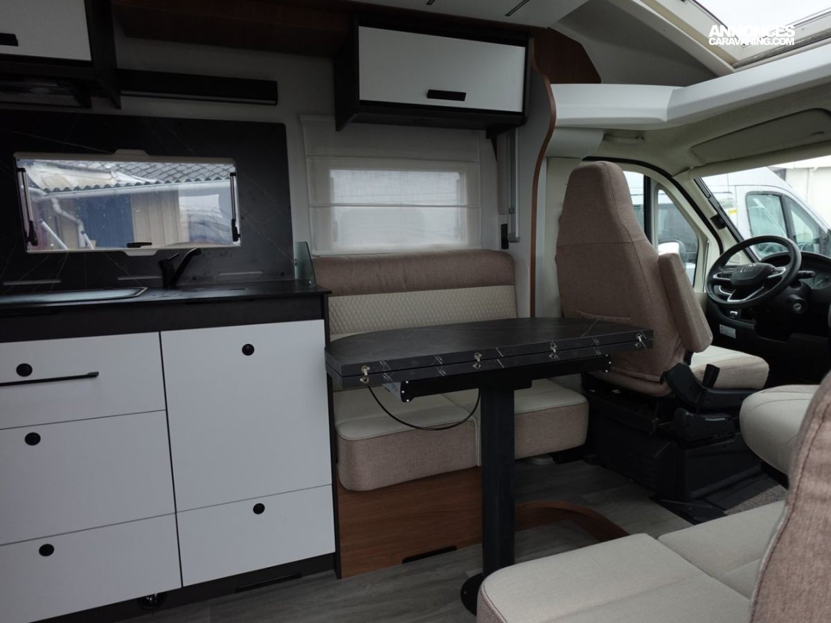 Magnifique profilé avec un lit central réglable en hauteur sur soute garage, une douche indépendante de l’espace WC, une cuisine avec de nombreux rangements, un lit de pavillon et un grand salon panoramique avec banquettes face/face.