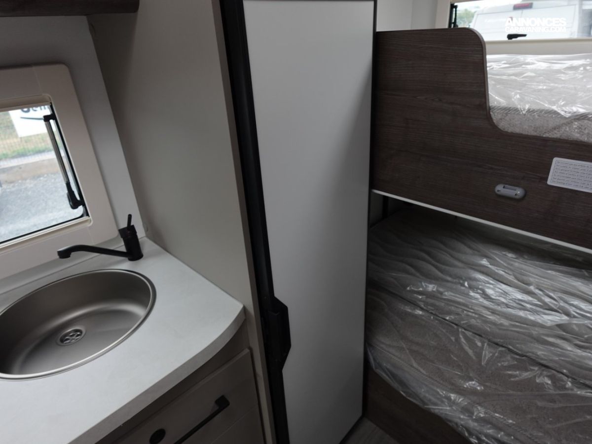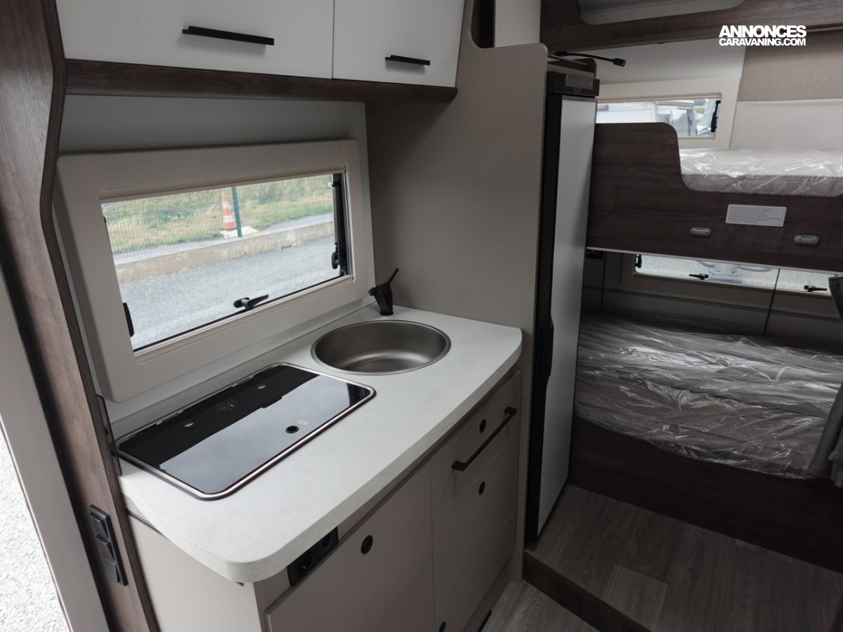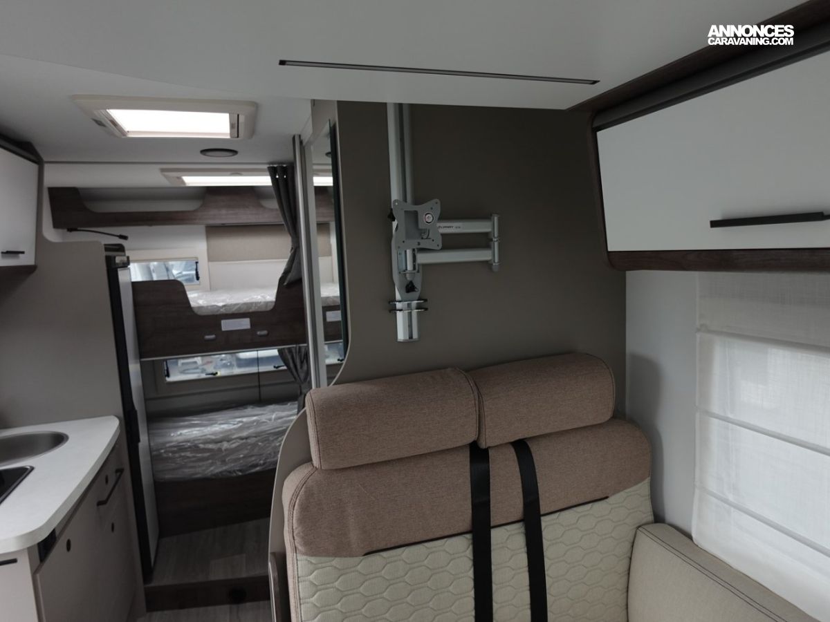 Magnifique profilé familial comprenant un très grand salon avant panoramique en L, une douche séparée par système vario, un lit de pavillon électrique, des lits superposés arrière et une cuisine avec de nombreux rangements.