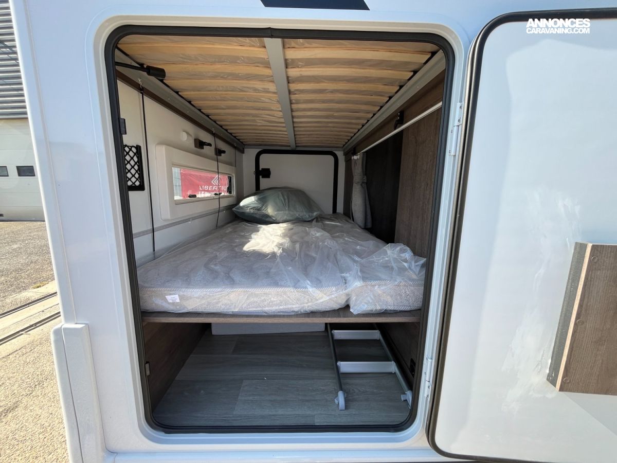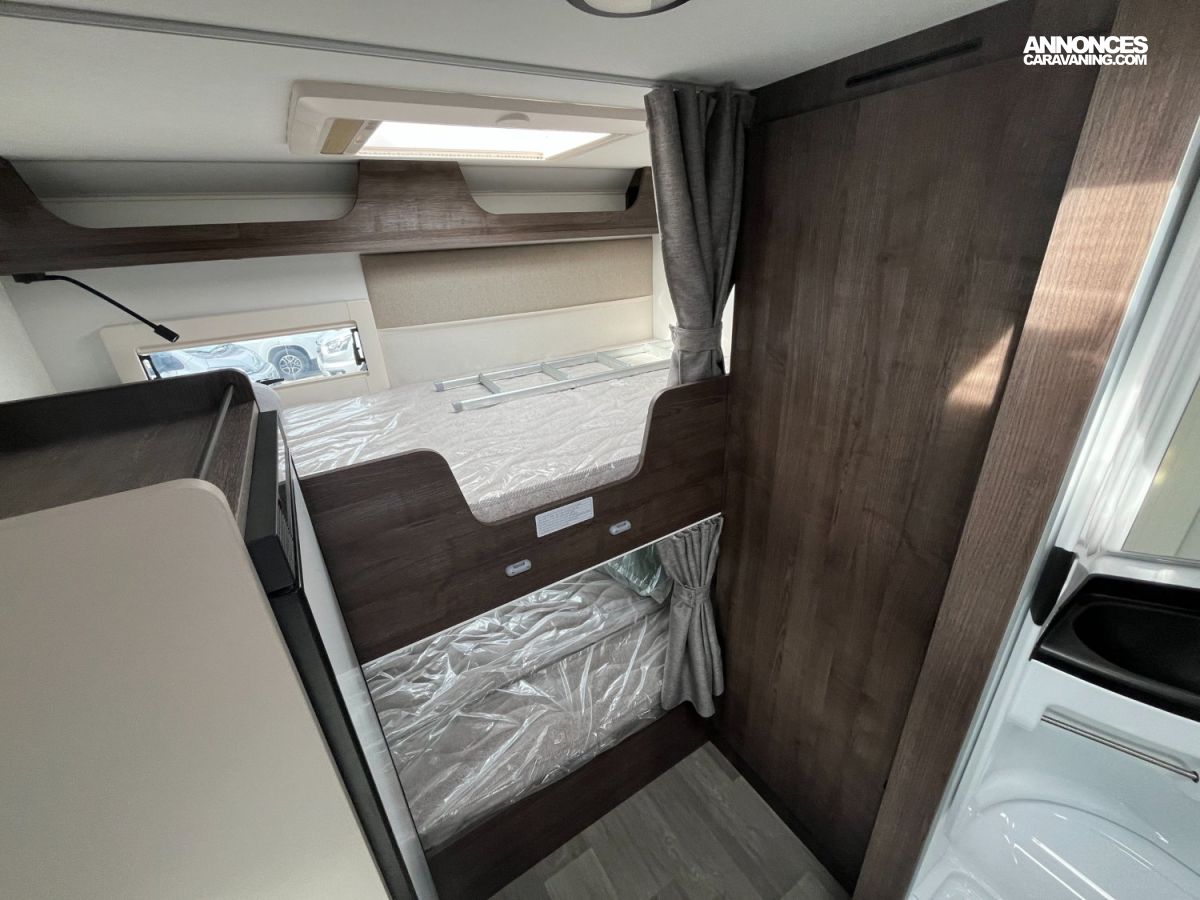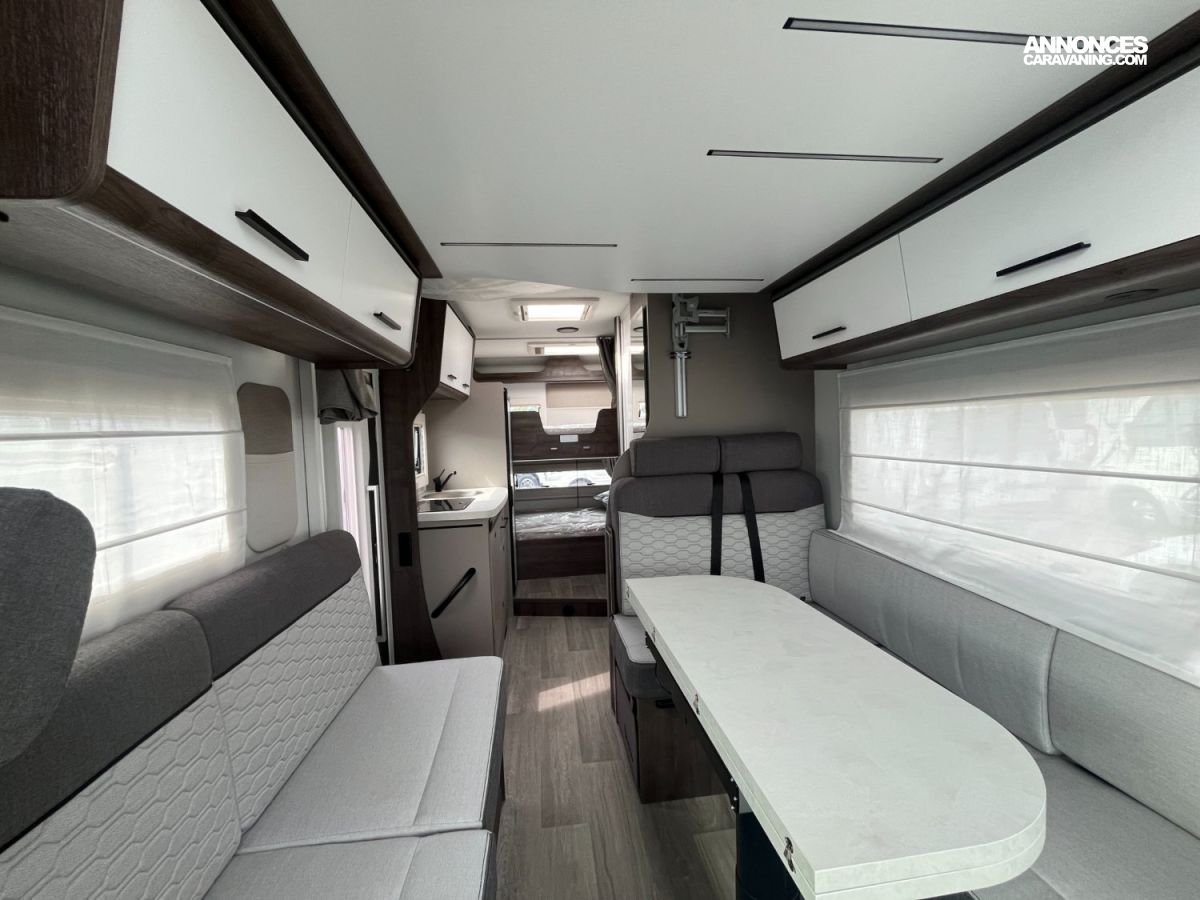 Profilé familial de 7,20 m avec BVA Ford Transit 165 ch, conçu pour 5/6 personnes : lit pavillon électrique, lits superposés XL et grand salon panoramique. Idéal confort et modernité pour voyager en famille.