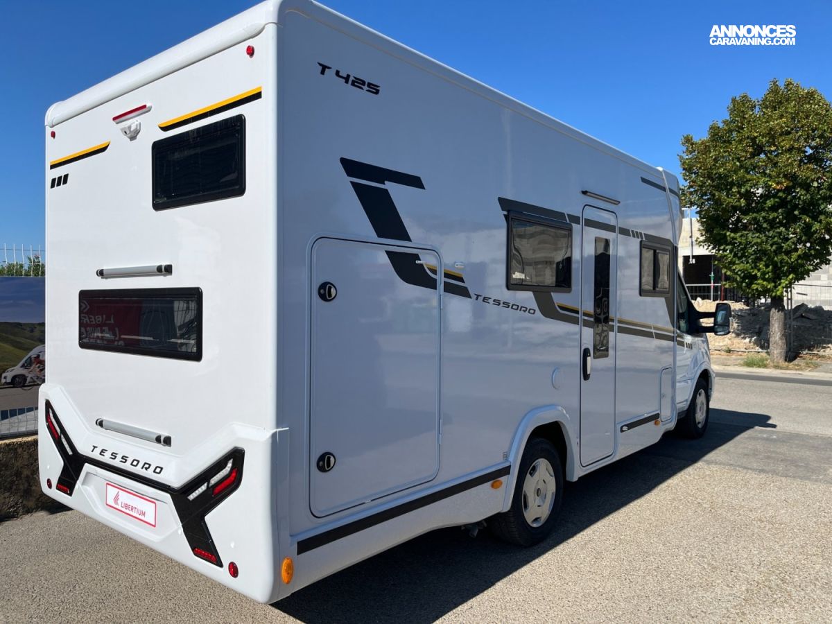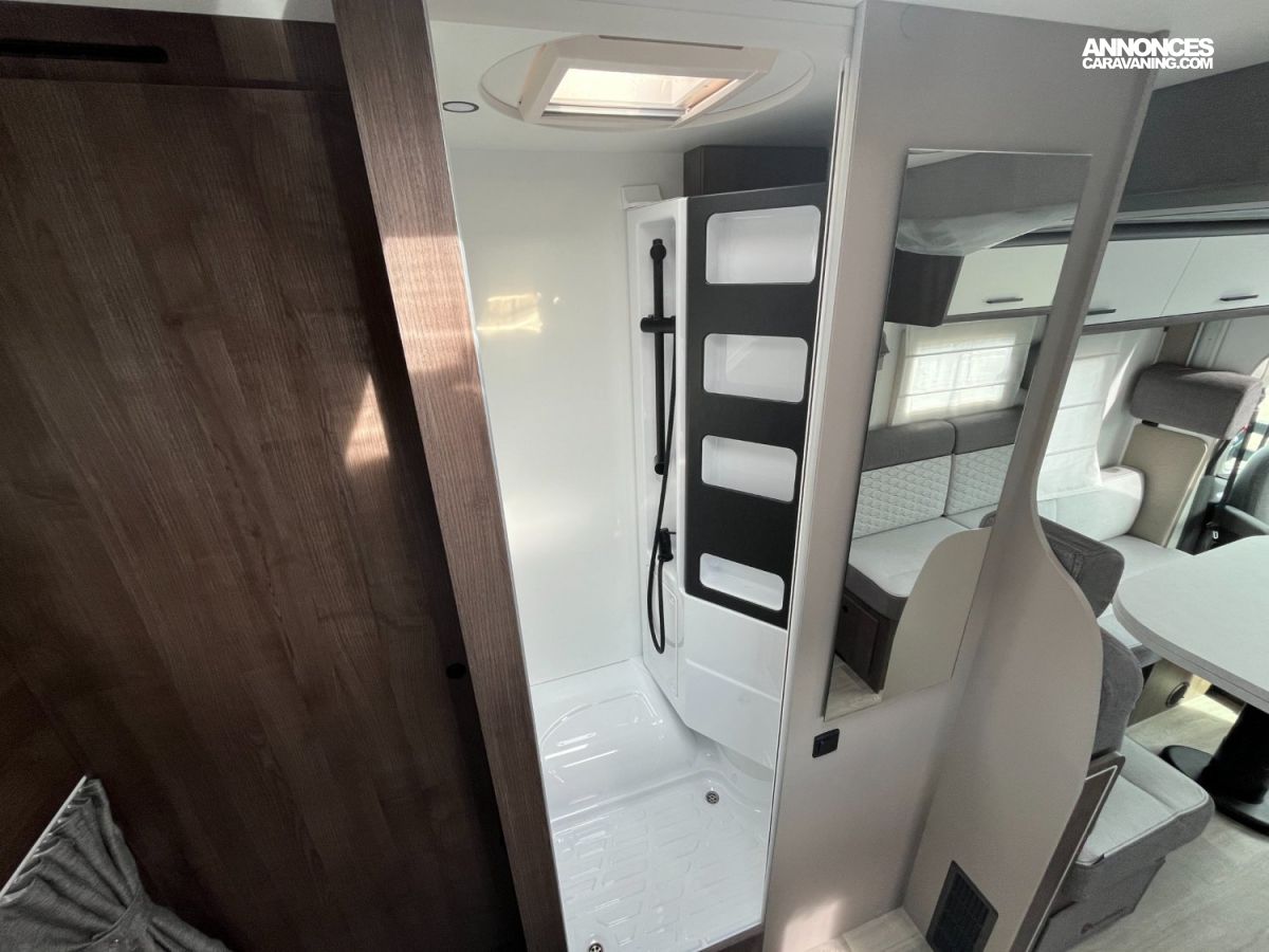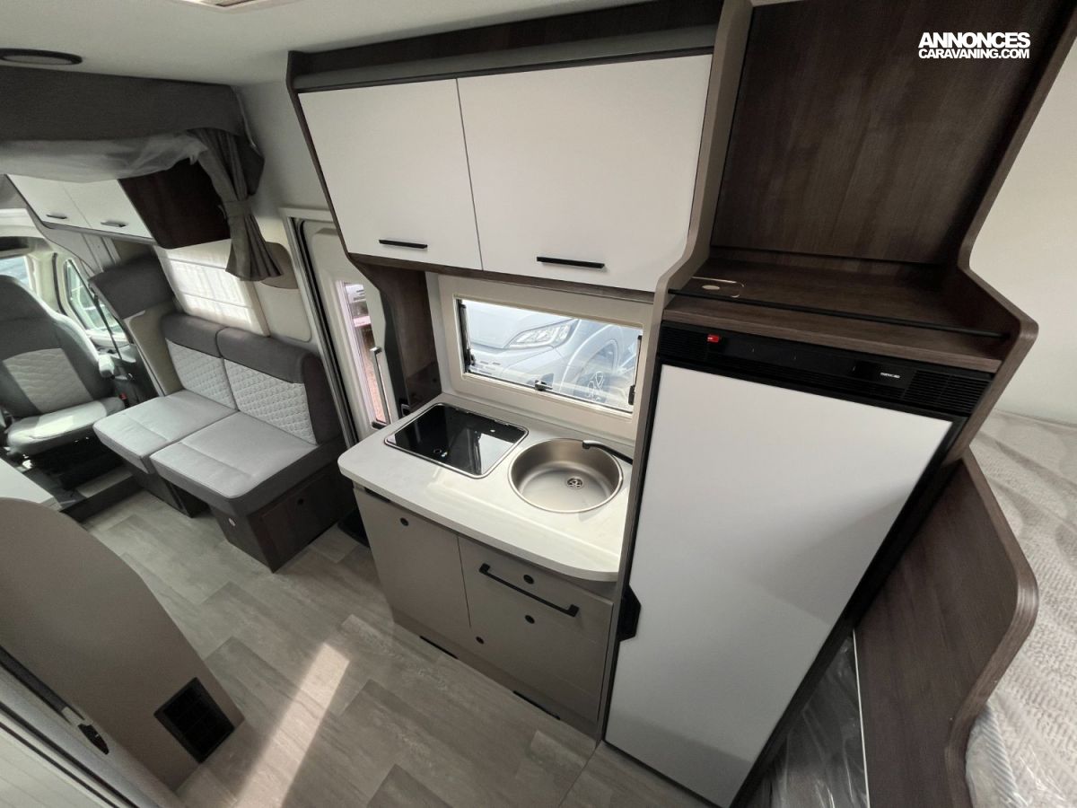 Profilé familial de 7,20 m avec BVA Ford Transit 165 ch, conçu pour 5/6 personnes : lit pavillon électrique, lits superposés XL et grand salon panoramique. Idéal confort et modernité pour voyager en famille.