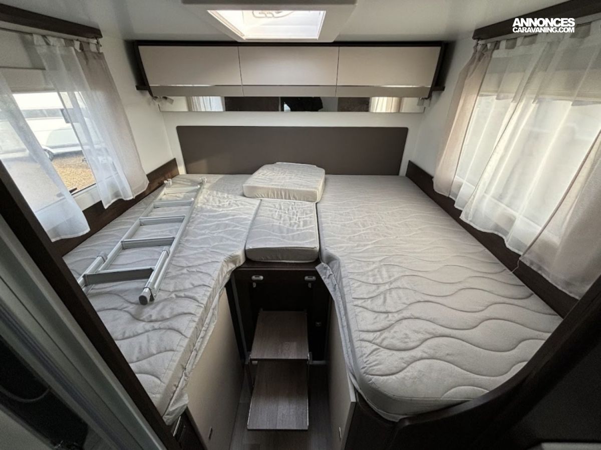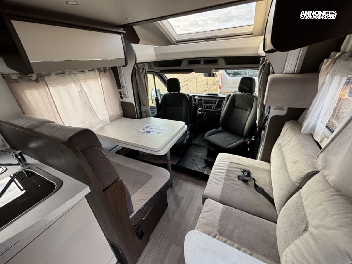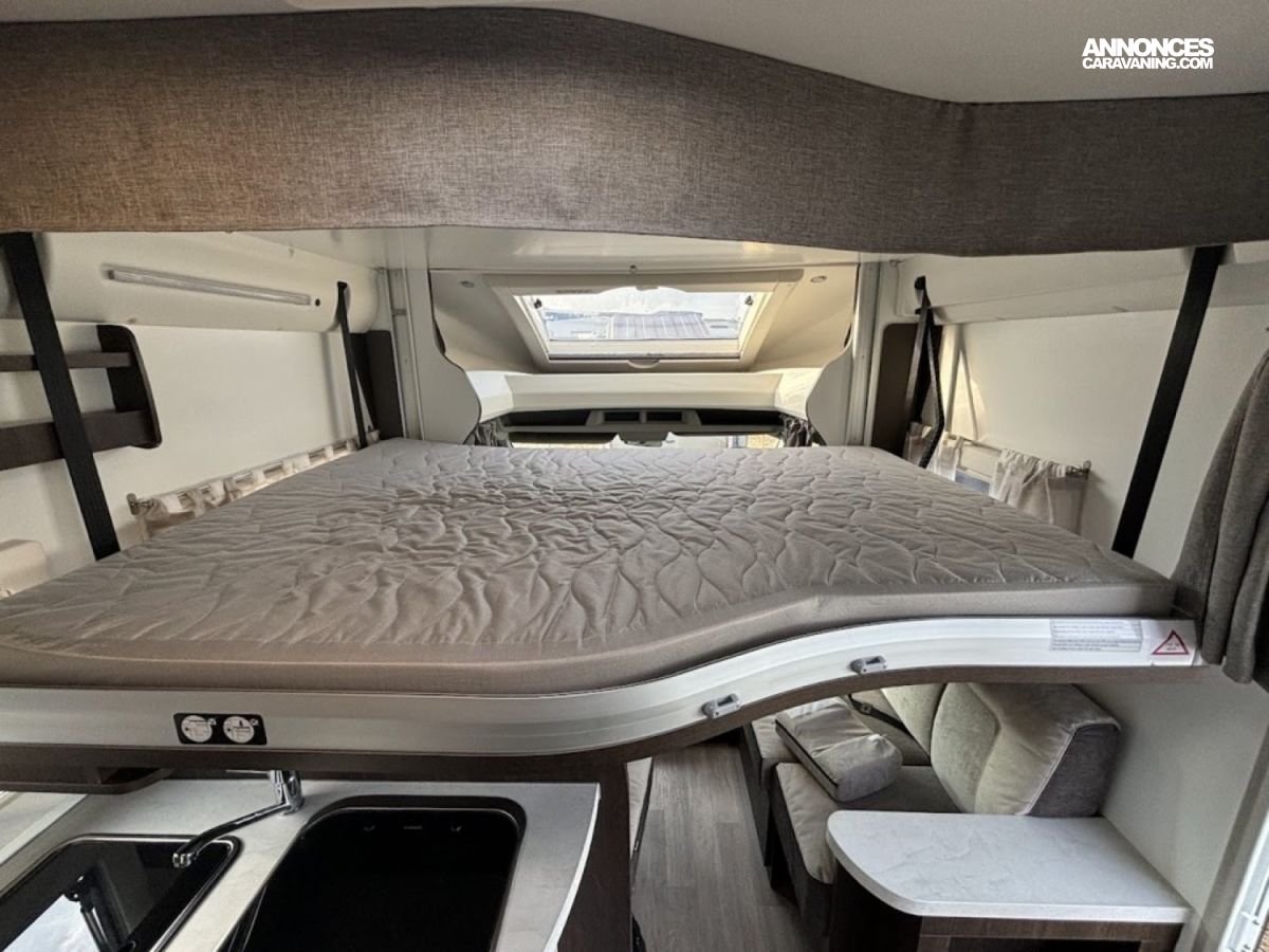 Cuisine en L, Douche indépendante, Grande soute, Lit dînette avant, lit jumeaux, lit pavillon, Salon avant sièges pivotants, Salon en L, WC Cassette.