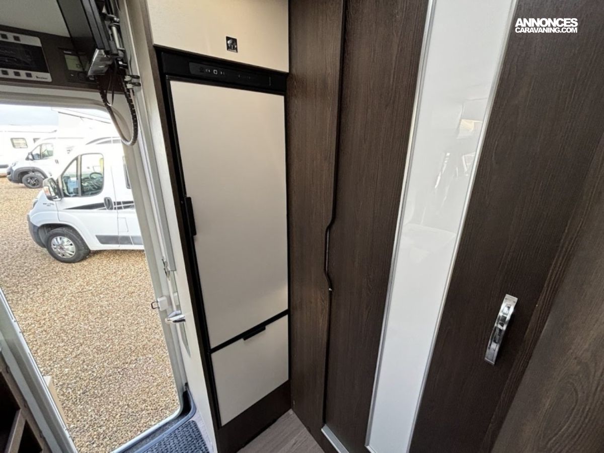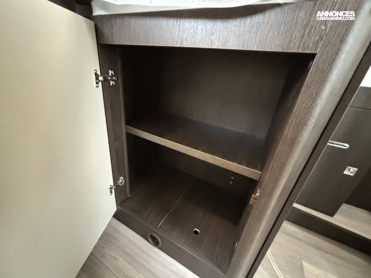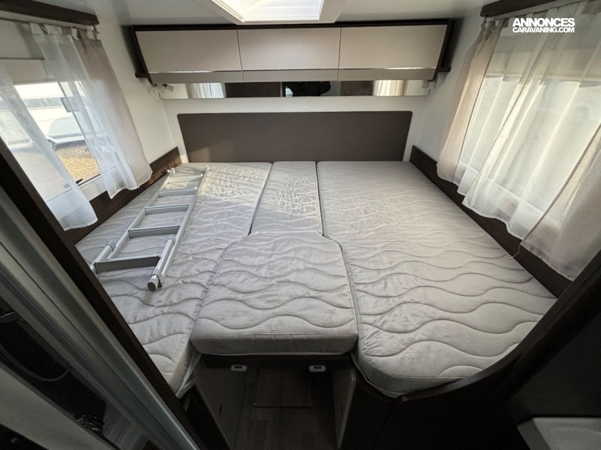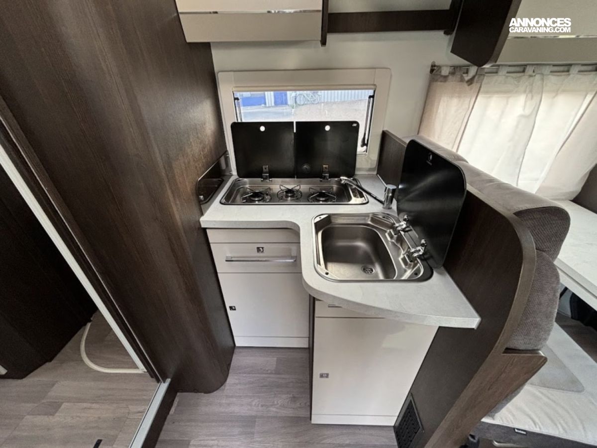 Cuisine en L, Douche indépendante, Grande soute, Lit dînette avant, lit jumeaux, lit pavillon, Salon avant sièges pivotants, Salon en L, WC Cassette.