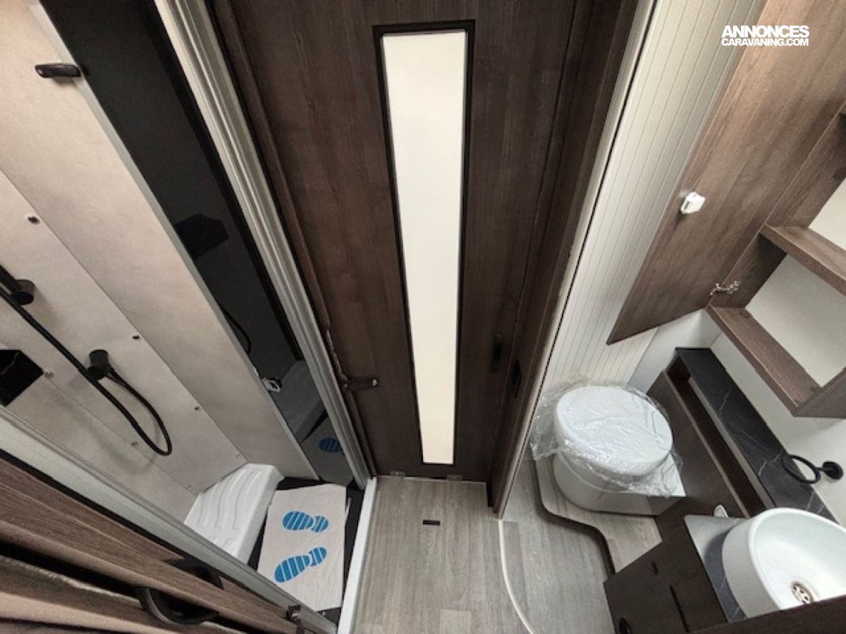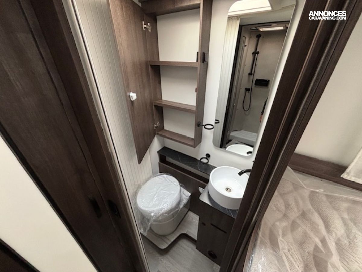 Salle de bain avec douche indépendante, nombreux rangements, grande soute accessible, excellente isolation et finitions soignées : tout est réuni pour voyager sereinement, sans compromis sur le confort.