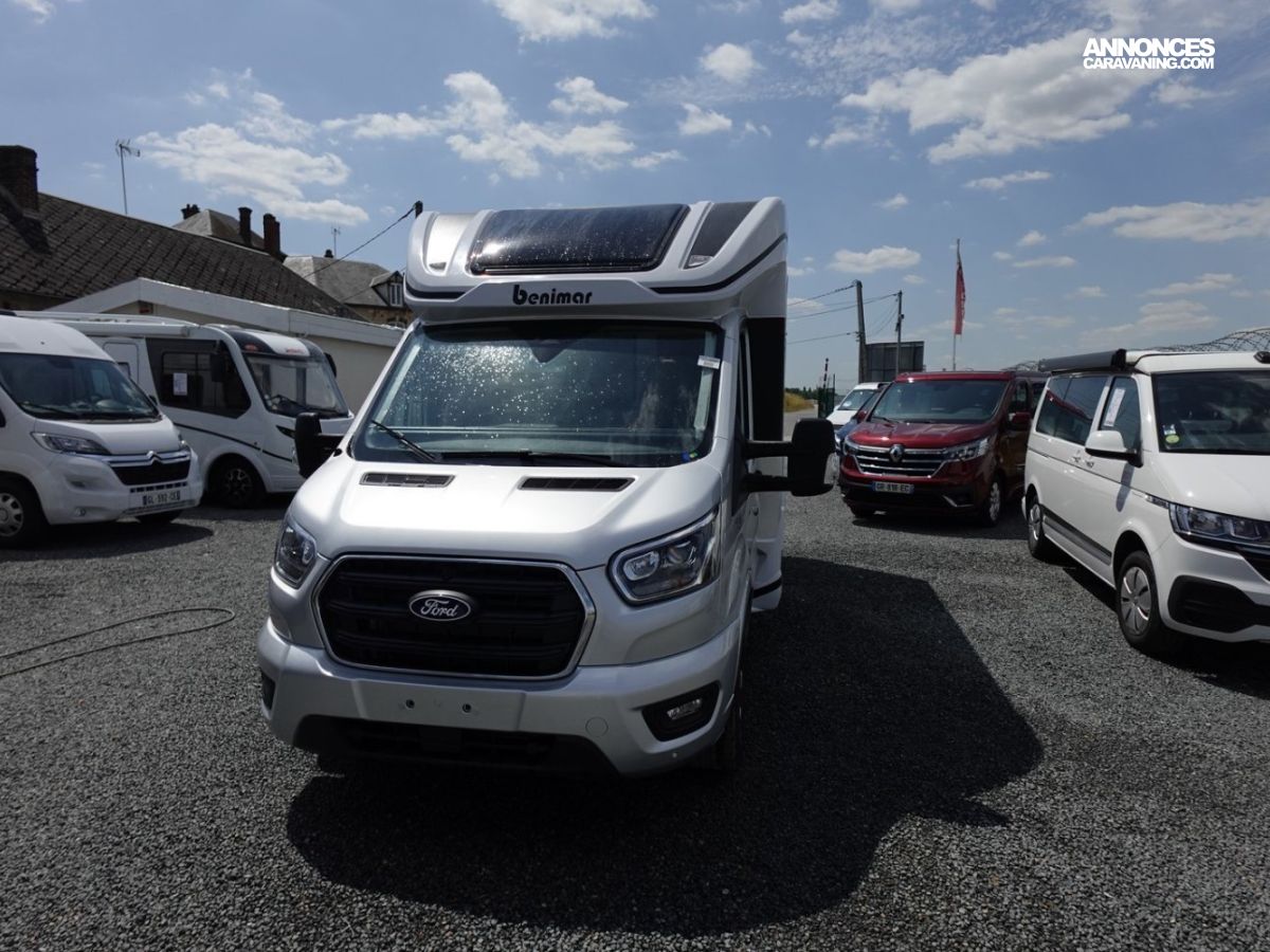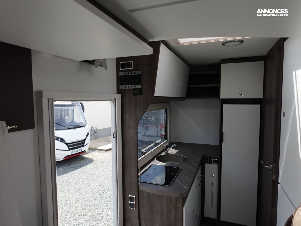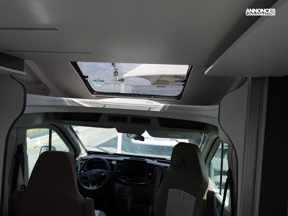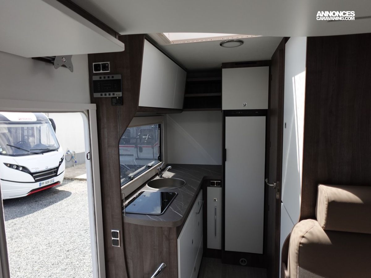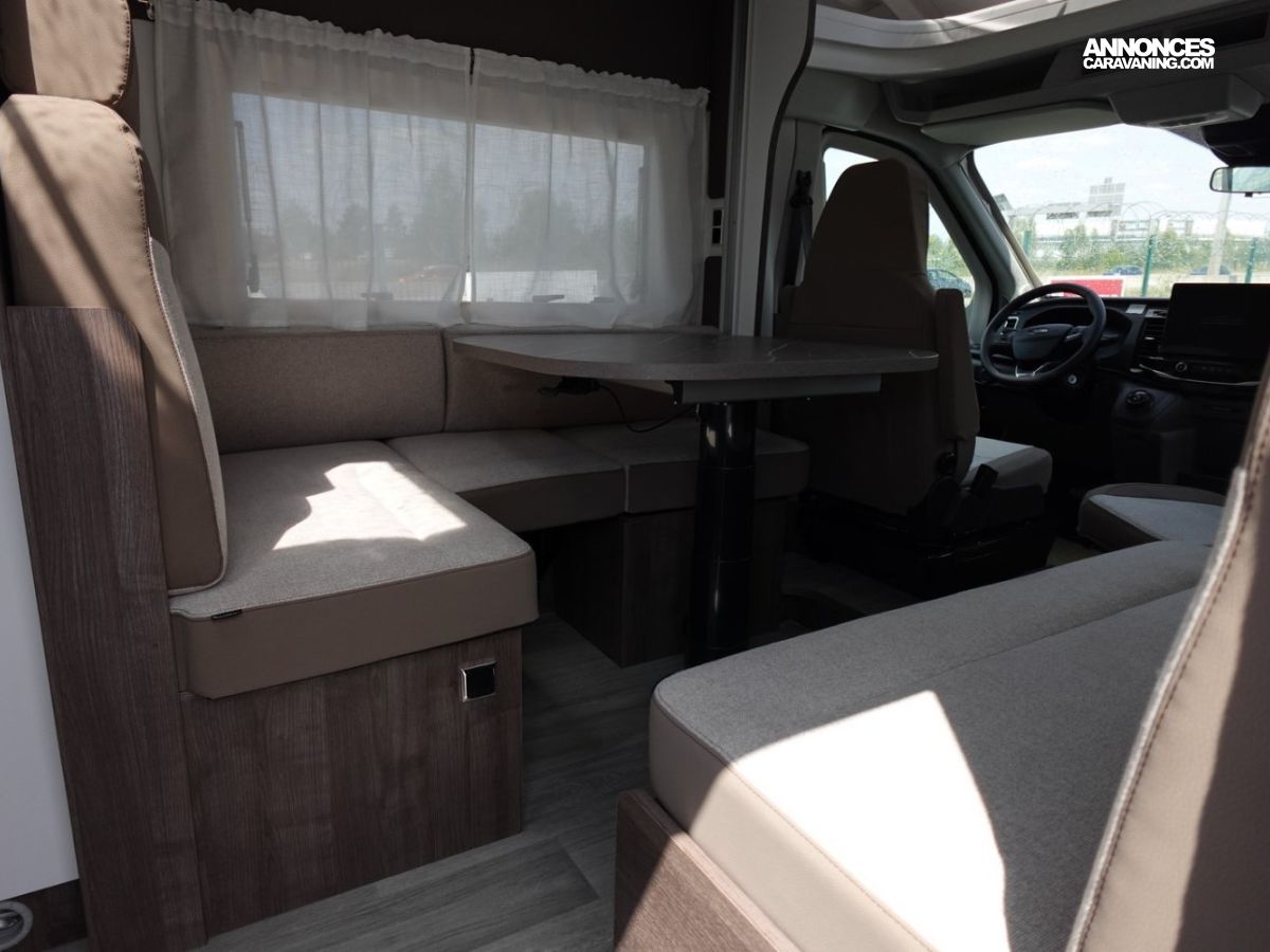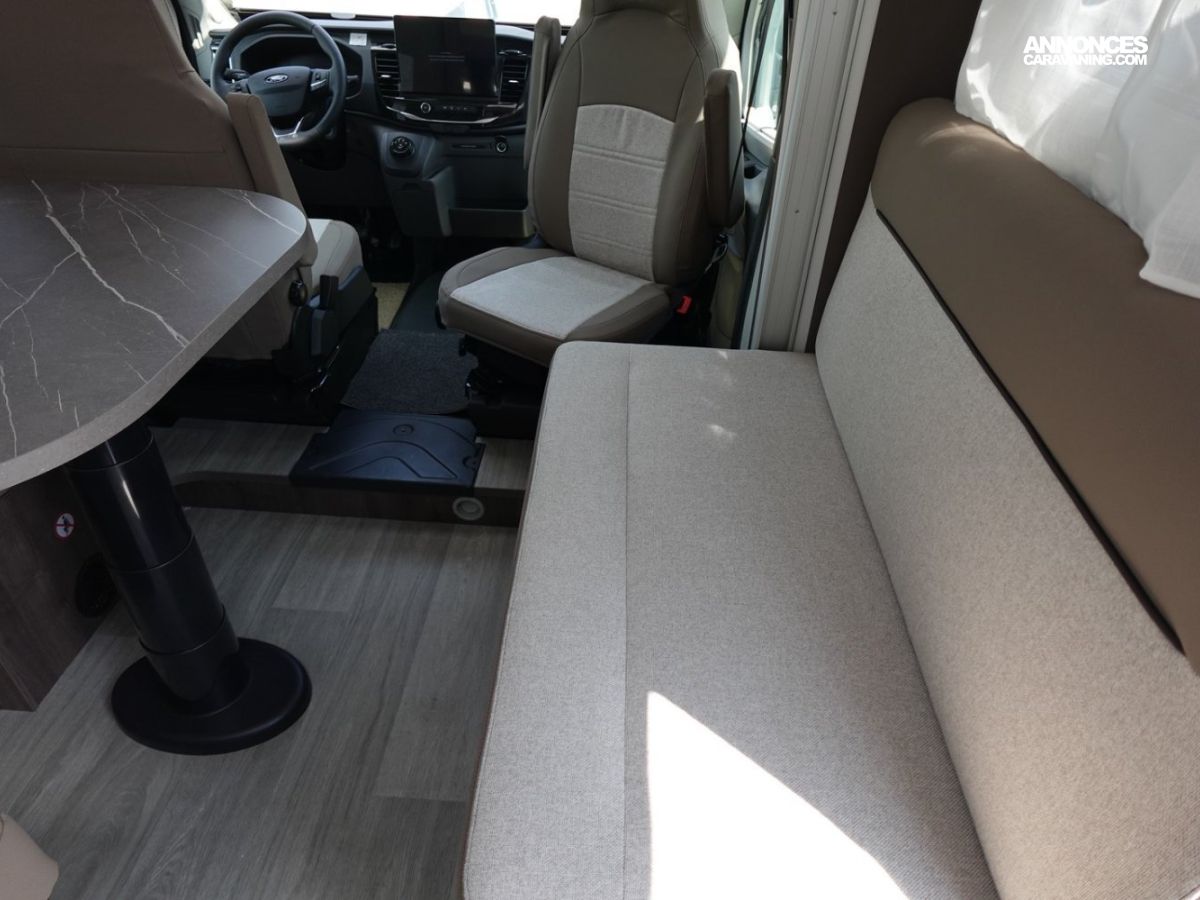 Magnifique petit profilé de moins de 6 mètres comprenant un grand salon avant panoramique avec banquette face/face, une douche séparée, un lit de pavillon électrique et une cuisine avec de nombreux rangements.