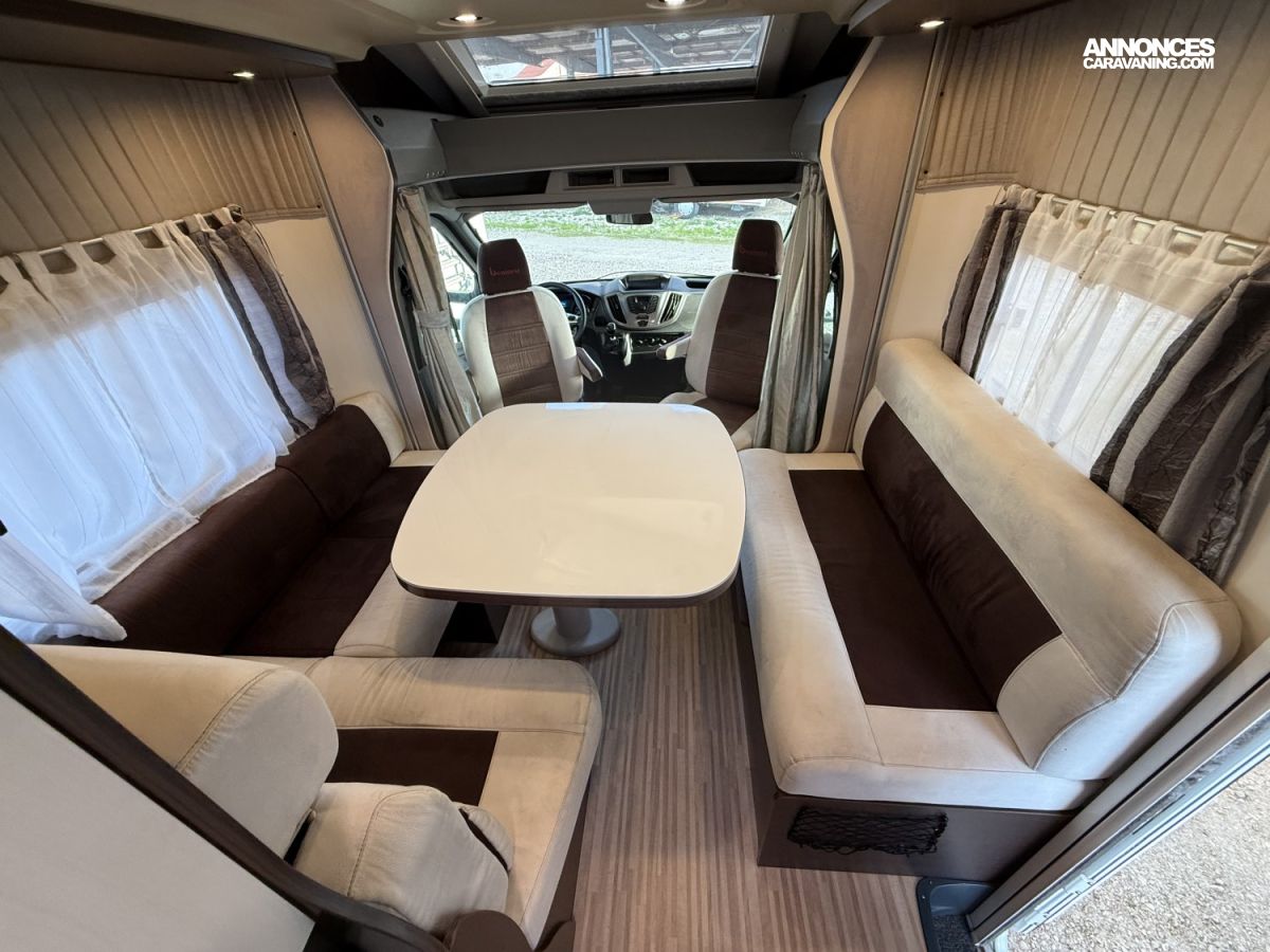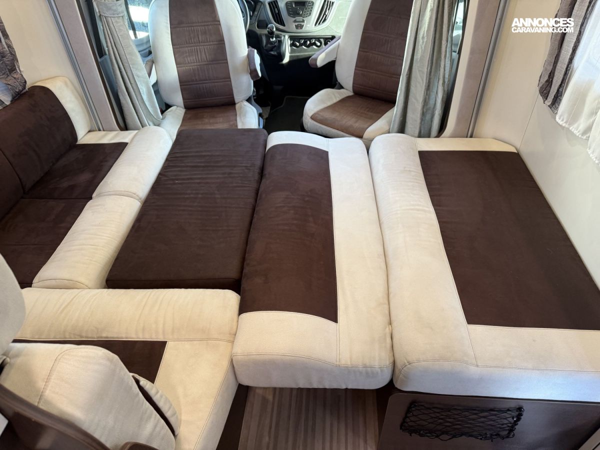 Dès l’entrée, on découvre un maxi salon lumineux et convivial, parfaitement mis en valeur par de larges ouvertures et un toit ouvrant panoramique. L’agencement permet de profiter d’un véritable espace de détente, confortable et accueillant, aussi agréable en étape qu’en stationnement prolongé.