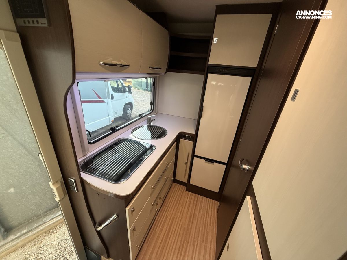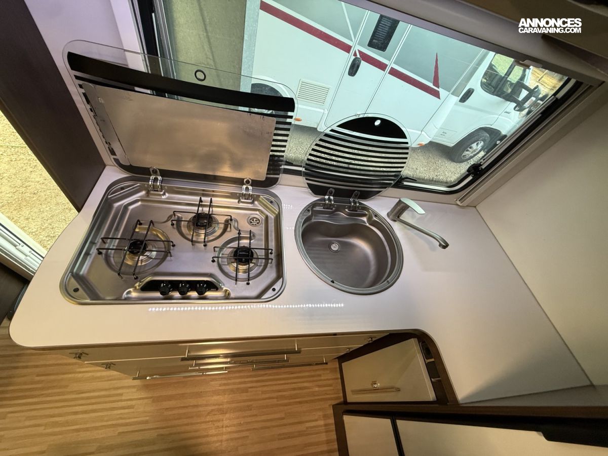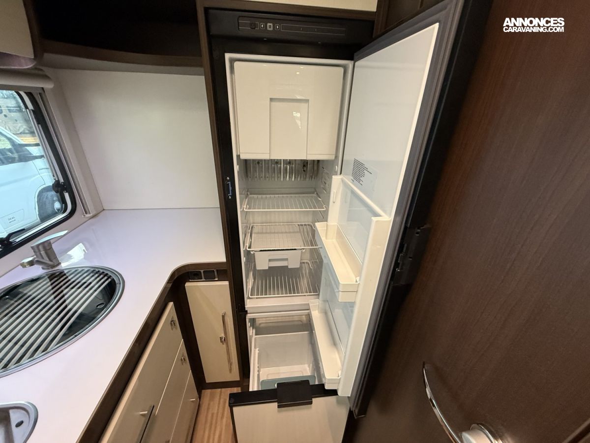 La cuisine XL, véritable point fort de ce modèle, offre un plan de travail généreux, de nombreux rangements, un évier et un réchaud trois feux intégrés, ainsi qu’un grand réfrigérateur-congélateur de 140 L avec tiroir à bouteilles. Tout est pensé pour cuisiner facilement, comme à la maison, même lors de longs voyages.
