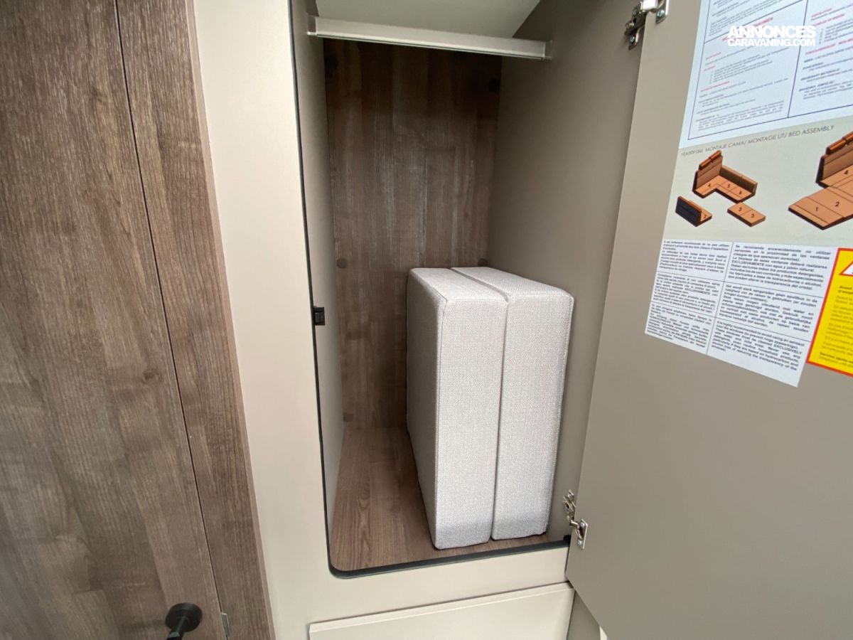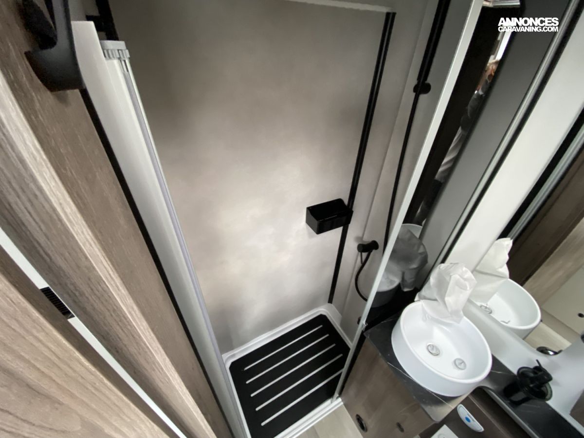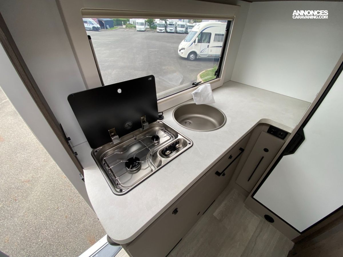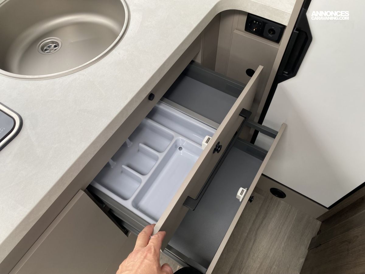 Espace pour bouteilles de gaz :1, Chauffe-eau gaz, Chaudière utilisant carburant véhicule Webasto - 4000 W, Prises 230 et 12 V dans le garage, Grand réfrigérateur / congélateur à compression 150 l, Porte cellule XL, ISOFIX sur sièges de salle à manger (Pack PLUS), Douche séparée, Grand salon en L, Pied de table électrique télescopique, Réfrigérateur à compression de 150 litres, Coffres sous le sofa et derrière l'armoire avec serrures