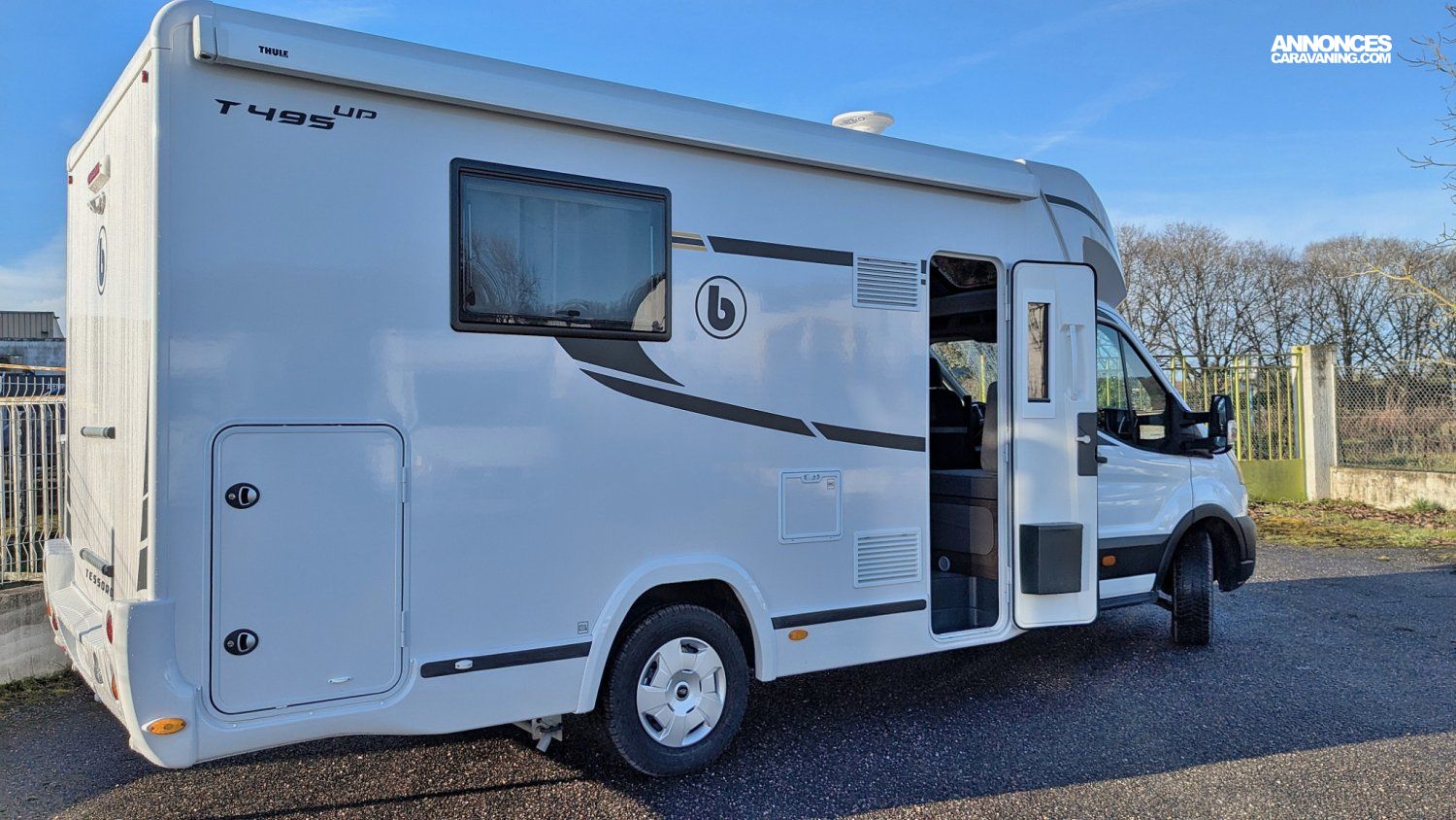 Benimar Tessoro 495 UP 2025 sur Ford 130 cv BV6, un profilé suréquipé à prix très serré de 7,05 m avec lit central arrière sur soute, salle d'eau/WC, douche indépendante, cuisine avec grand frigo/congel et maxi salon avec sièges pivotants. Lit de pavillon électrique supplémentaire pouvant accueillir 2 personnes au dessus du salon.
