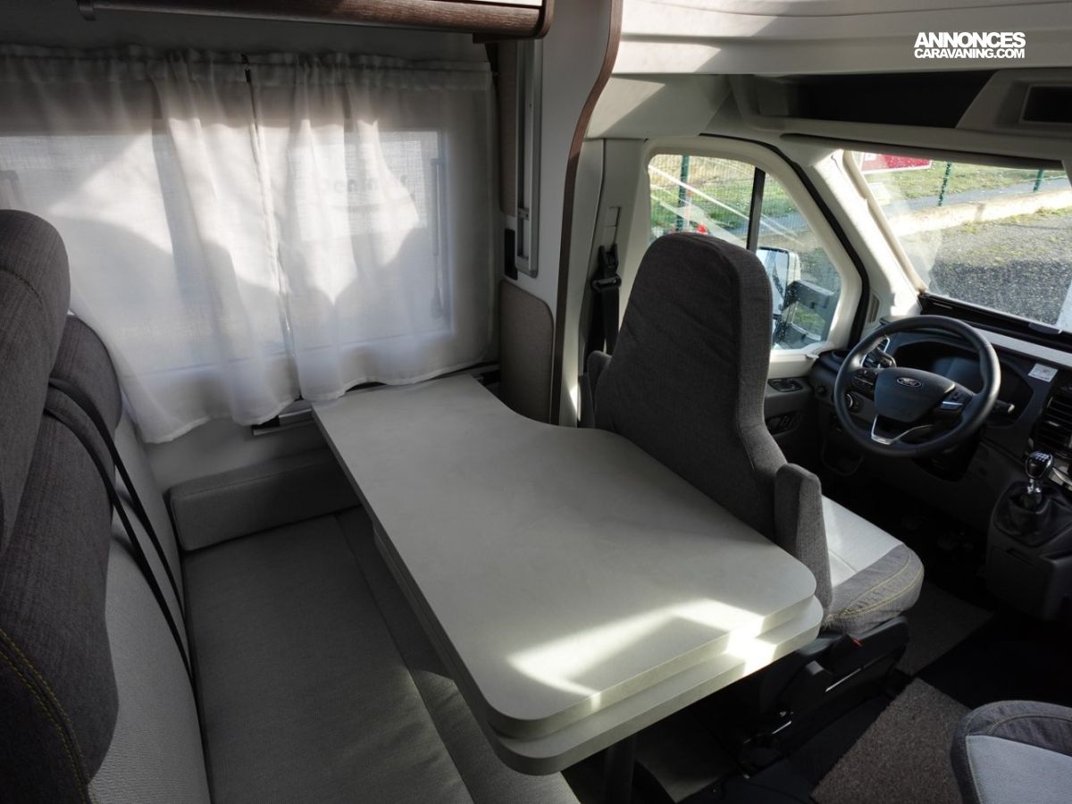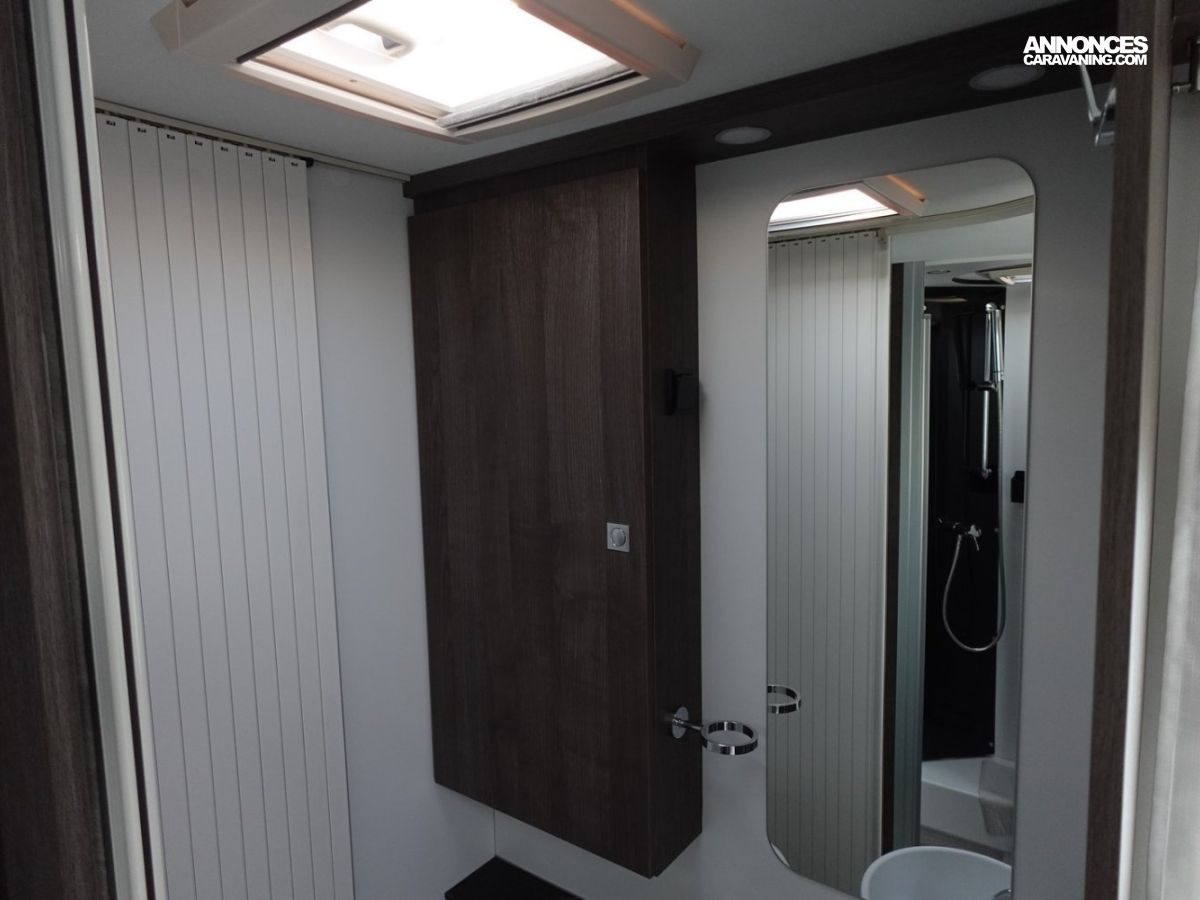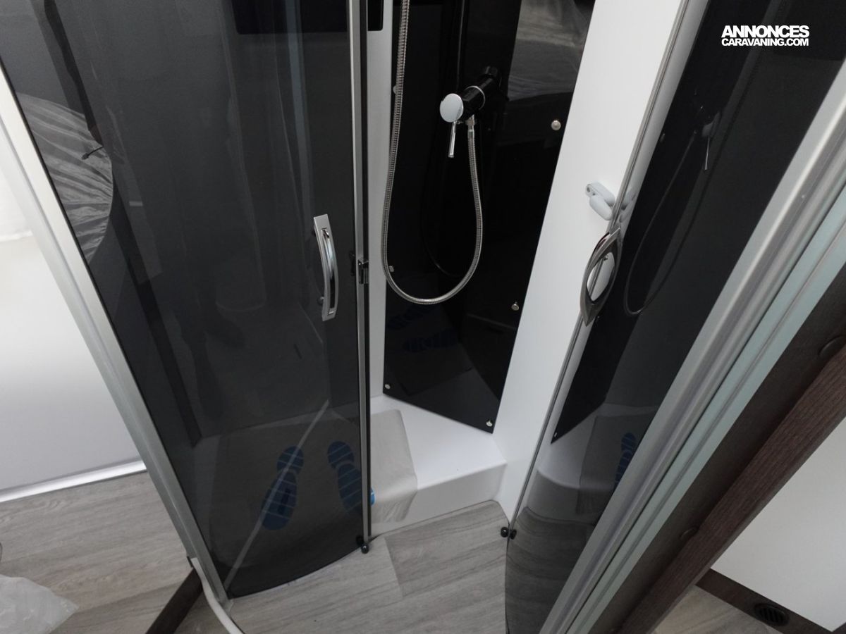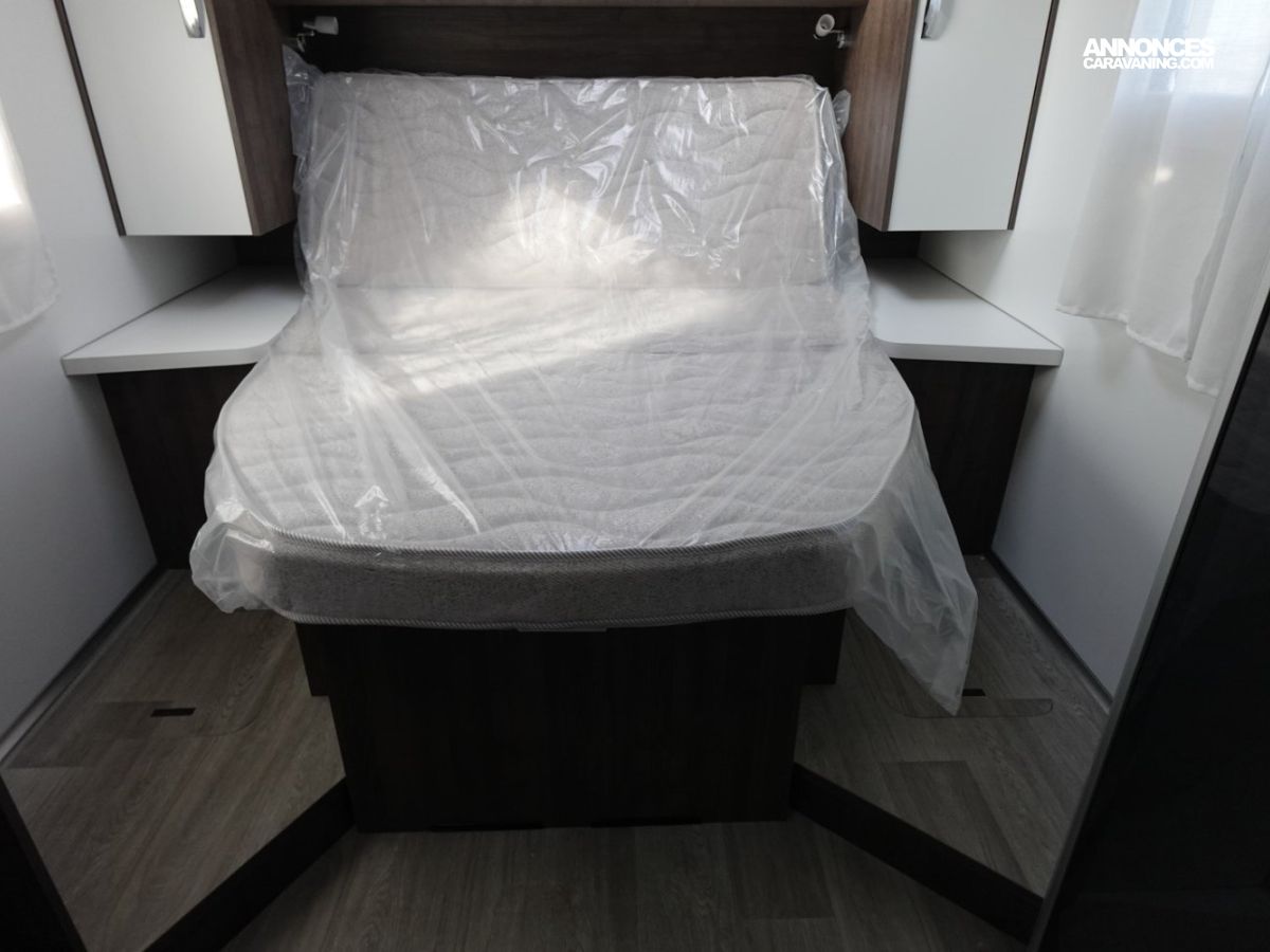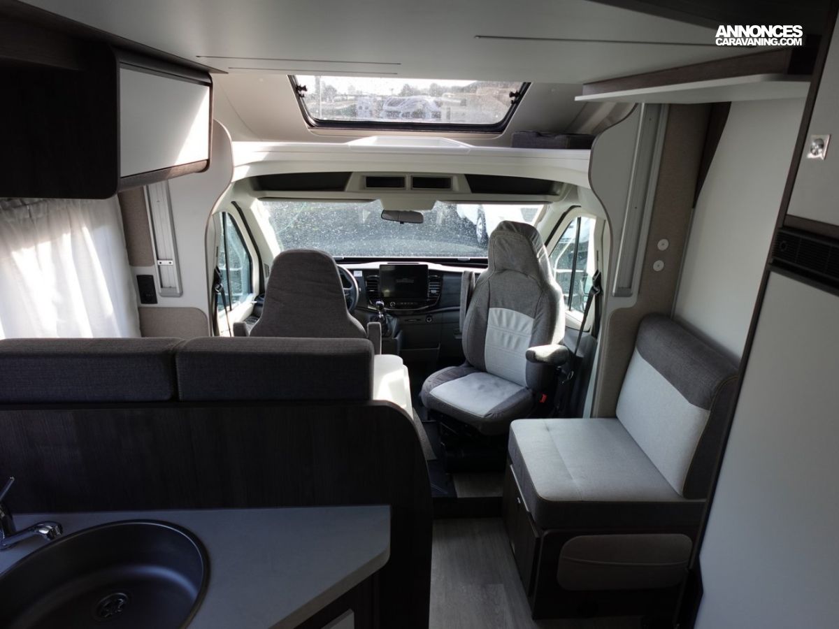 Profilé déjà tout équipé et prêt à partir comprenant un lit central, une douche indépendante de l’espace WC / lavabo, une cuisine en L avec de nombreux rangements, un salon avant panoramique et un lit de pavillon 2 places.