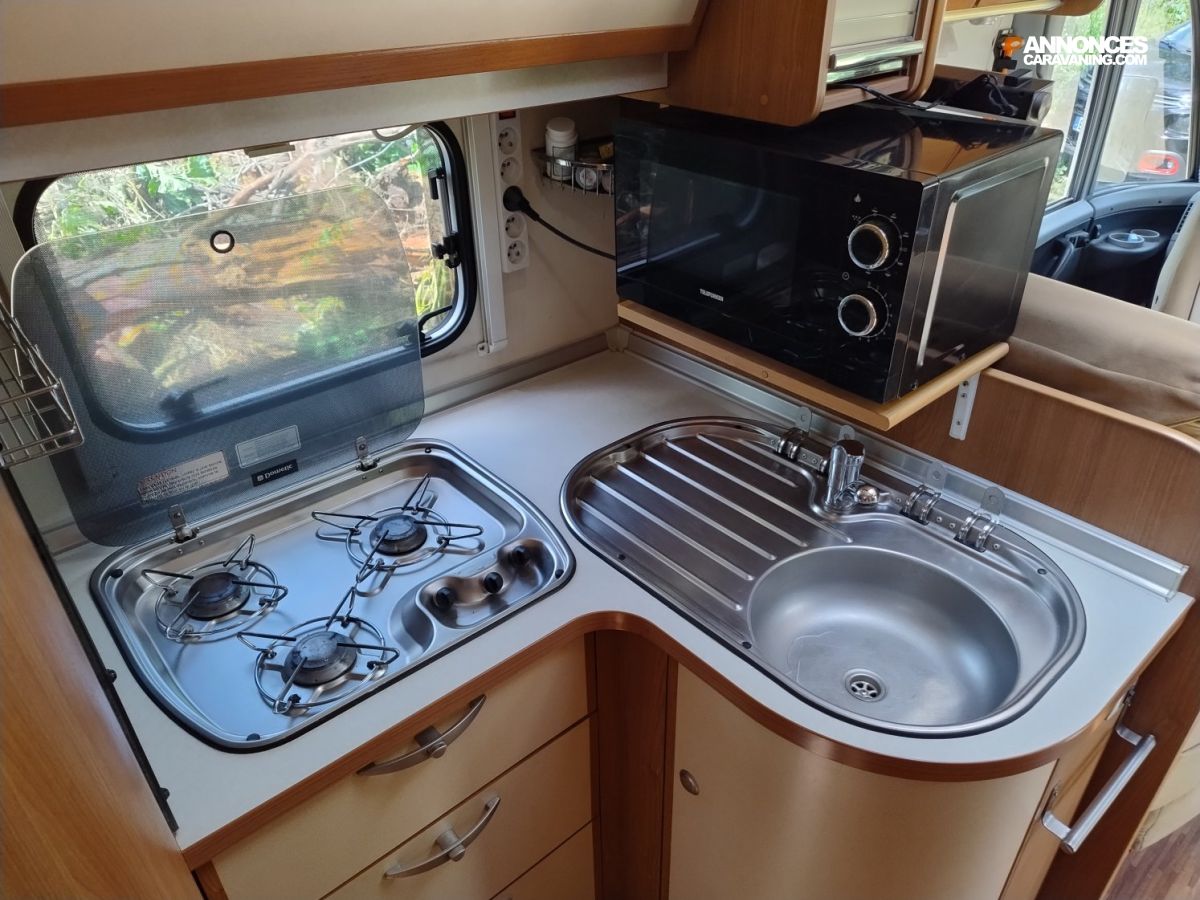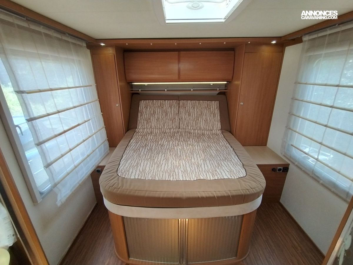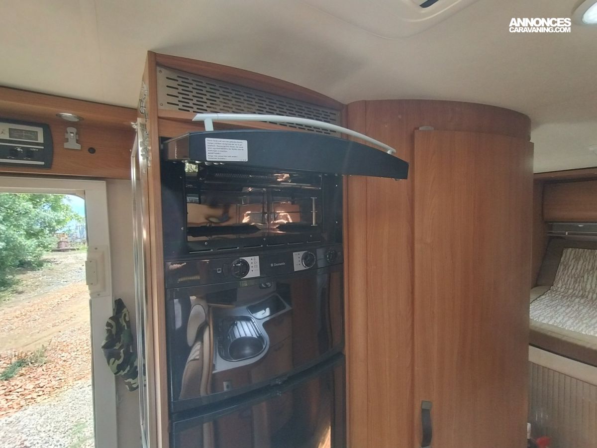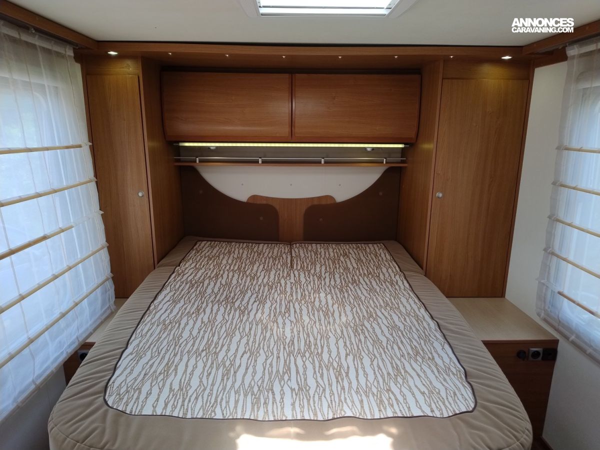 Une implantation idéale pour un couple ou une famille : lit central permanent relevable et grand lit de pavillon à l’avant, cuisine toute équipée avec four et grand frigo-congélateur, salon spacieux, cabine de douche et cabinet de toilette indépendants.