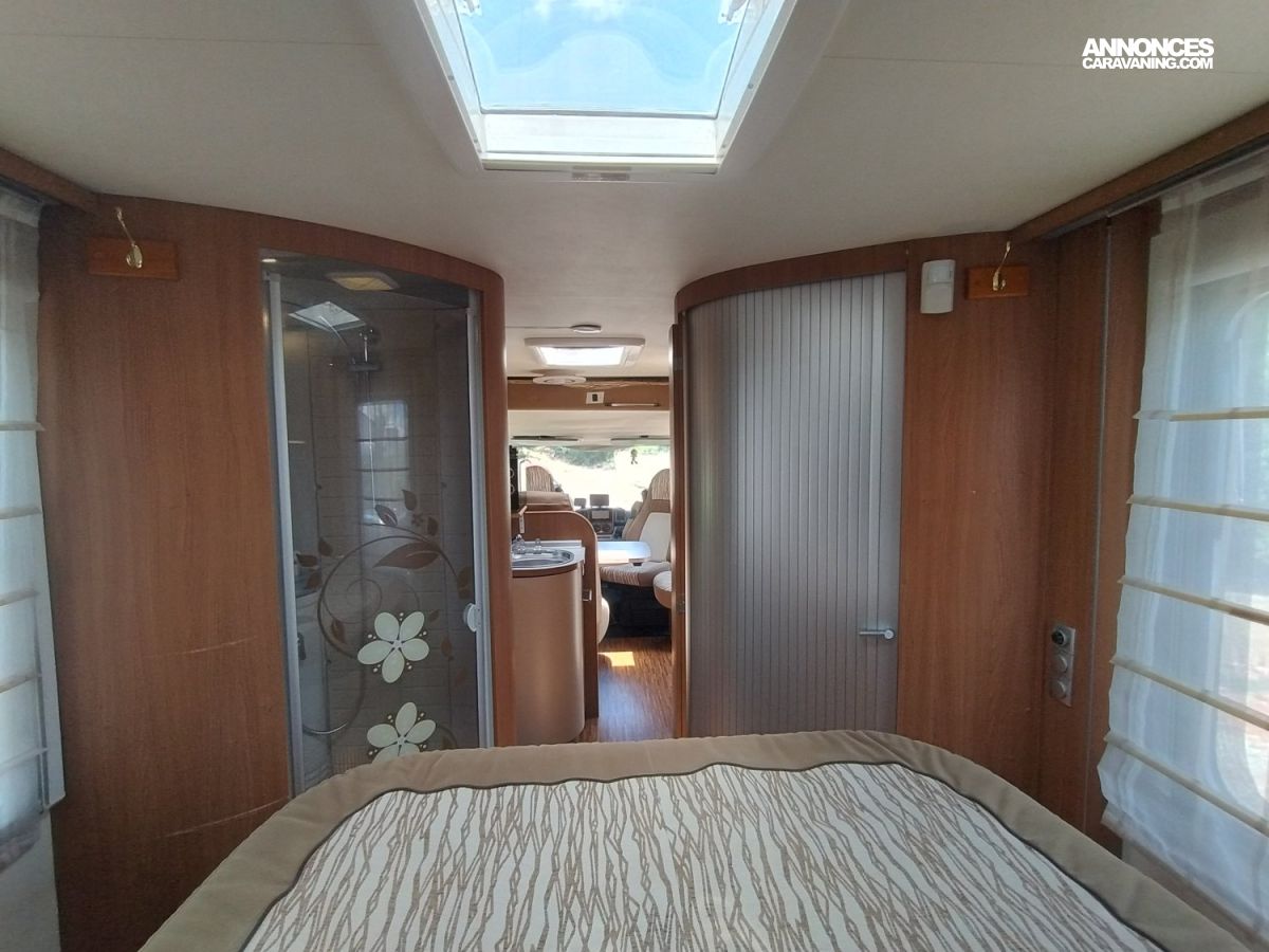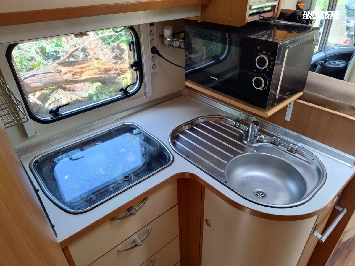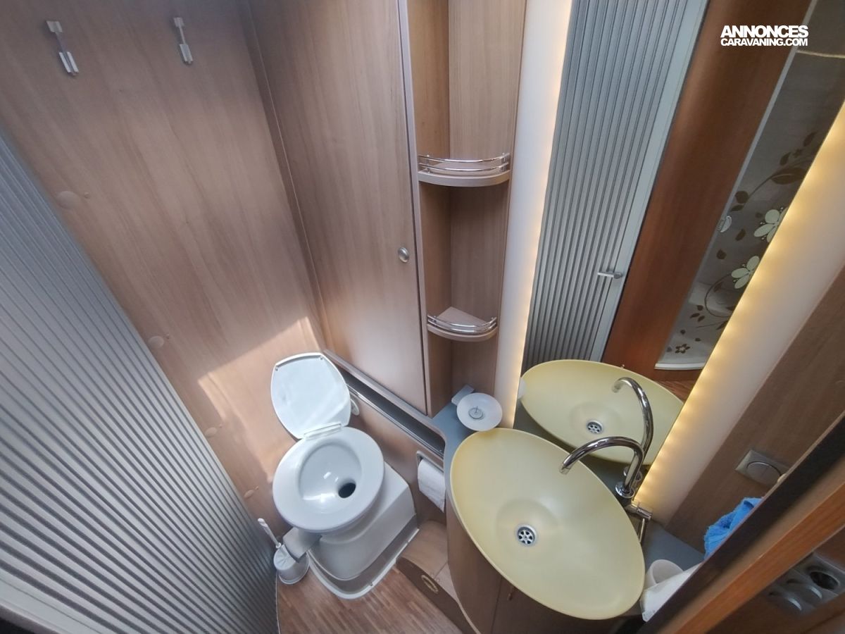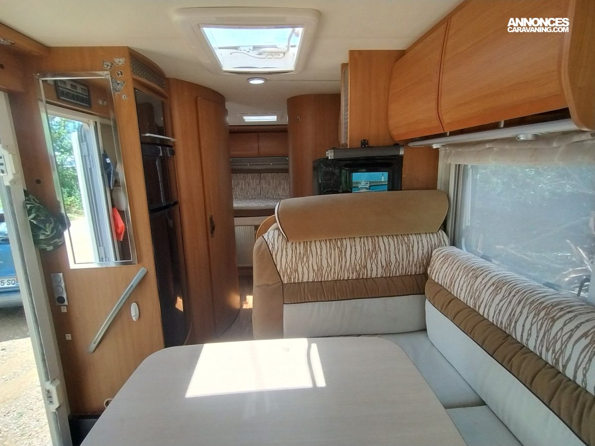 Une implantation idéale pour un couple ou une famille : lit central permanent relevable et grand lit de pavillon à l’avant, cuisine toute équipée avec four et grand frigo-congélateur, salon spacieux, cabine de douche et cabinet de toilette indépendants.