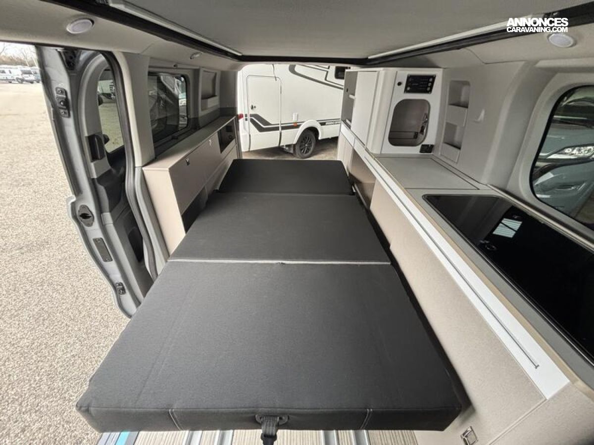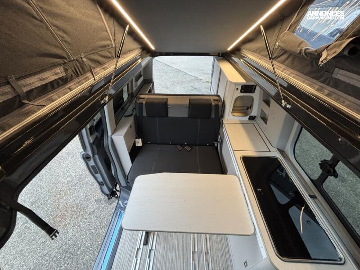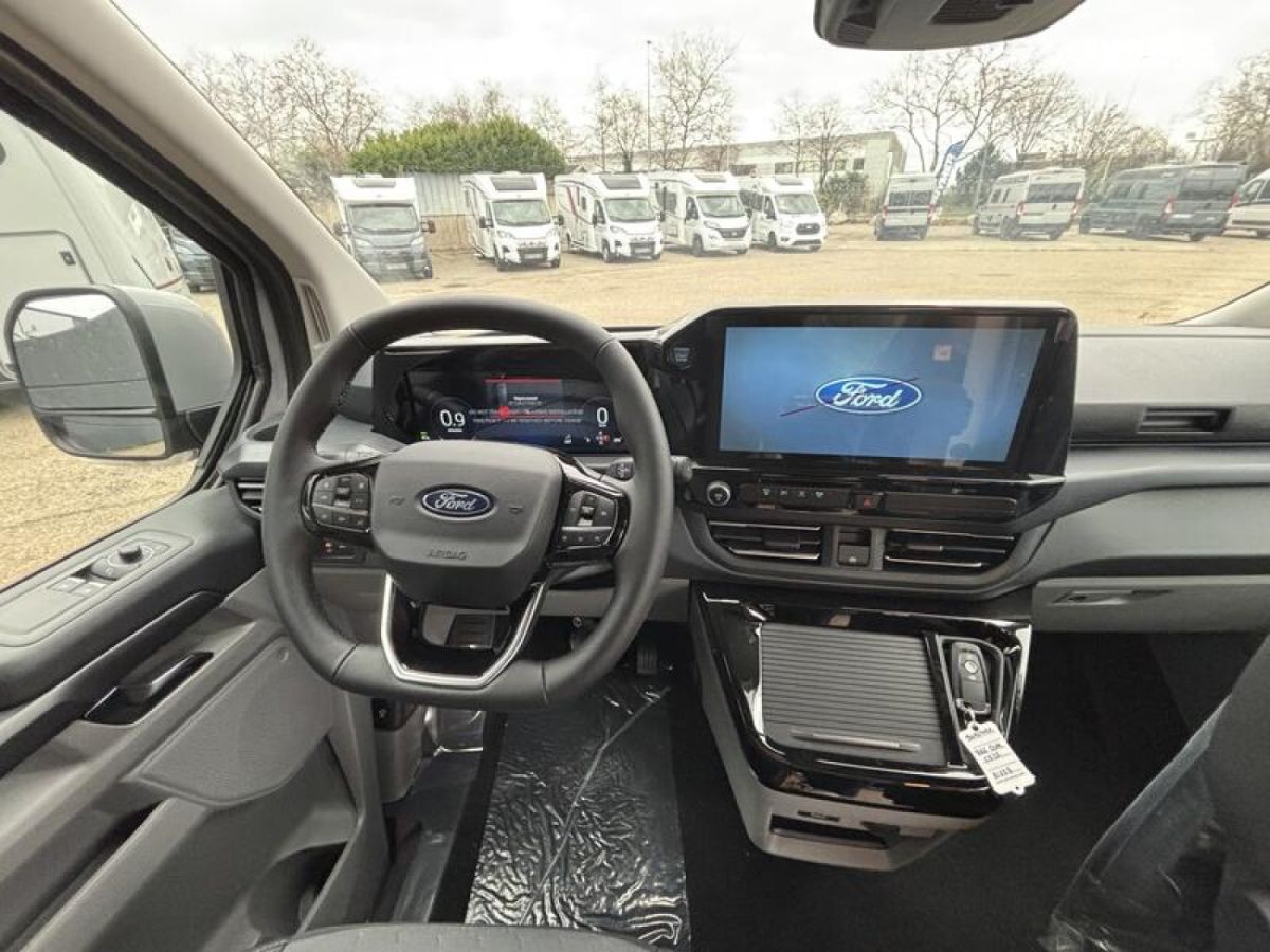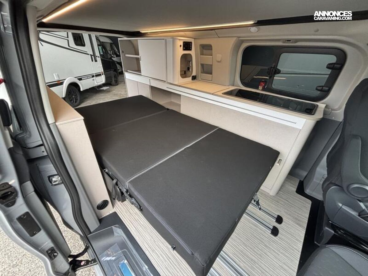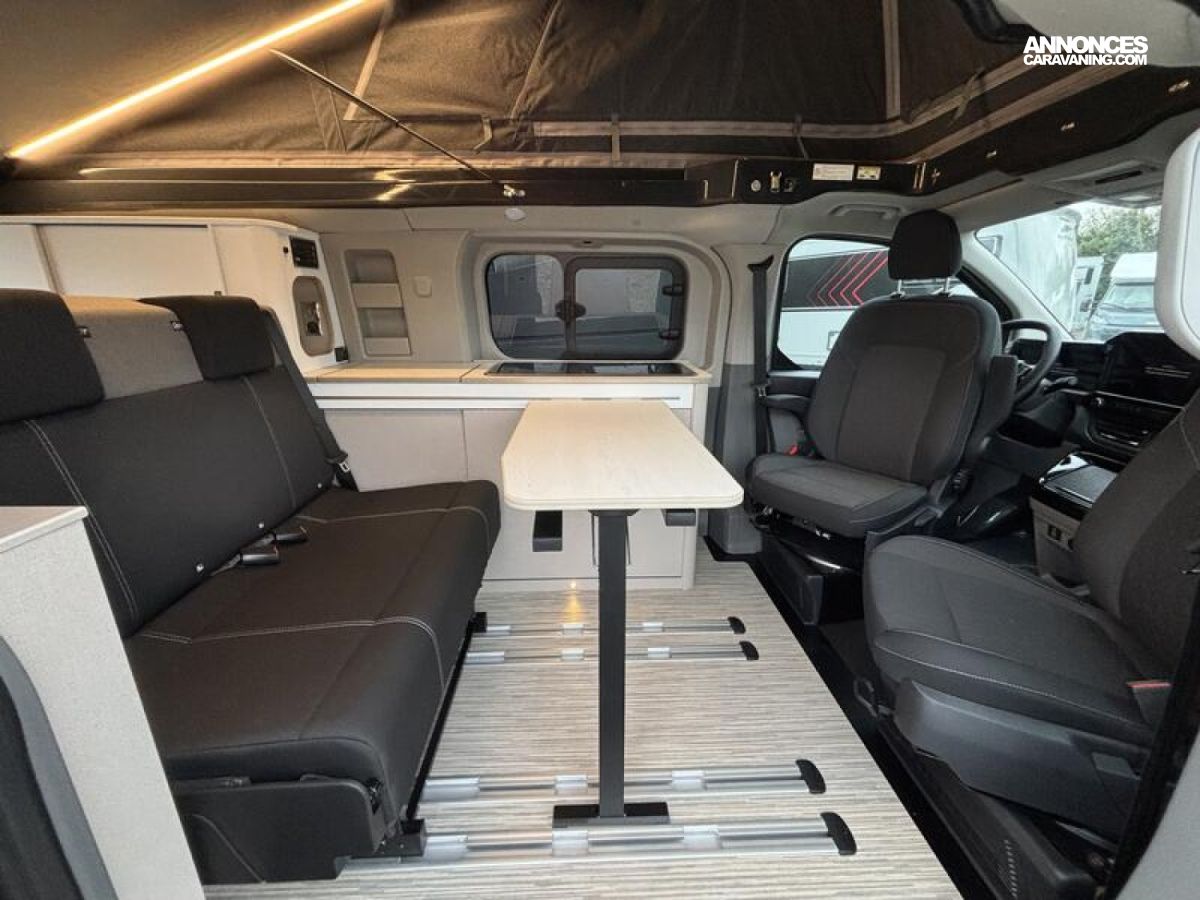 SERIE LIMITEE B66 Ford Tourneo Custom V 710 - 170 ch – Titanium / Boîte automatique / Peinture extérieure Gris Matter avec toit relevable anthracite / Réservoir carburant 70 litres / Climatisation bi-zone (zone conducteur et passager) / Pré-équipement attelage / Jantes alu 17’’ avec pneus 4 saisons / Store extérieur anthracite 3,0 m / OEillets d'arrimage pour le système de rails coulissants /Chauffage stationnaire Diesel 2 kW/Régulateur de vitesse adaptatif et système Stop & Go / Système de navigation intégré écran 13‘‘ / Caméra de recul / Avertisseur d’angle mort / Système de reconnaissance des panneaux de signalisation / Assistance au freinage d'urgence / Projecteurs LED / Volant chauffant / Stores occultants cabine et habitation : 0 €