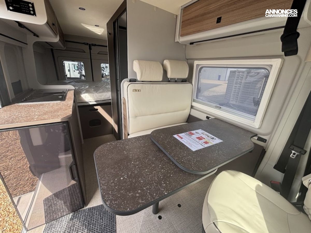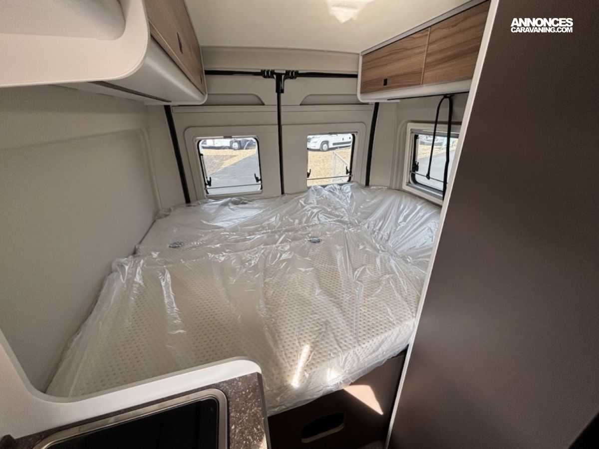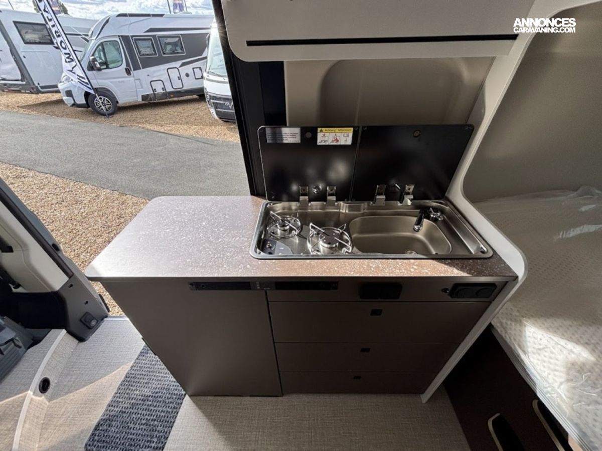 Cuisine en long, Douche à vario, Lit arrière transversal, Lit toit relevable, Salon avant sièges pivotants, WC Cassette.