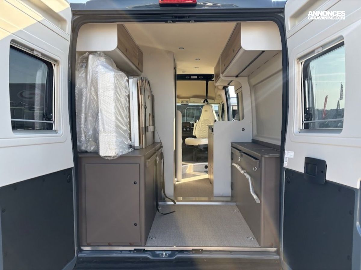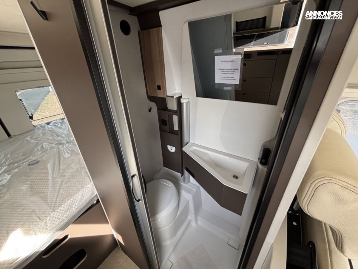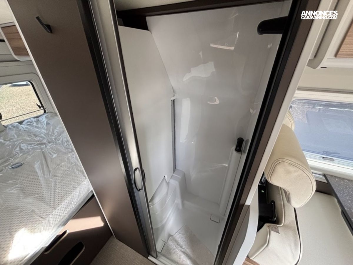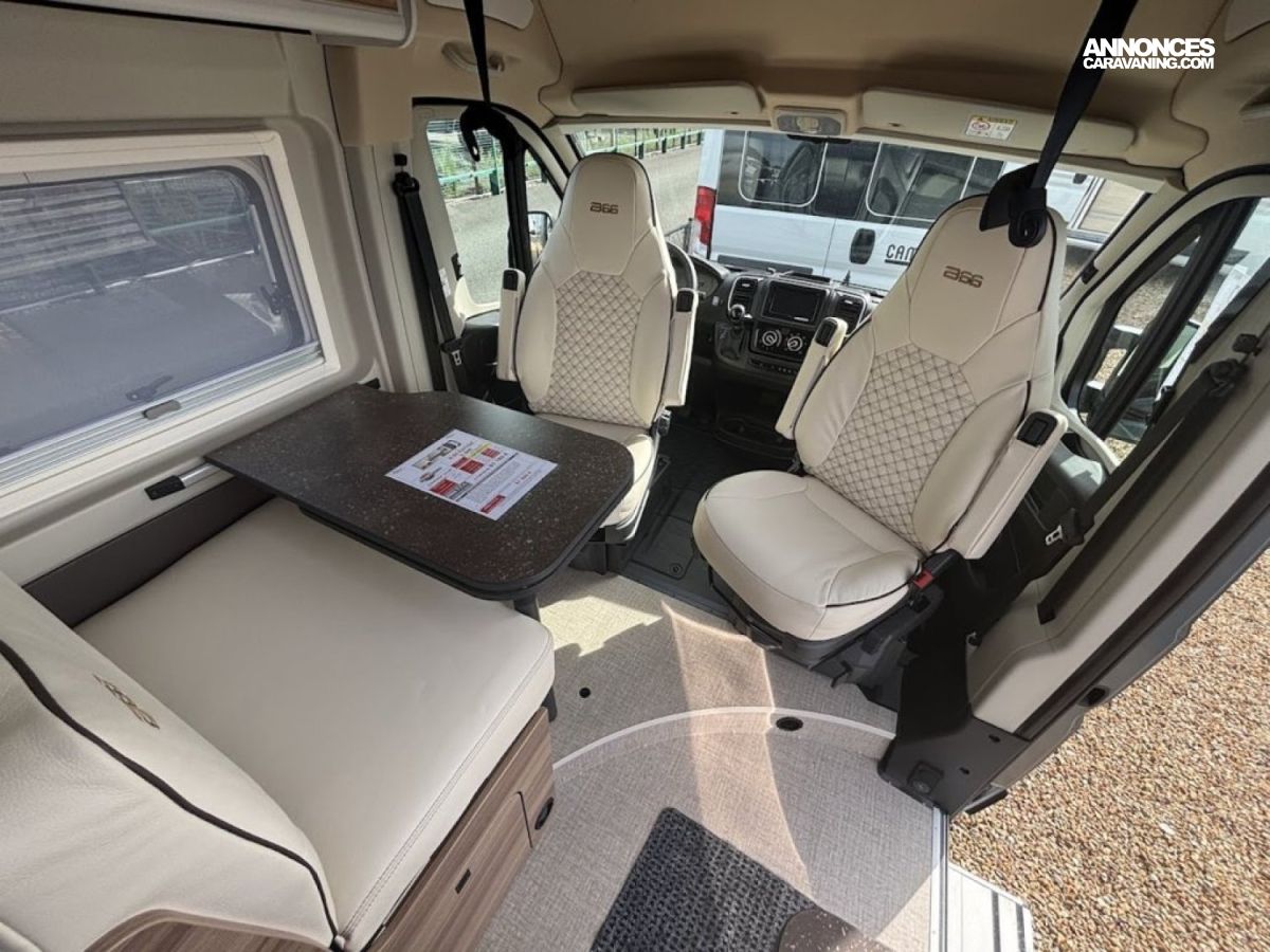 Cuisine en long, Douche à vario, Lit arrière transversal, Lit toit relevable, Salon avant sièges pivotants, WC Cassette.