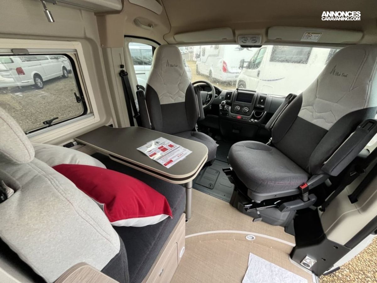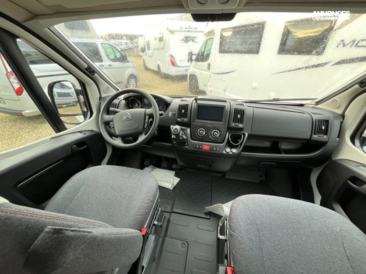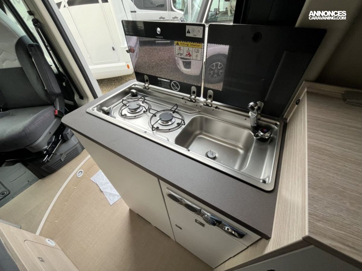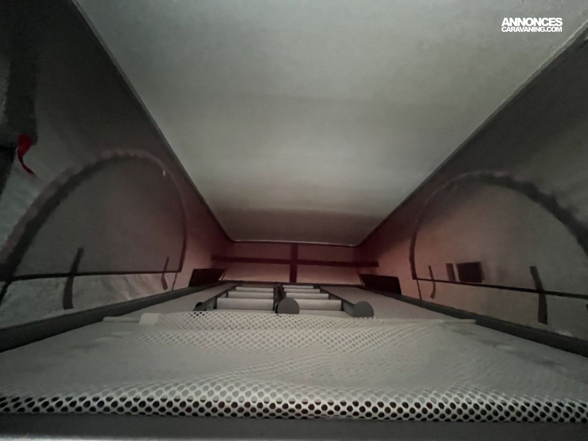 Bac de douche, Cuisine en long, Lit central transversal, Lit toit relevable, Salon avant sièges pivotants, WC Cassette.