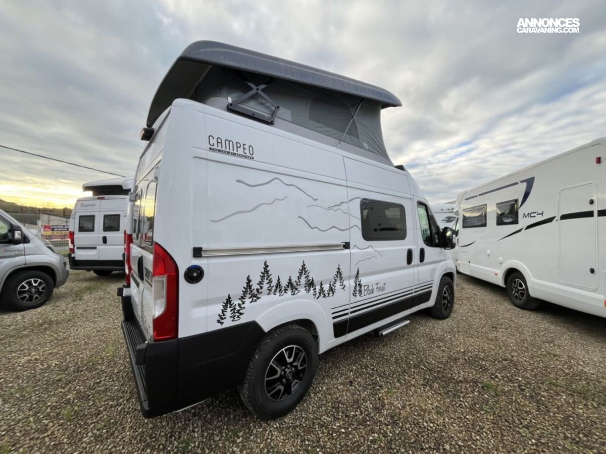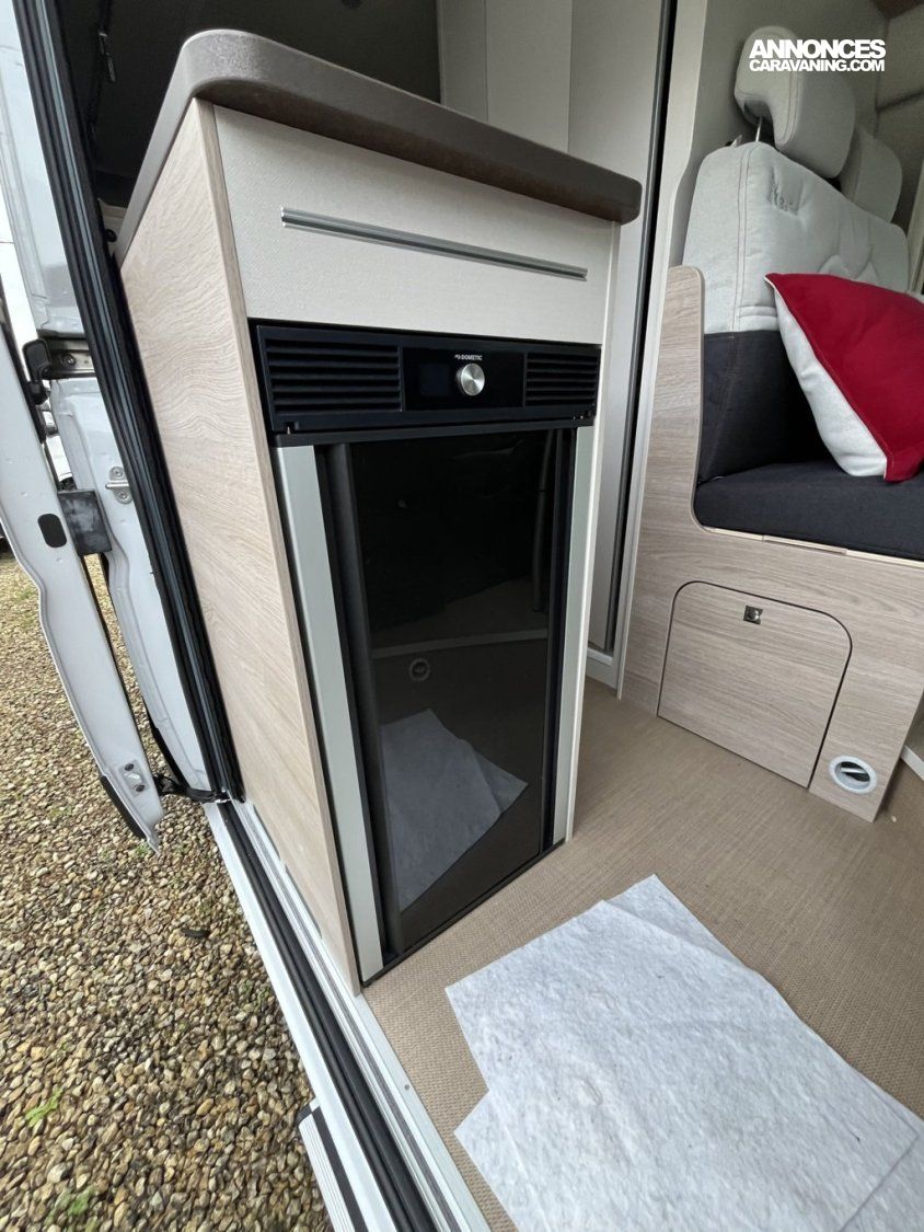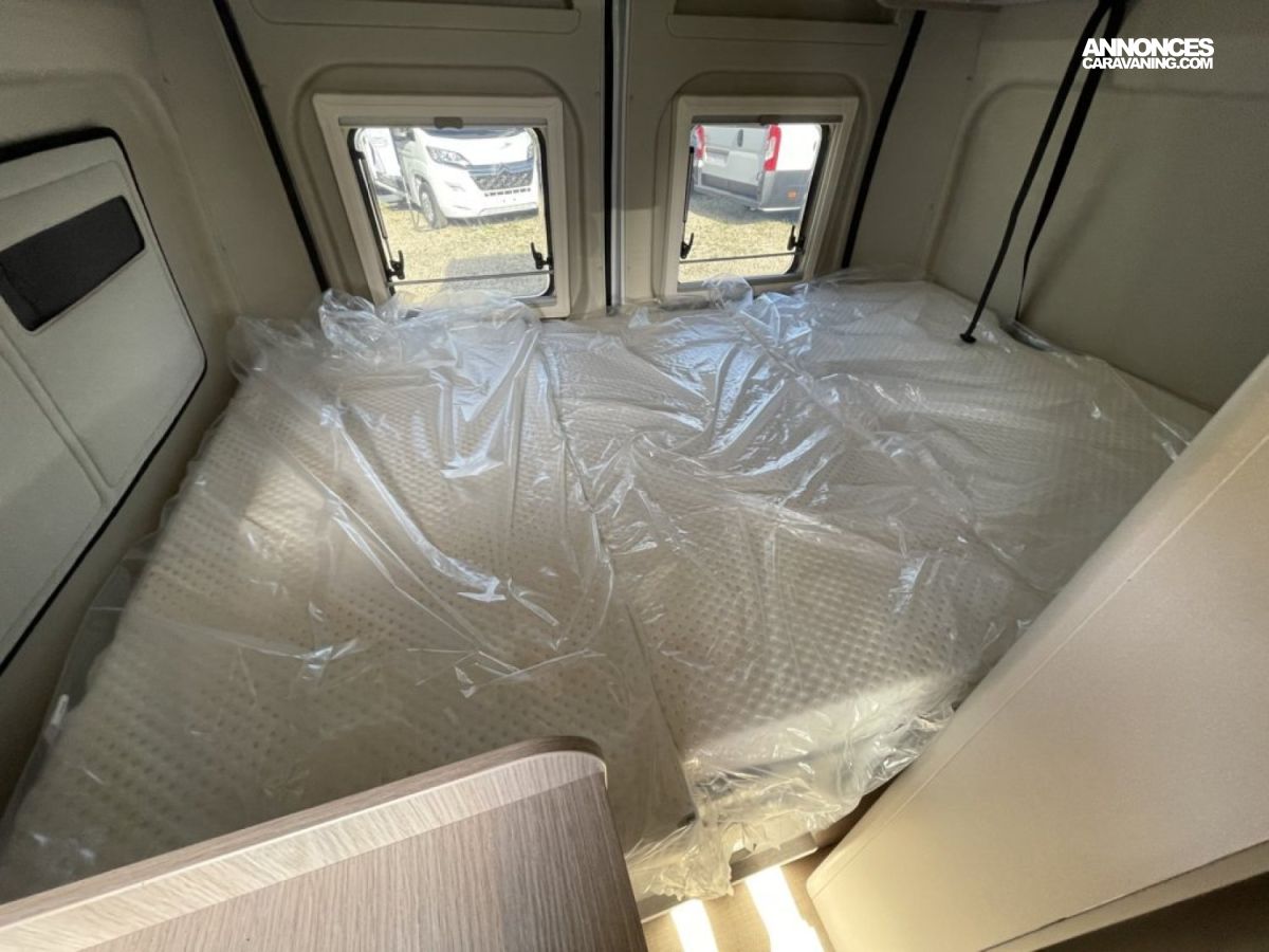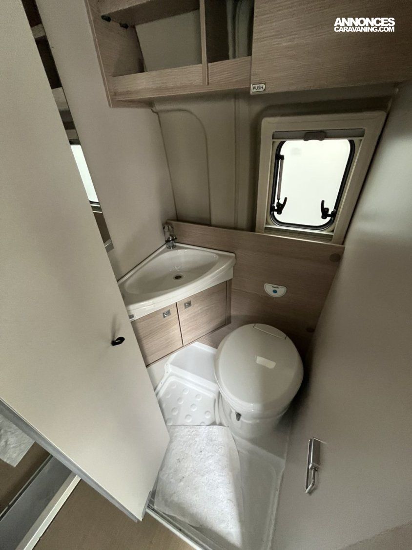 Bac de douche, Cuisine en long, Lit central transversal, Lit toit relevable, Salon avant sièges pivotants, WC Cassette.