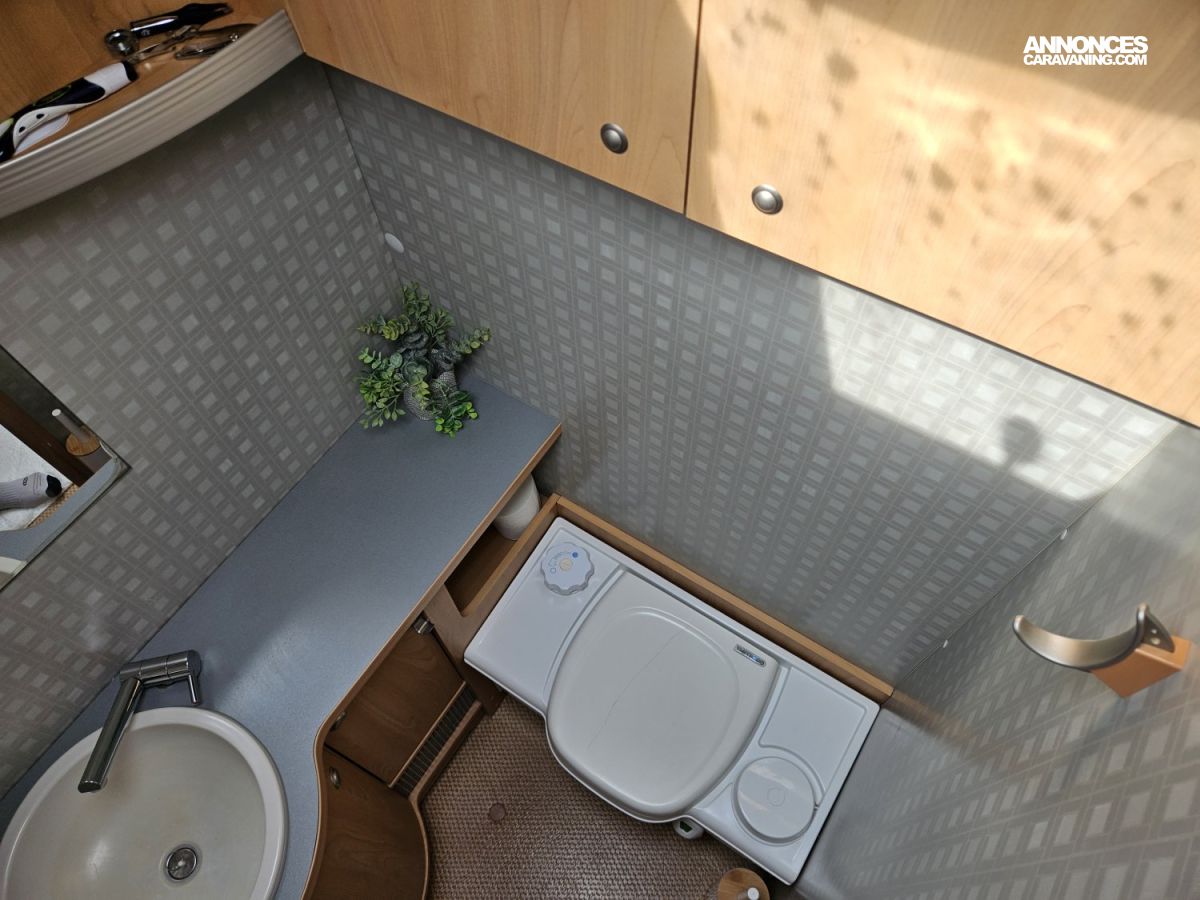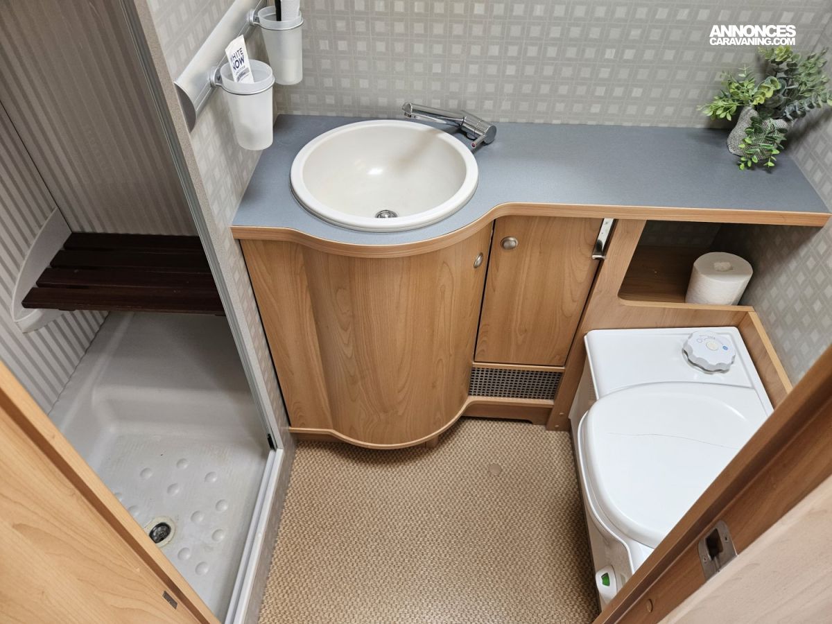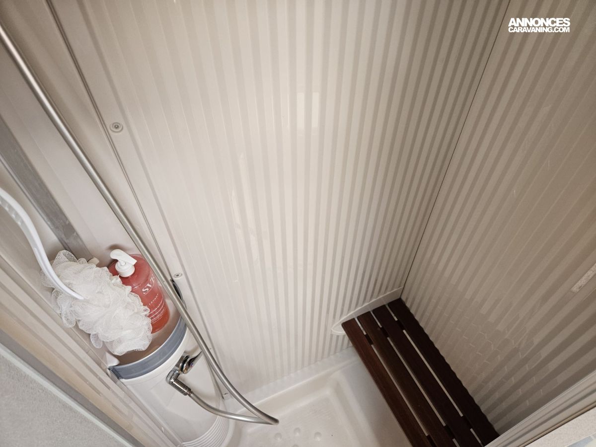 La salle de bain est équipée d'une douche et de WC séparés, avec en plus une douchette dans la soute.