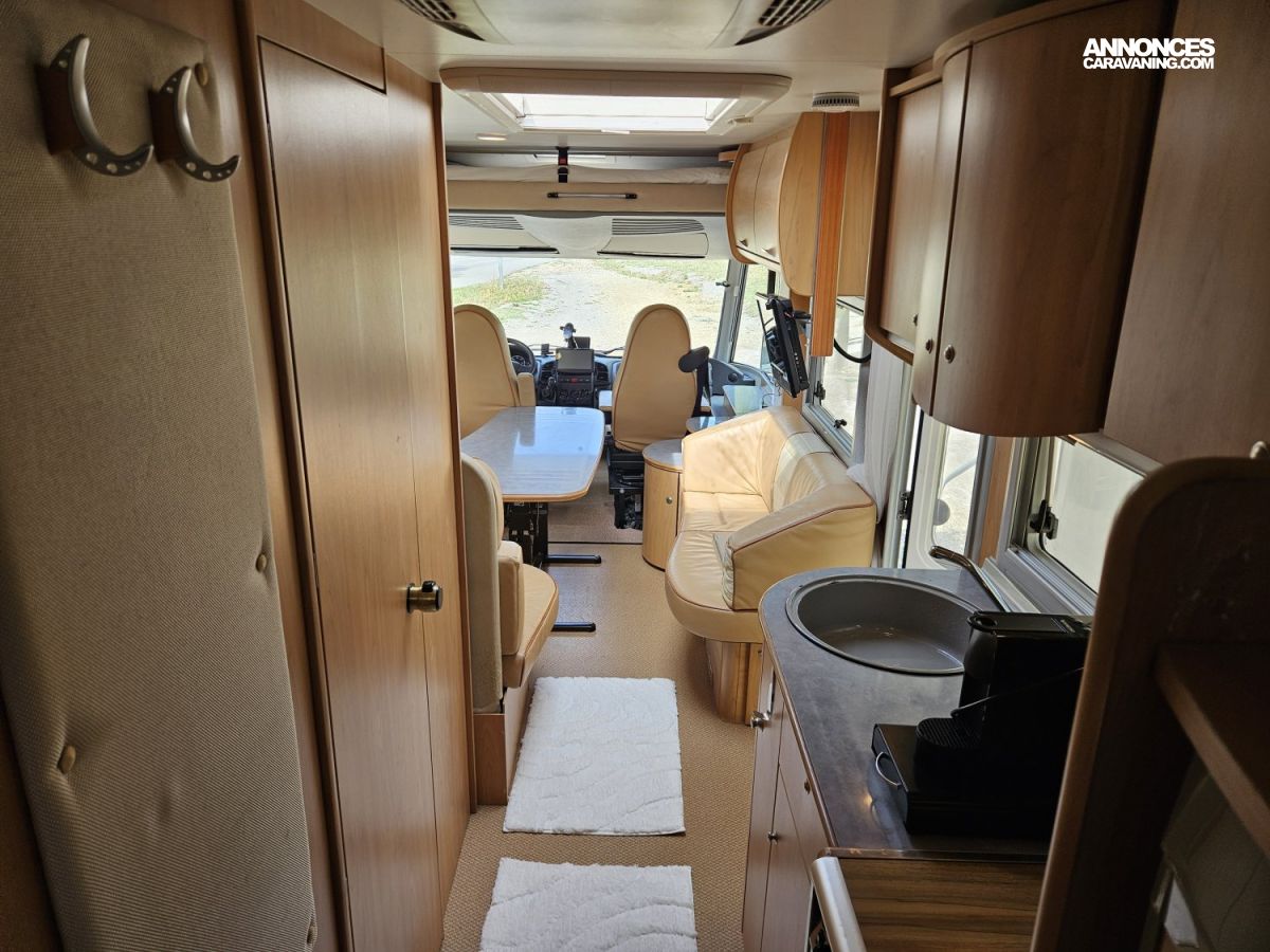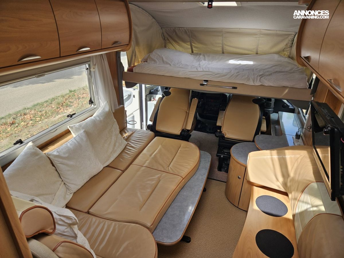 L'intérieur est spacieux et confortable. Il dispose d'un salon en U avec une sellerie en cuir. Les couchages se composent d'un lit pavillon et d'un lit transversal sur soute.