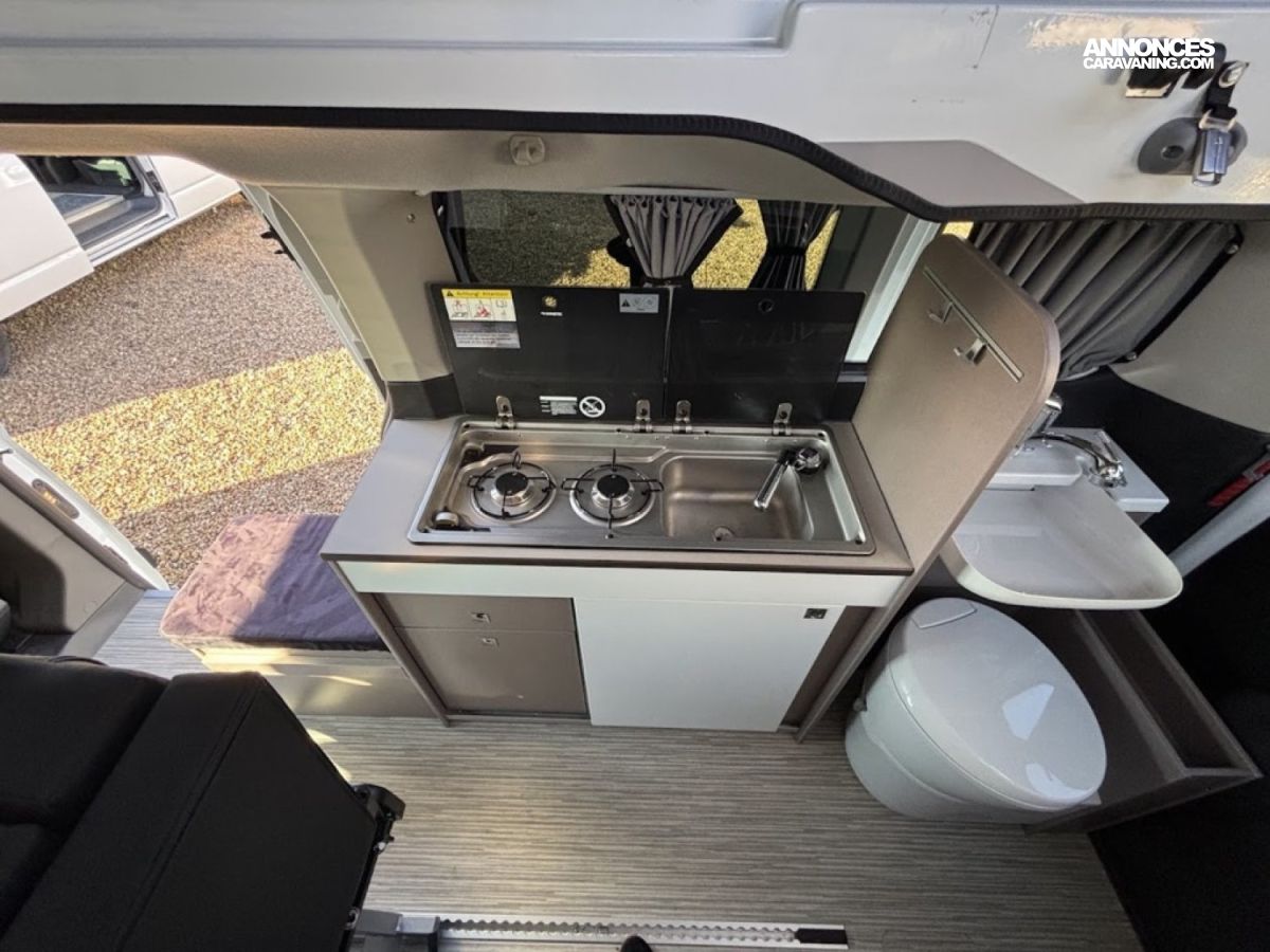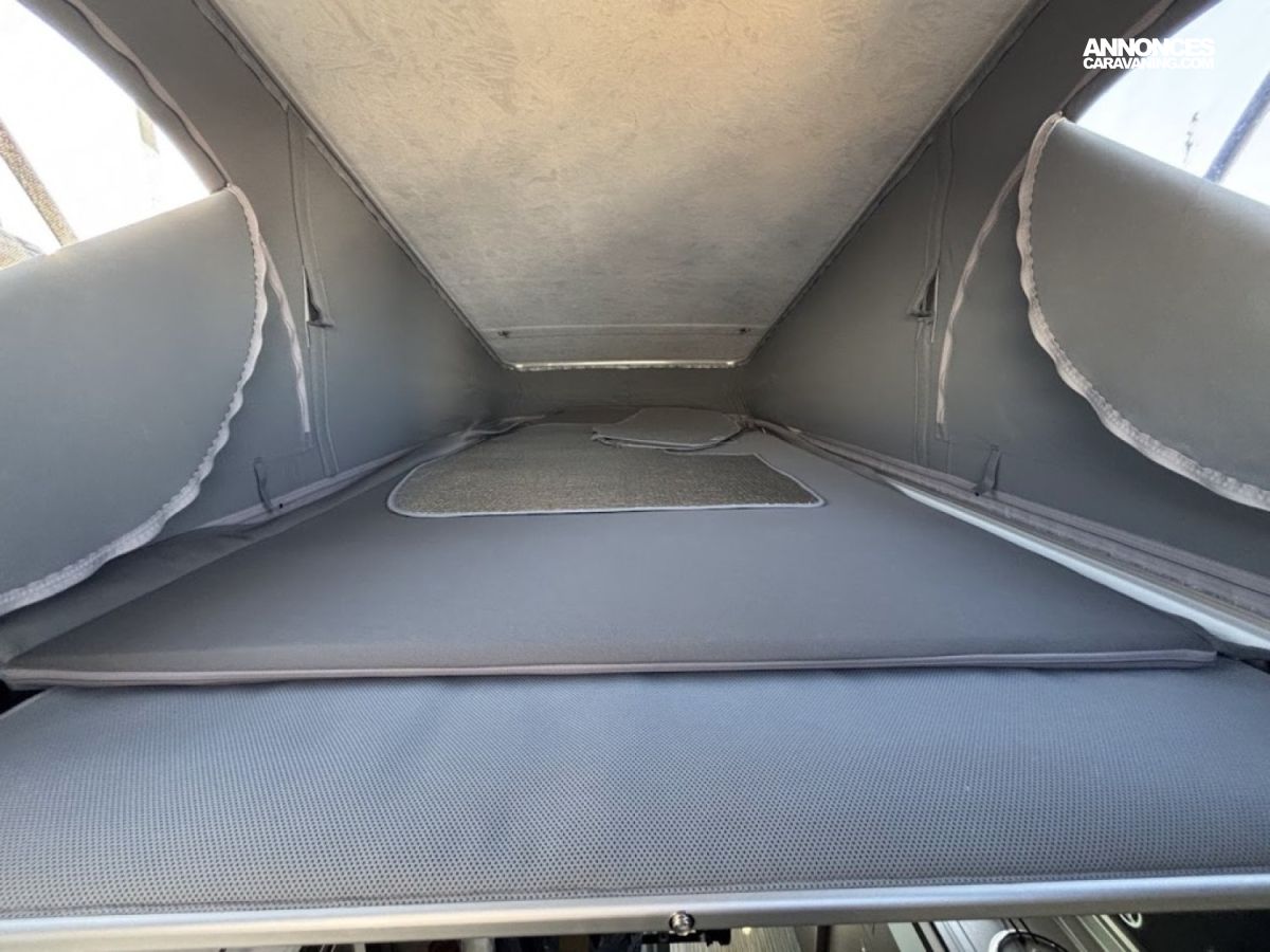 Bac de douche, Cuisine en long, Lit dînette avant, Lit toit relevable, Salon avant sièges pivotants, WC Cassette.