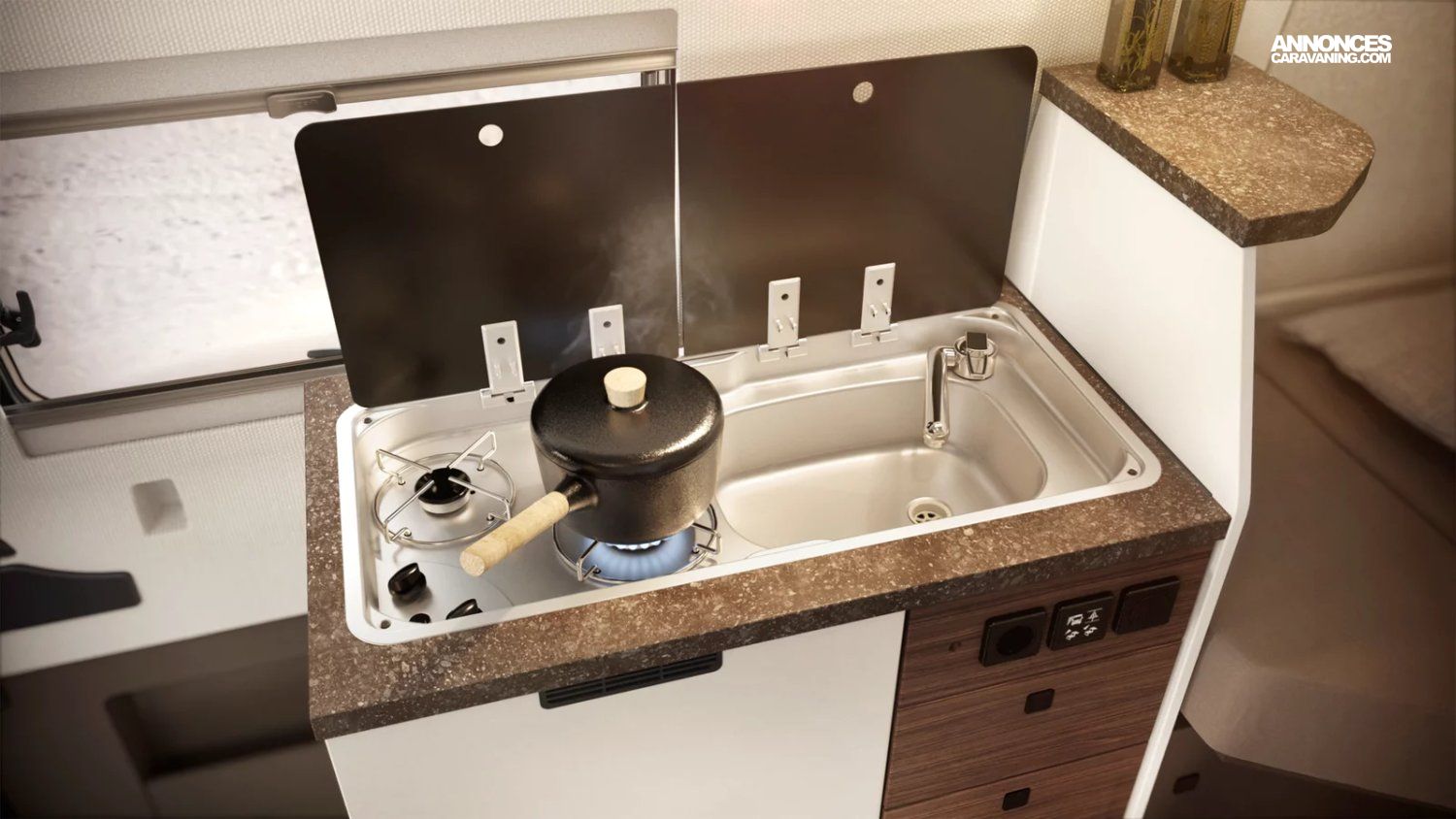 Pack confort cellule : Habillage des parois intérieur en tissu, store plissée cabine, Moustiquaire de porte, extension de plan de travail cuisine, baie à encadrement, batterie Lithium 100 ah, éclairage indirect led : 3 015 €
