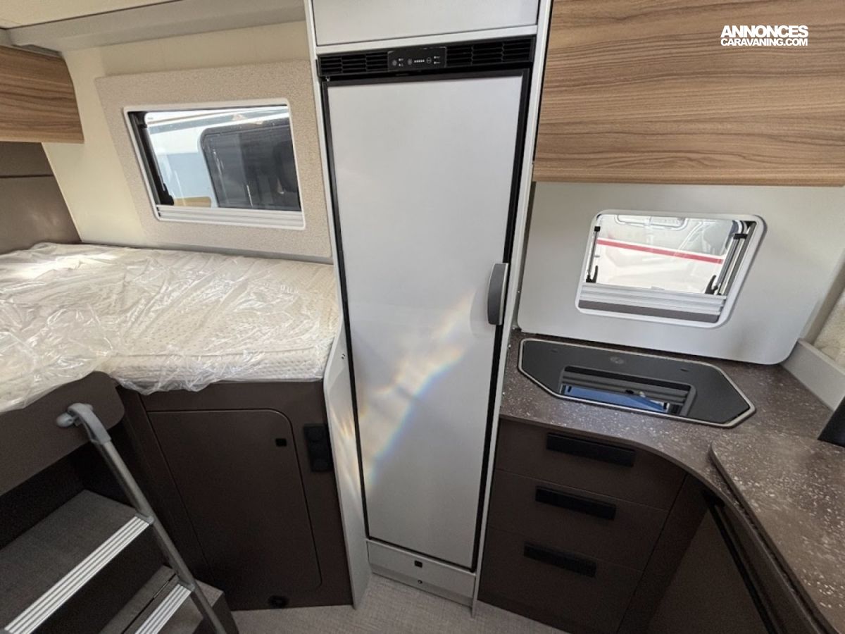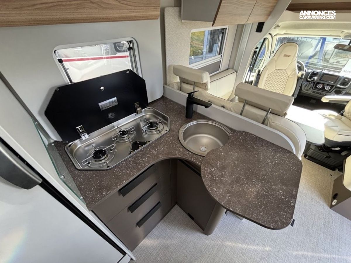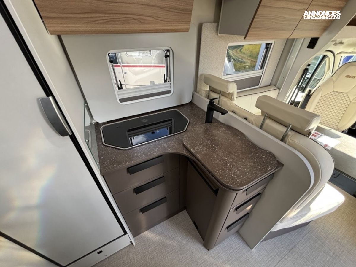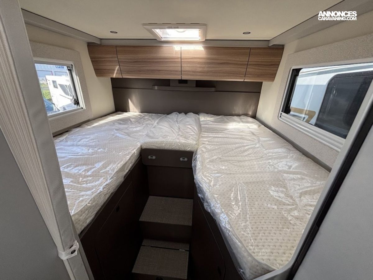 Cuisine en L, Douche à vario, Grande soute, lit jumeaux, lit pavillon, Salon avant sièges pivotants, Salon en L, WC Cassette.