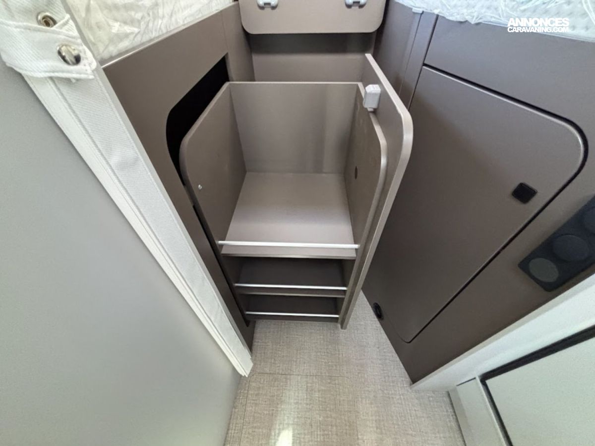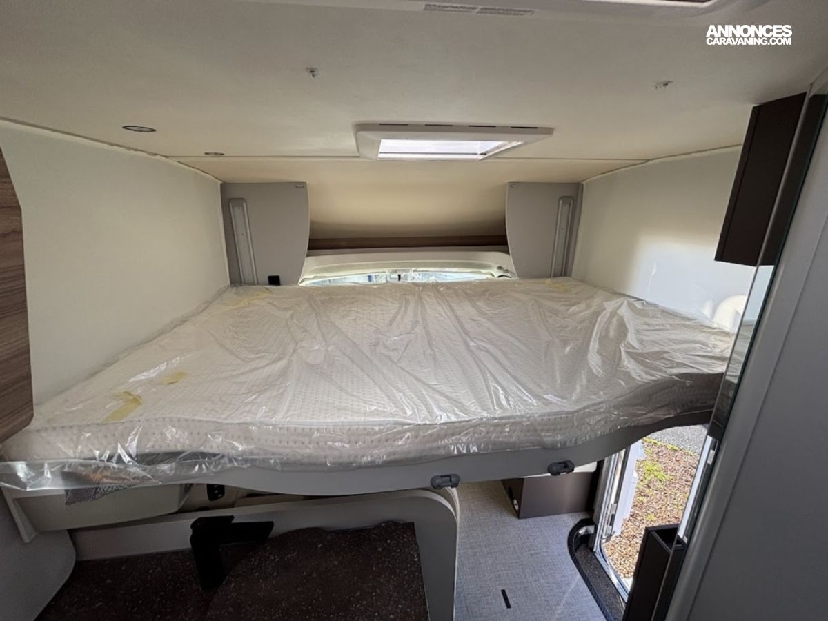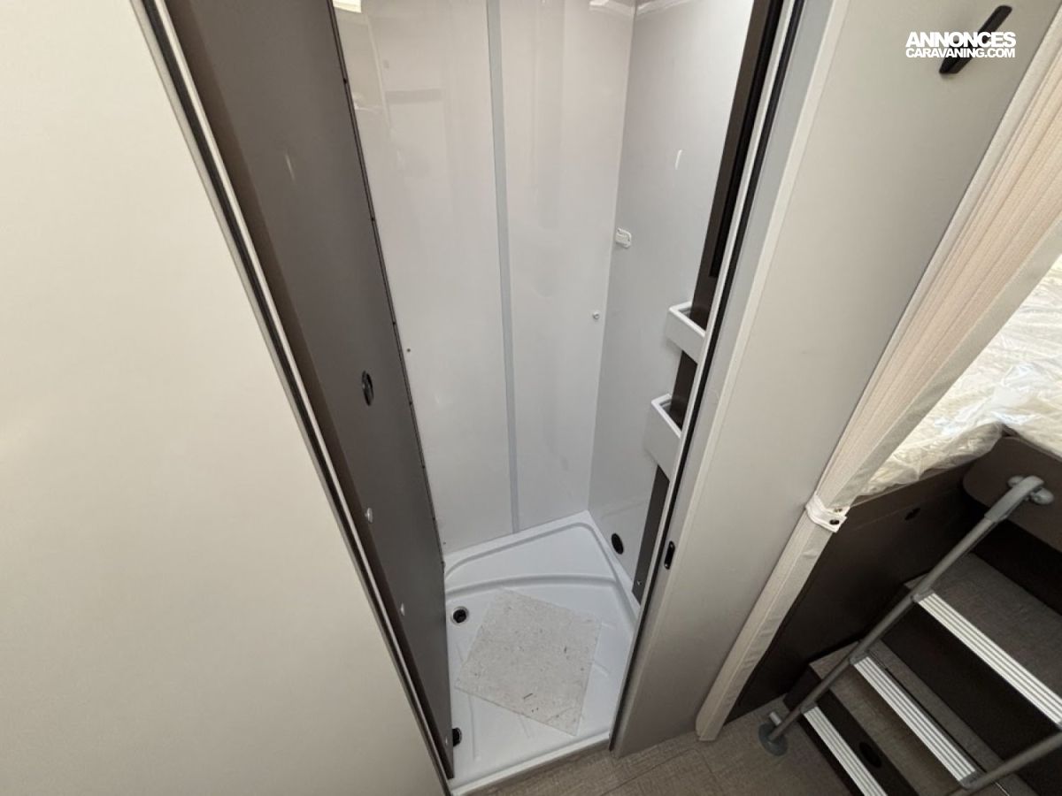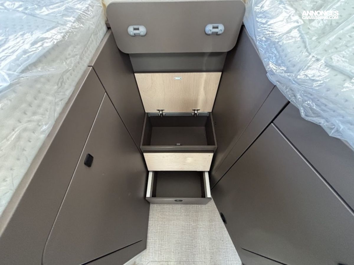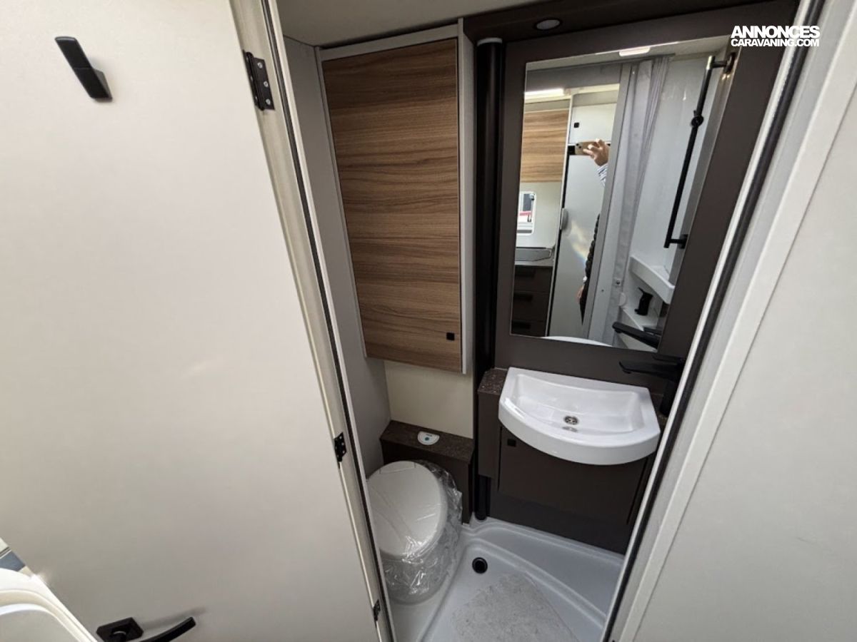 Cuisine en L, Douche à vario, Grande soute, lit jumeaux, lit pavillon, Salon avant sièges pivotants, Salon en L, WC Cassette.
