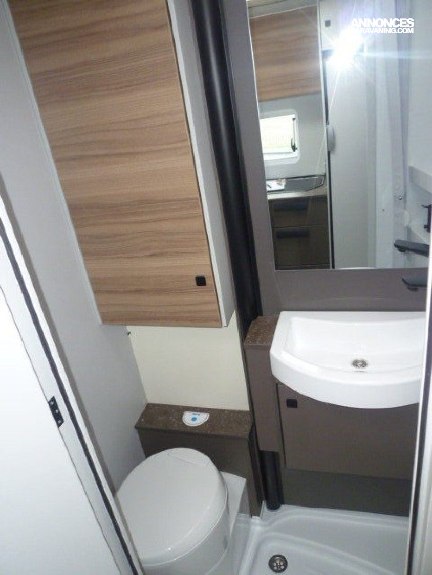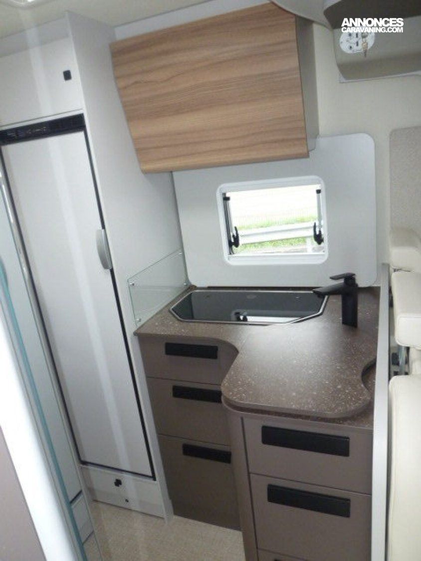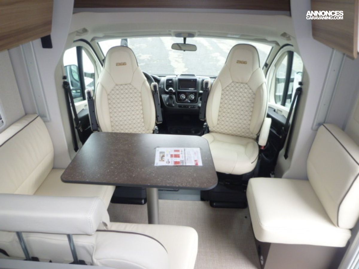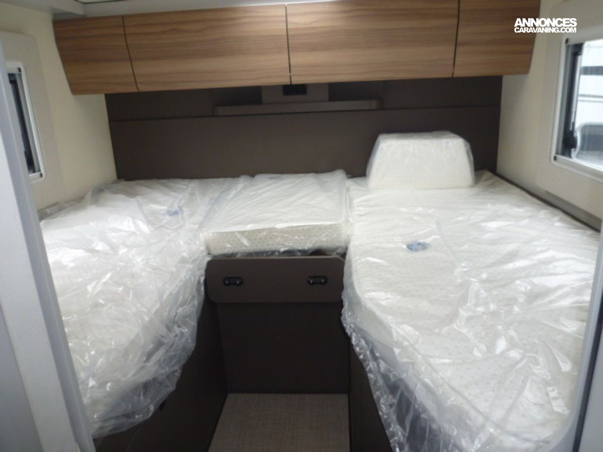 Cuisine en L, Douche à vario, Grande soute, lit jumeaux, lit pavillon, Salon avant sièges pivotants, Salon en L, WC Cassette.