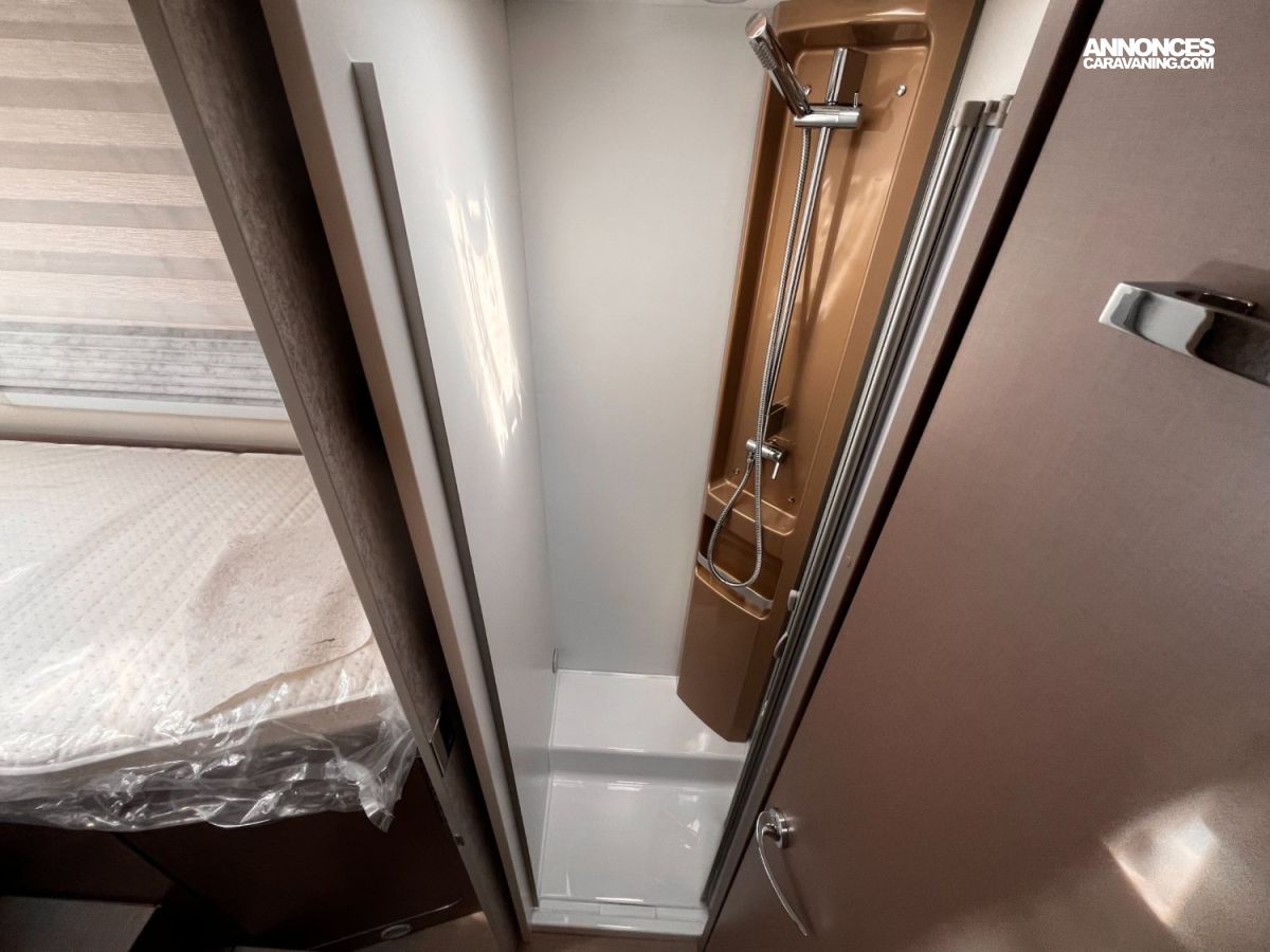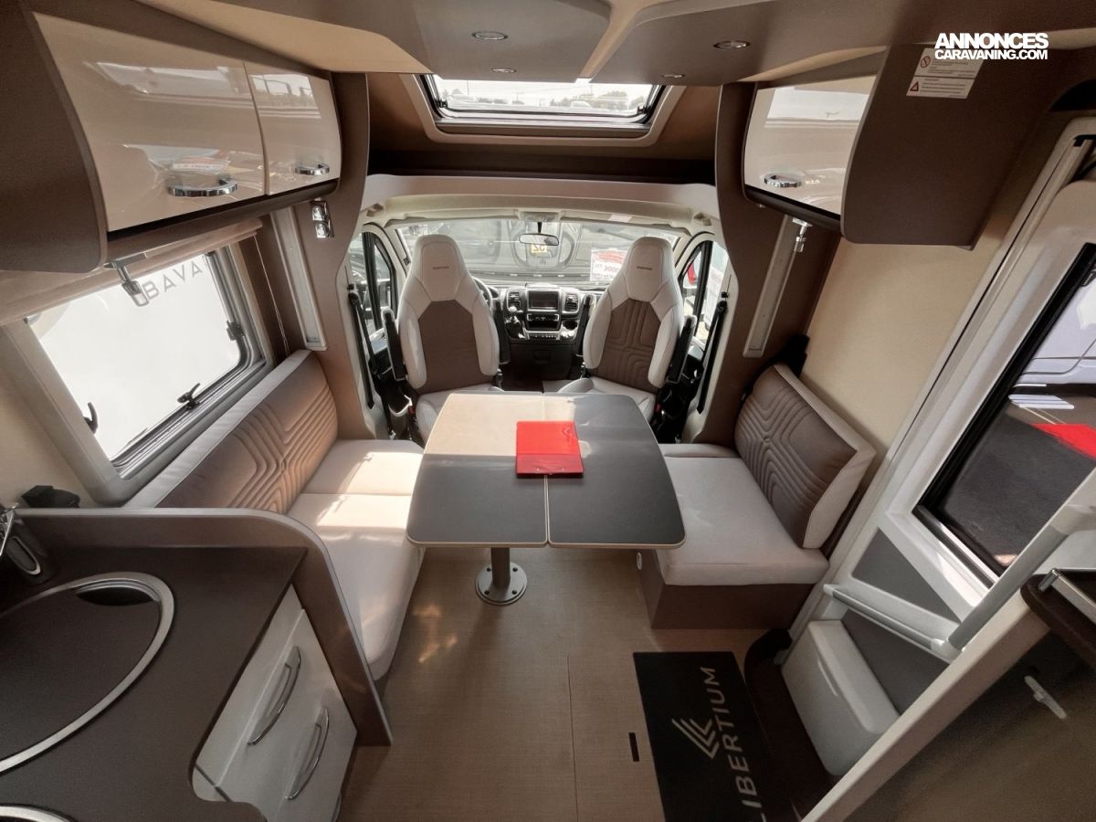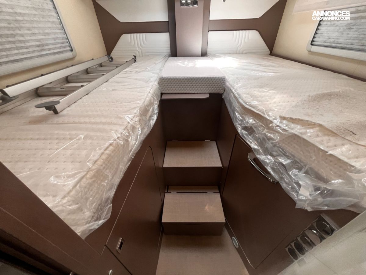 Sièges cabine pivotants, Stores plissés occultants cabine, VOLET ROULANT REMIS, Rétroviseurs électriques et dégivrants, Assistance freinage post-collision, Climatisation manuelle en cabine, Coussin additionnel grand couchage arrière, Lève-vitres électriques et verrouillage centralisé, Plaque de cuisson 3 feux, Régulateur de vitesse, Réservoir diesel 75 litres, SKYROOF, PORTE GARAGE SUPL. GAUCHE, Double plancher technique isolé et chauffé - Thermofloor, ABS (système antiblocage des roues), Grandes trappes de rangement intégrées dans le double planch, ASR (Système anti-patinage), Dimension lit jumeau 205*155+205*135, ESP (Contrôle électronique de trajectoire)