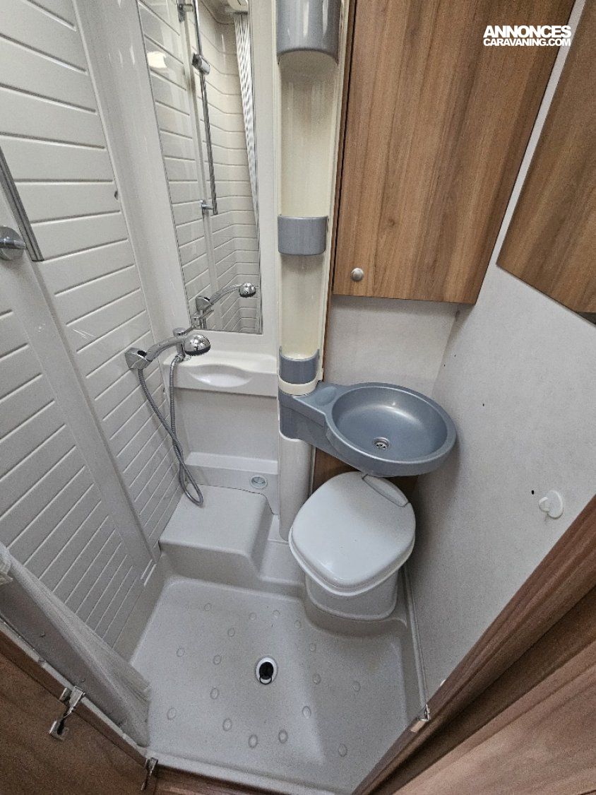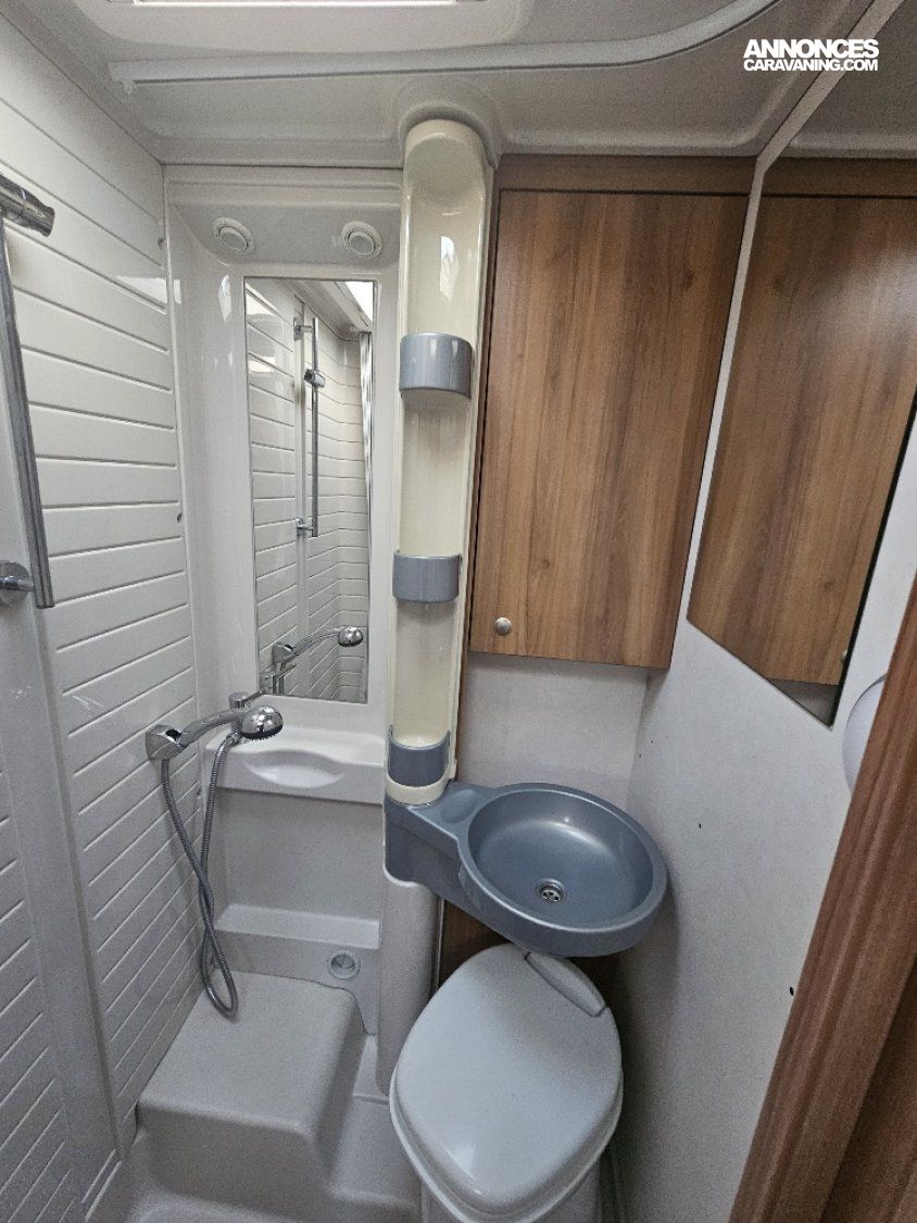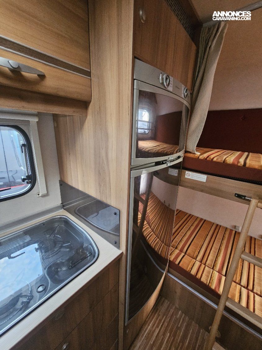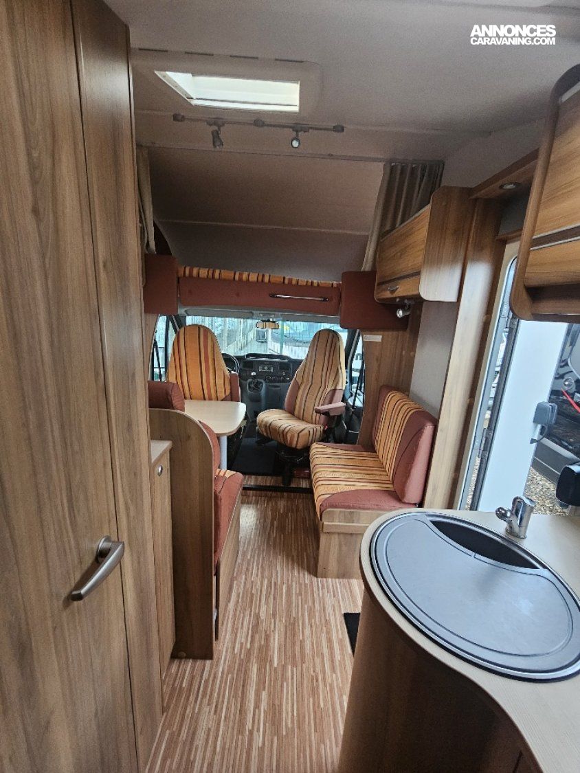 Capucine familiale comprenant des lits superposés à l’arrière, une salle d’eau avec douche et WC, une cuisine avec de nombreux rangements, un salon avant panoramique et un grand couchage 2 personnes au-dessus de la cabine.